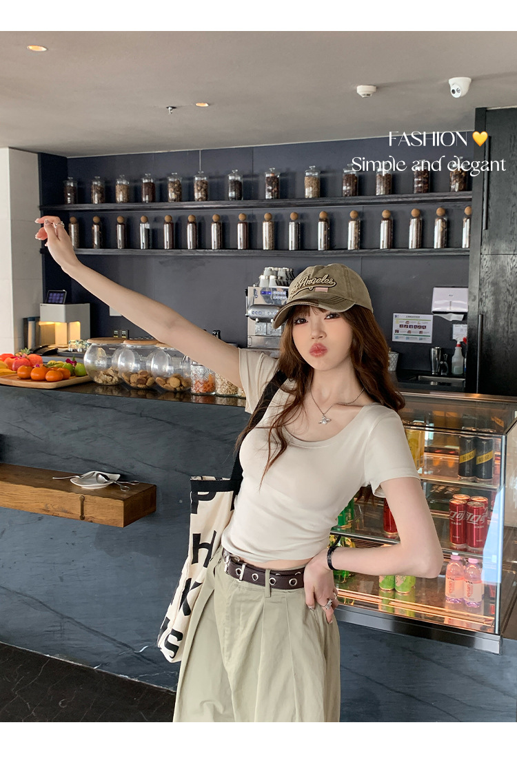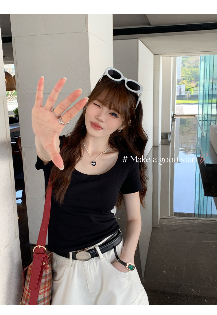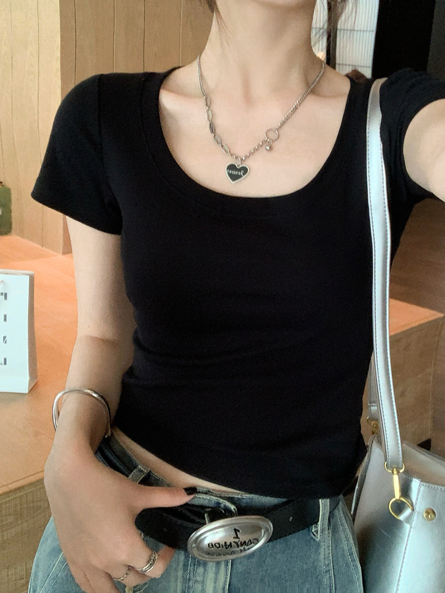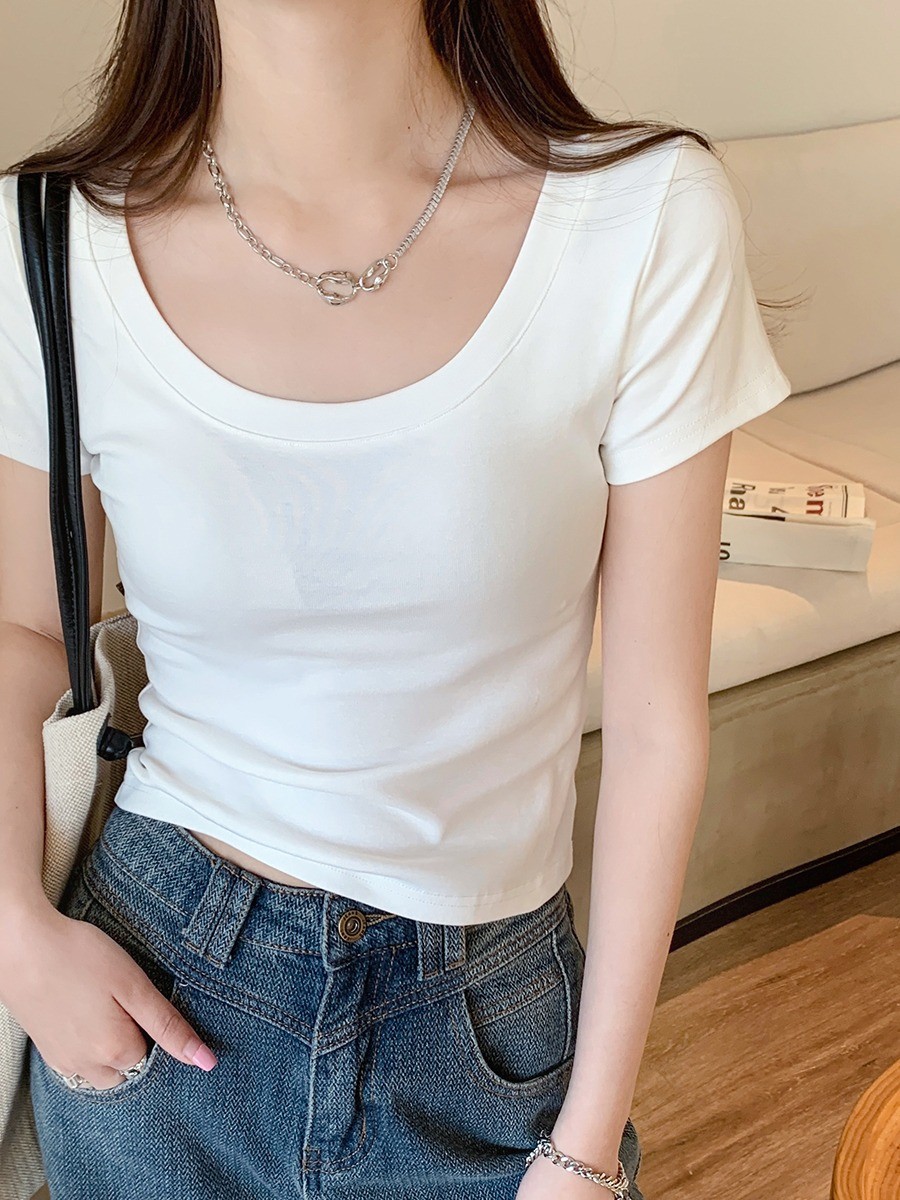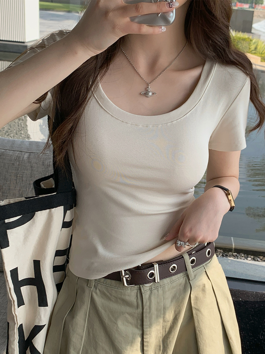 여성 반팔 어깨 티셔츠 여름 2025 뉴 블루 도파민웨어 슬림 핏 U 칼라 화이트 쇼트 탑 트렌디