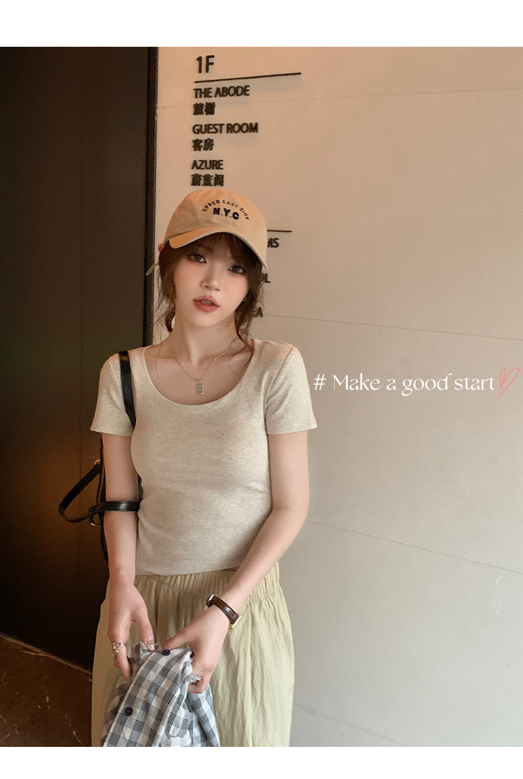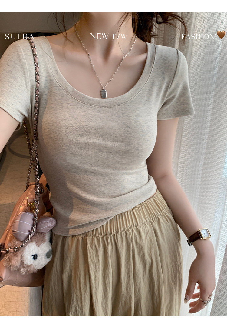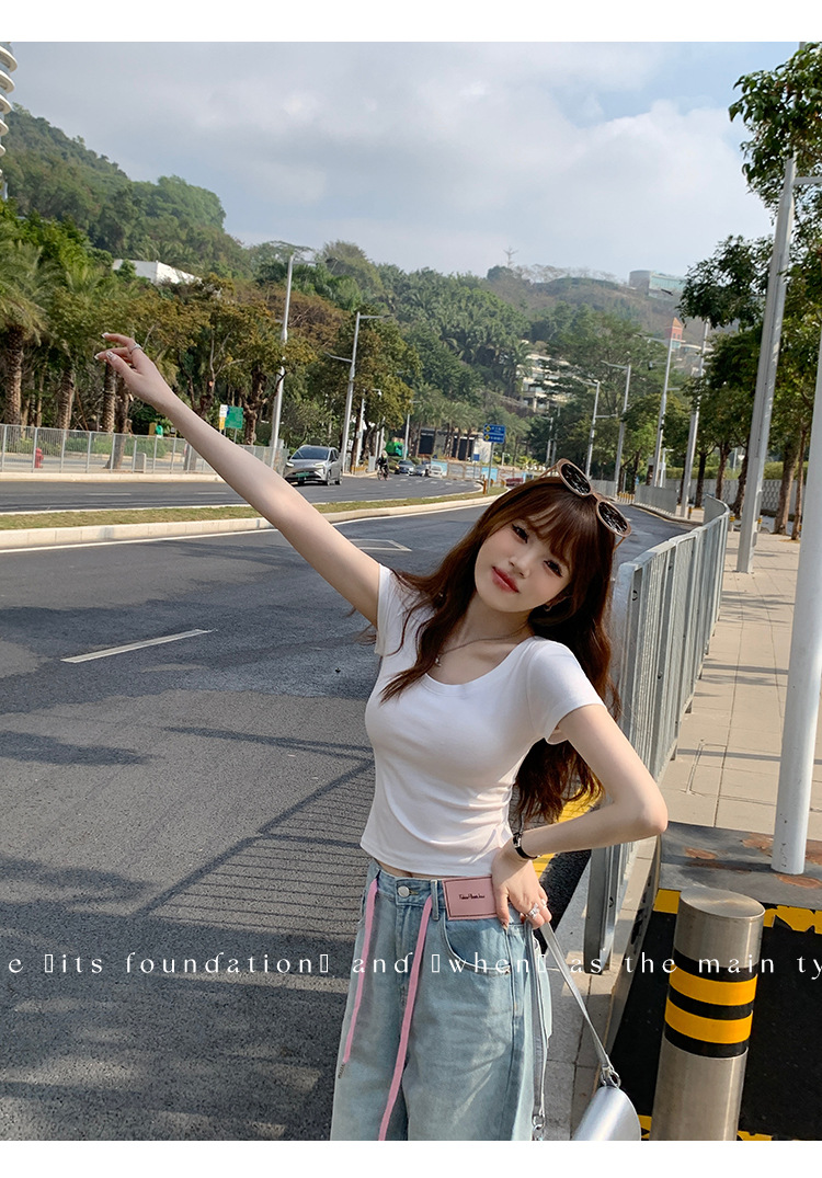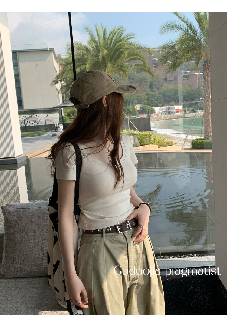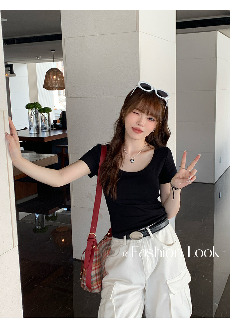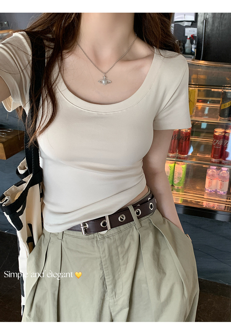 여성 반팔 어깨 티셔츠 여름 2025 뉴 블루 도파민웨어 슬림 핏 U 칼라 화이트 쇼트 탑 트렌디