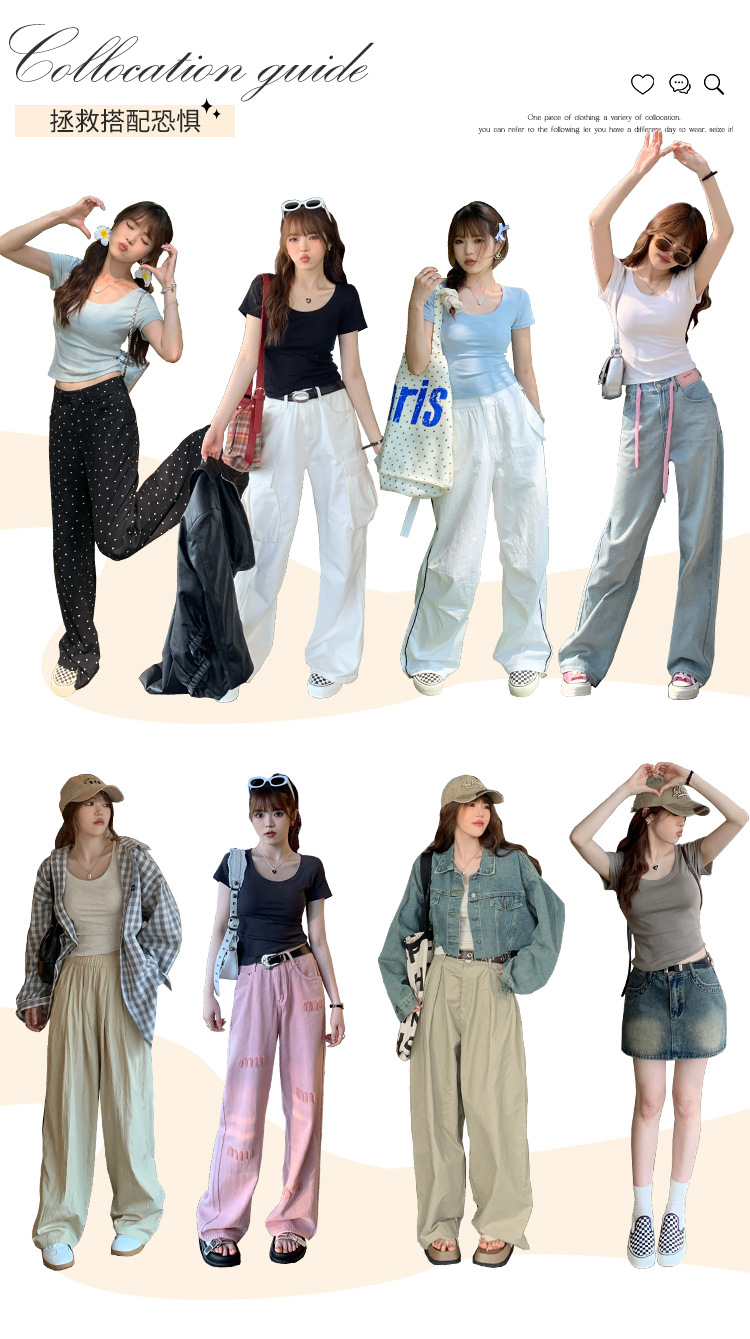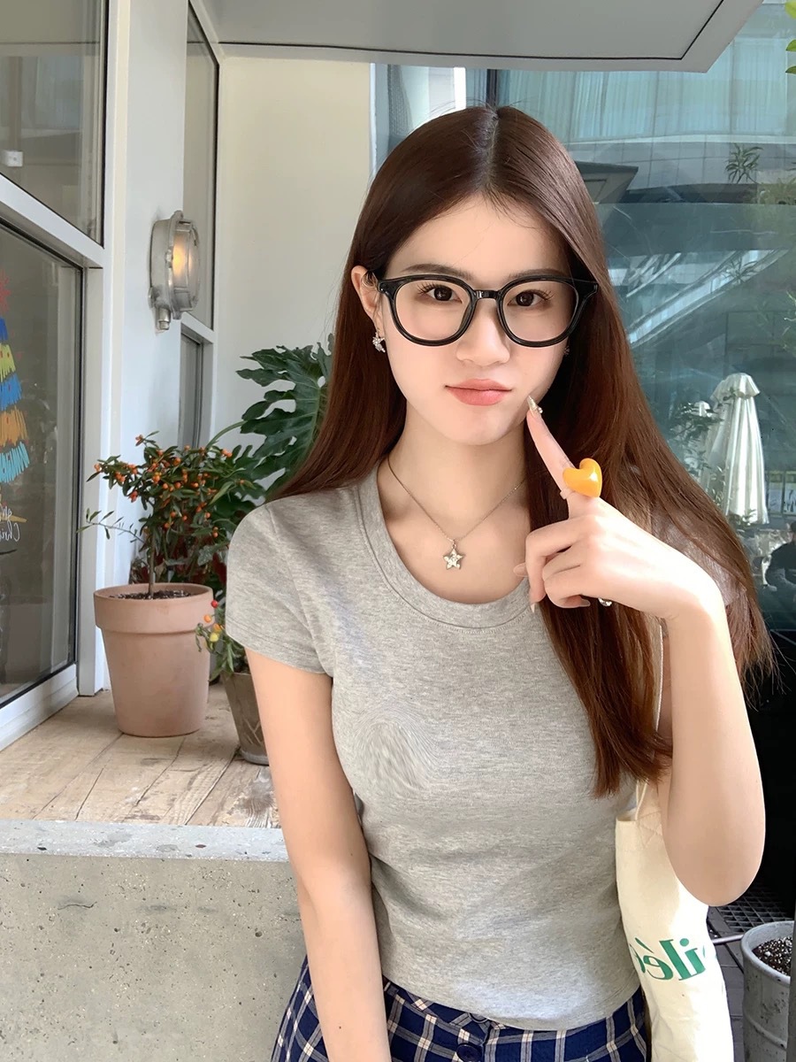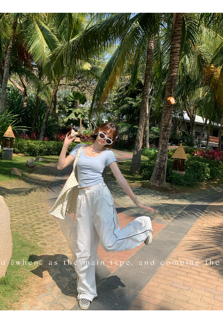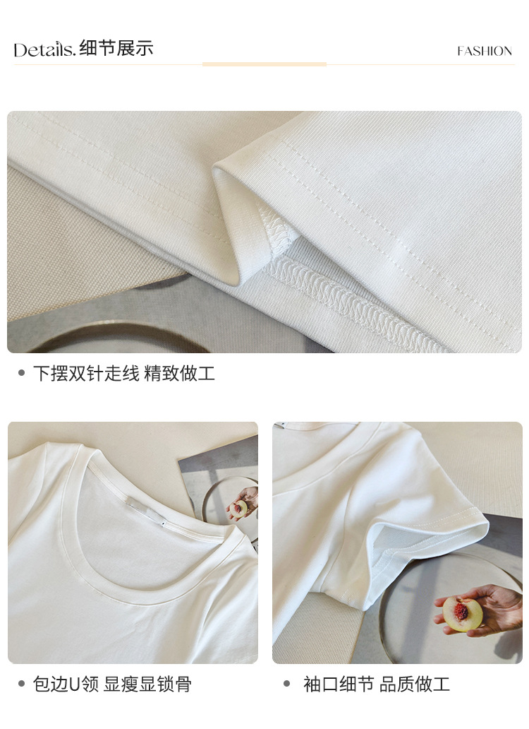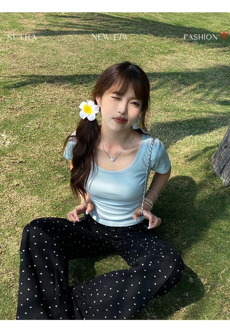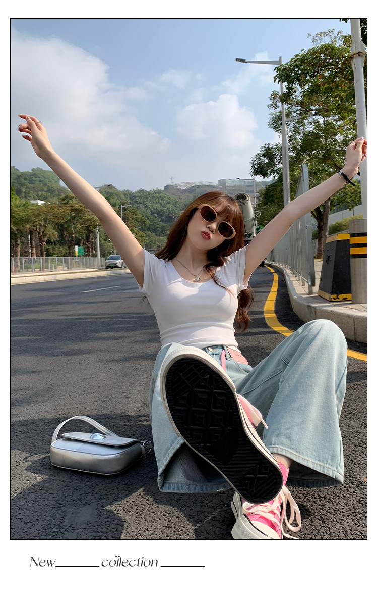여성 반팔 어깨 티셔츠 여름 2025 뉴 블루 도파민웨어 슬림 핏 U 칼라 화이트 쇼트 탑 트렌디