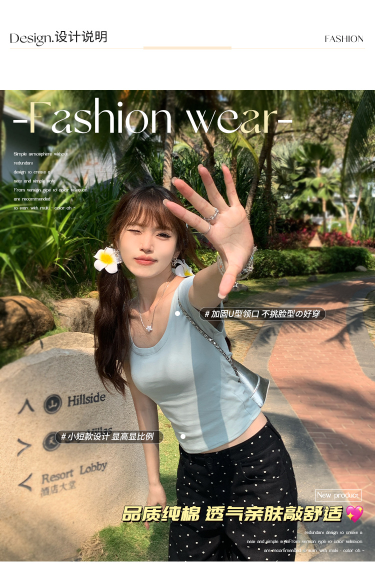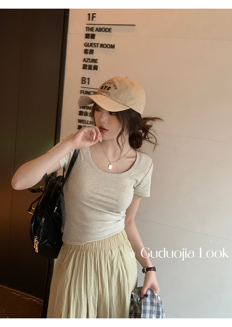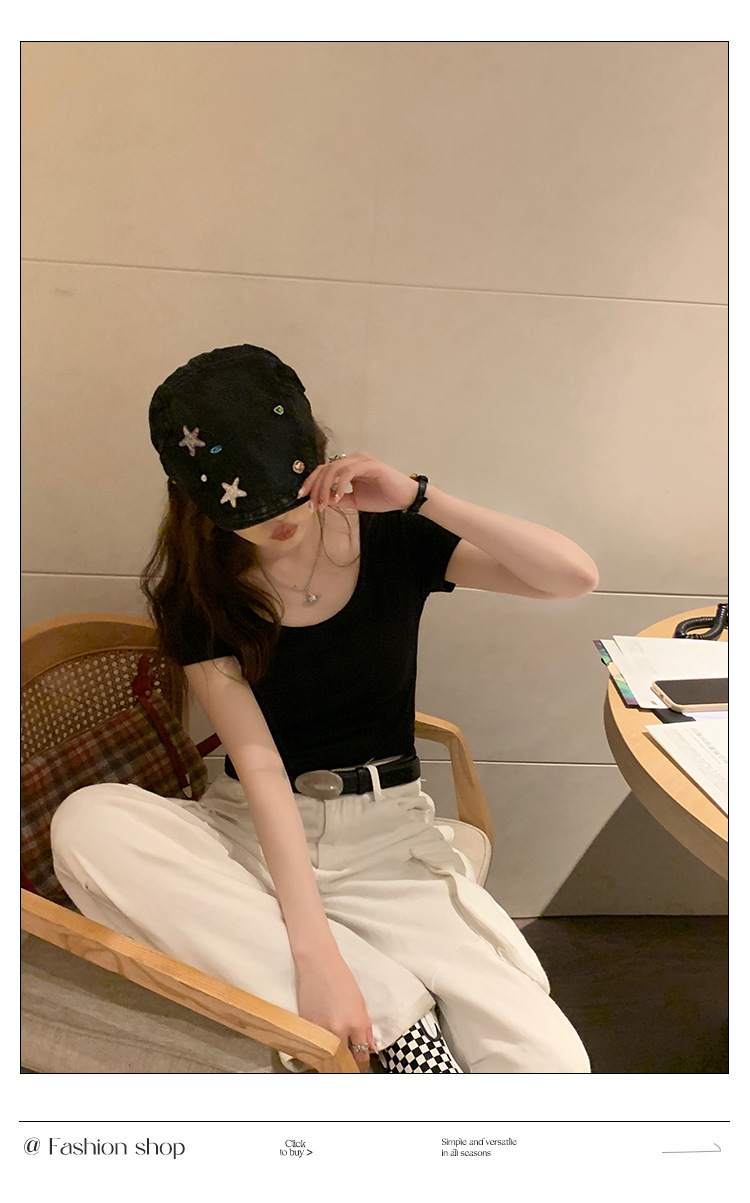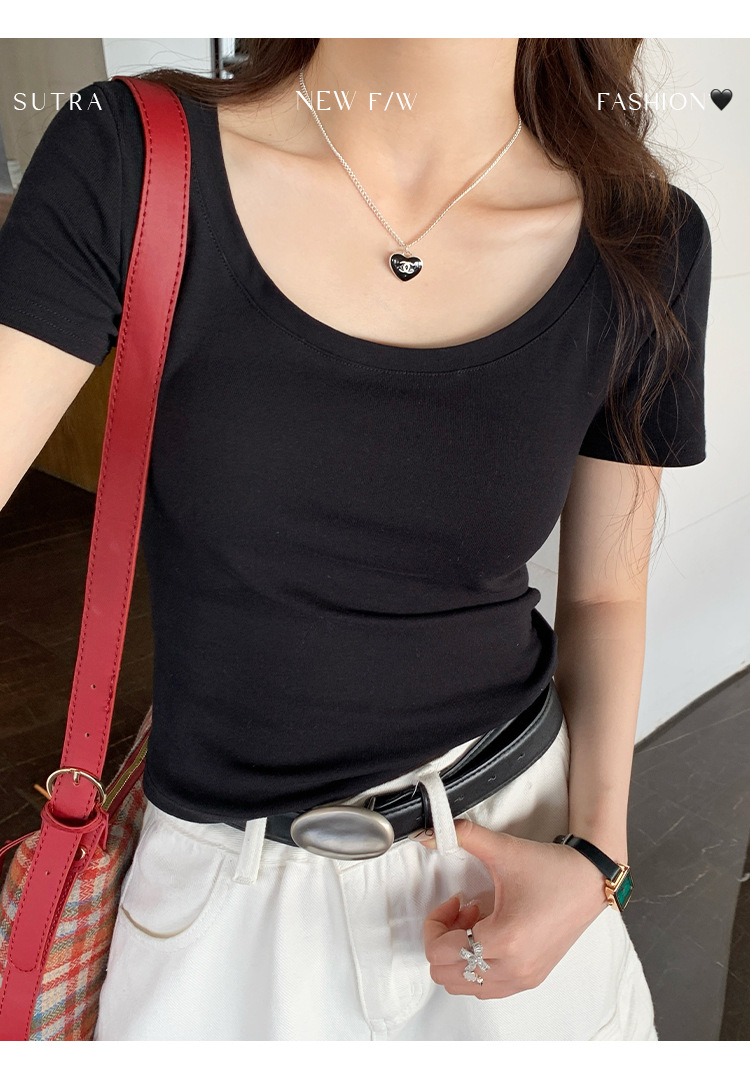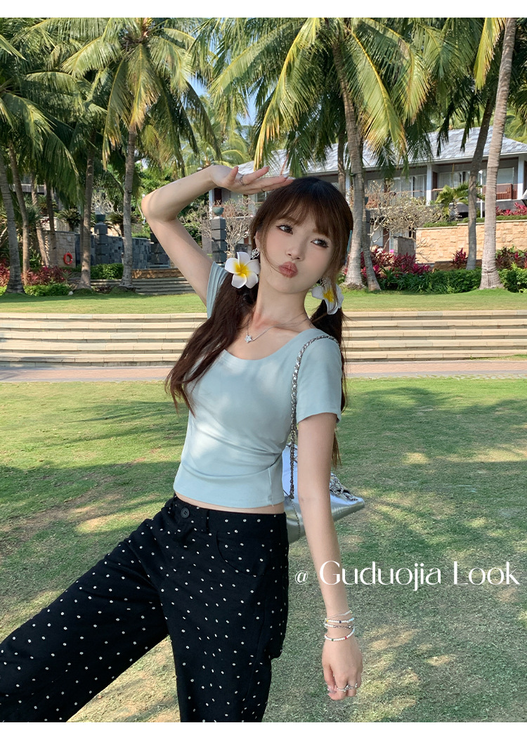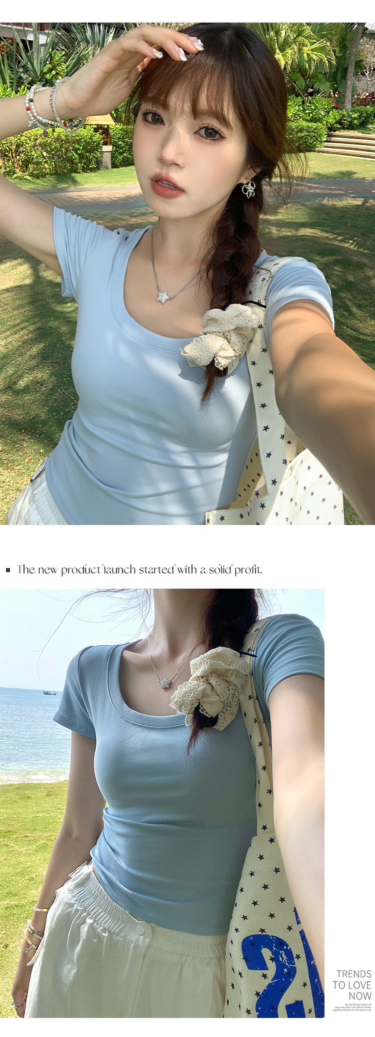 여성 반팔 어깨 티셔츠 여름 2025 뉴 블루 도파민웨어 슬림 핏 U 칼라 화이트 쇼트 탑 트렌디스토어 가기