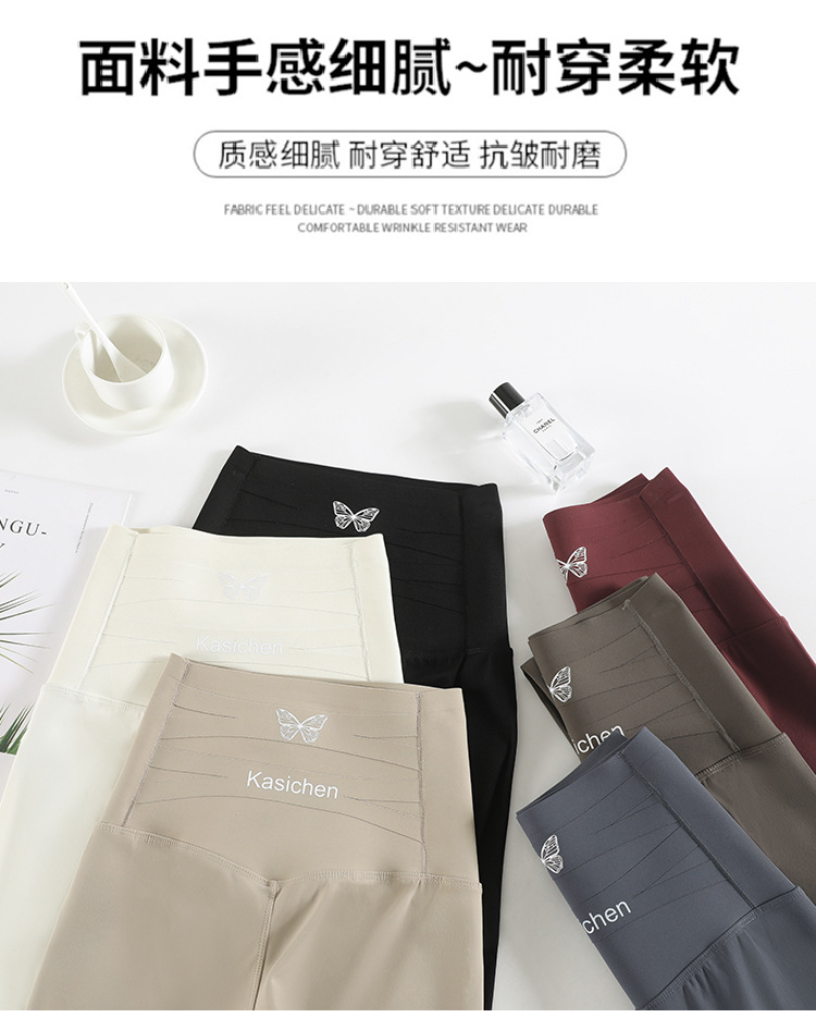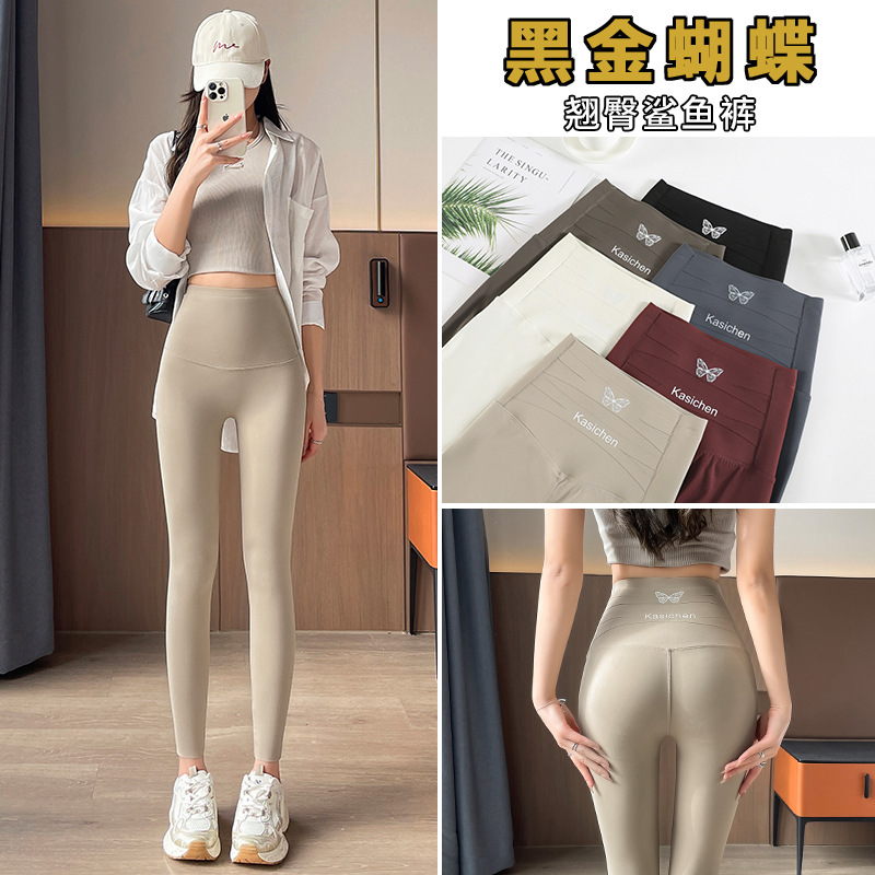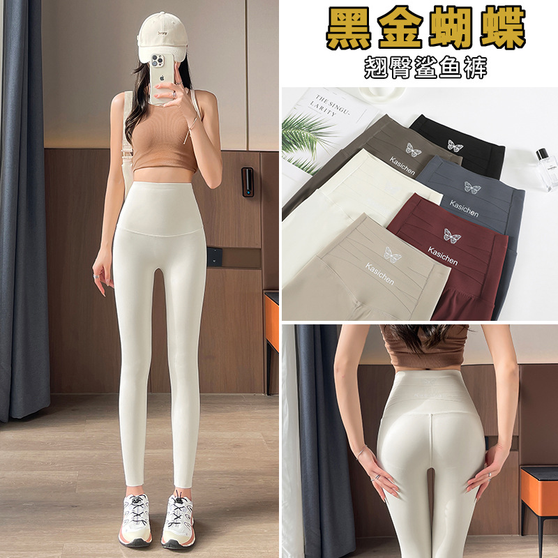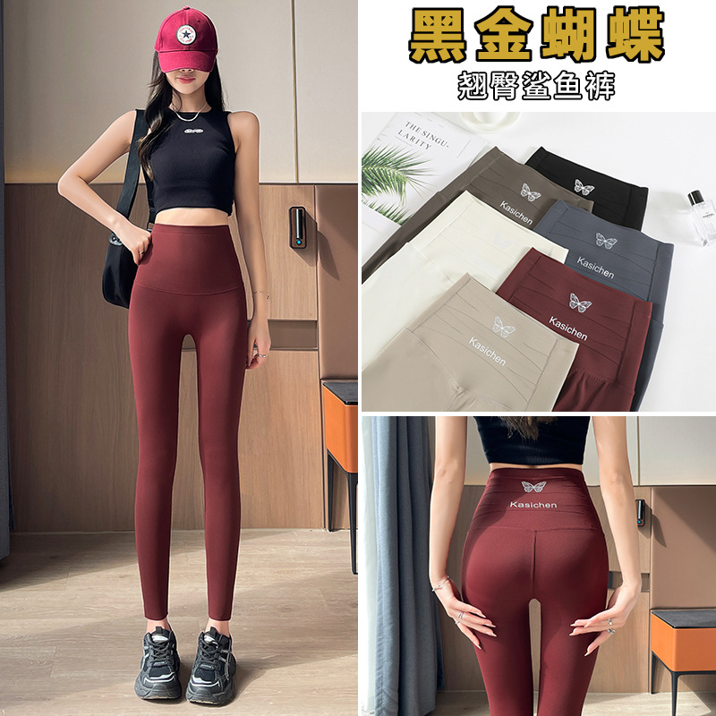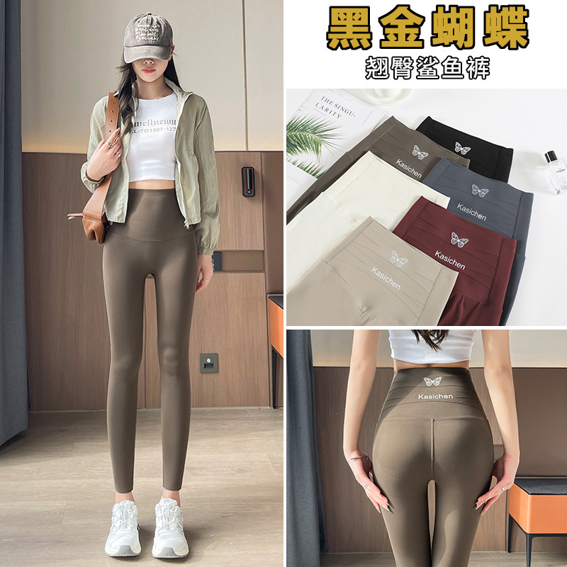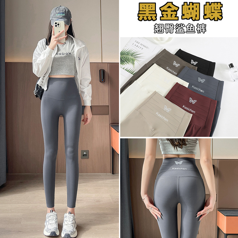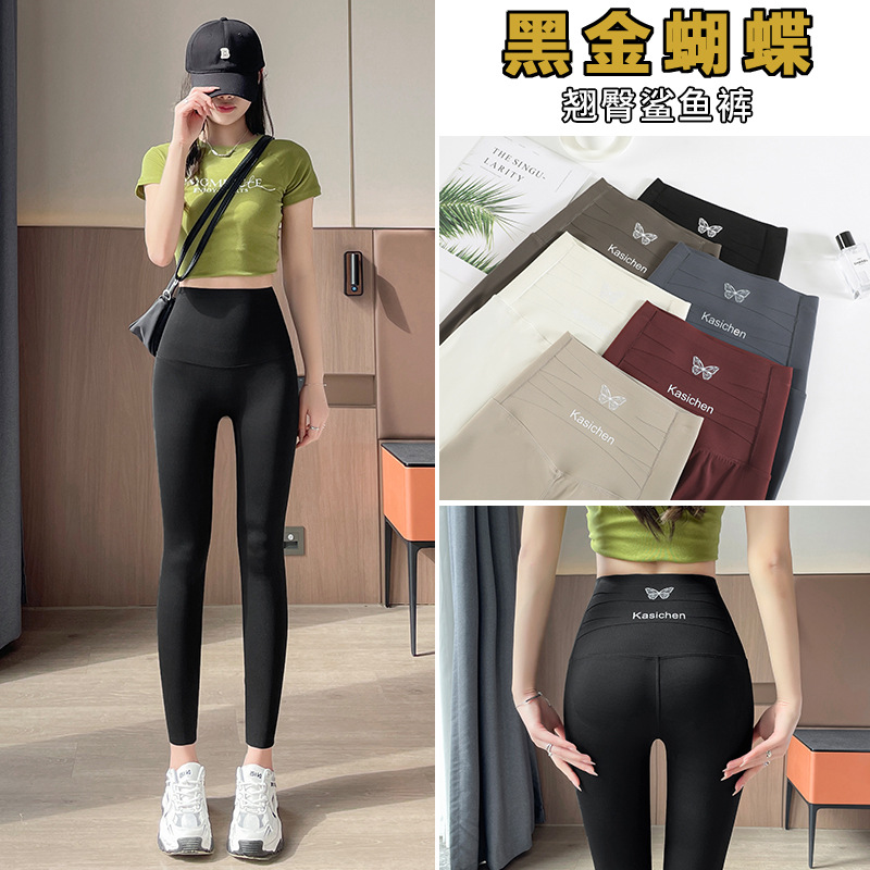 블랙 골드 버터플라이 샤크 팬츠 여성용 봄 가을 신상 더블 크로스 허리 레깅스 타이트 하이웨이스트 뱃살 보정 요가 쉐이핑 팬츠