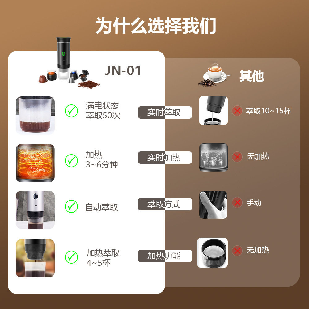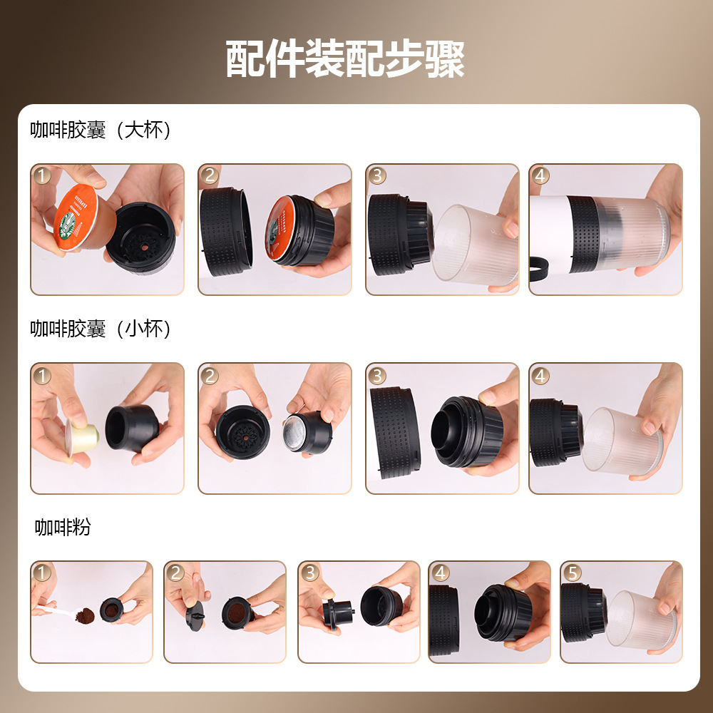 产品包装:咖啡机+彩盒+杯刷+量勺+说明书+充电线