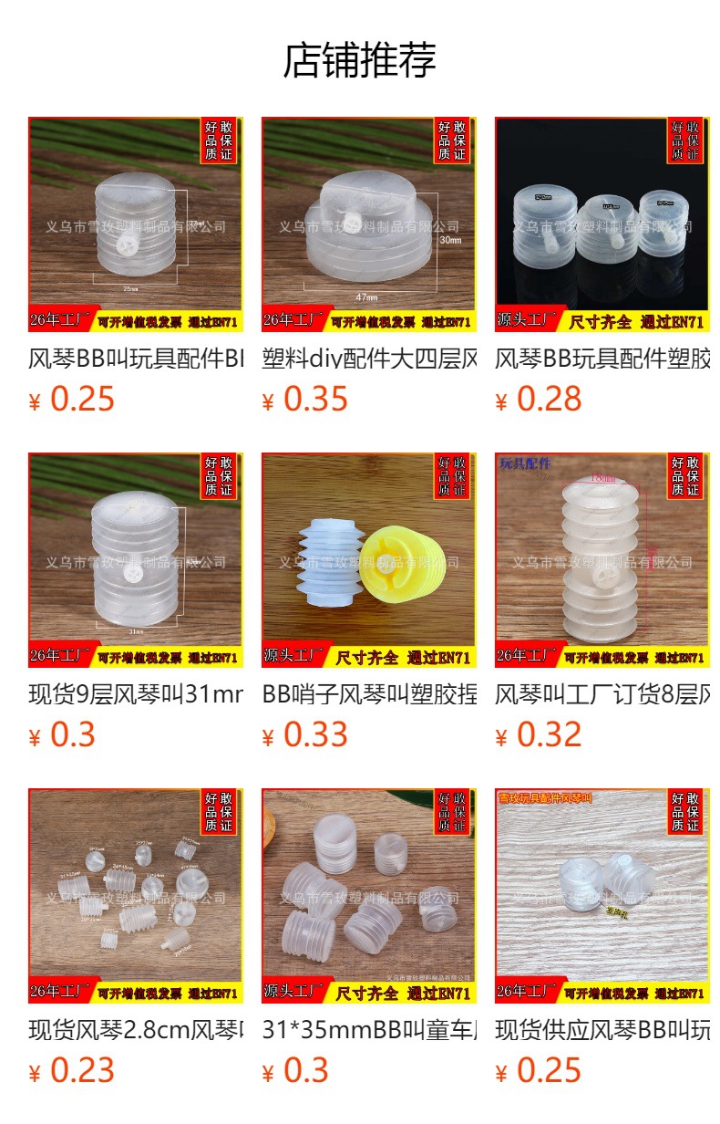 注意:样品和少量,下单不支持退换介意勿拍,成本比较高理解万岁!定制产品没有质量问题不支持退换货,本店产品不支持无理理由退换货,谢谢理解万岁.备注:手工测量有误差+-0.02mm,样品和少量下单都是亏本的不支持退换货,人工成本高等等,定制产品没有质量问题不退换.理解万岁!专业生产玩具配件发声器,二十多年承接各种注塑吹塑产品等等阿里线下实力验厂,24小时在线欢迎新老顾客前来验厂详谈,您的满意是我们的追求!