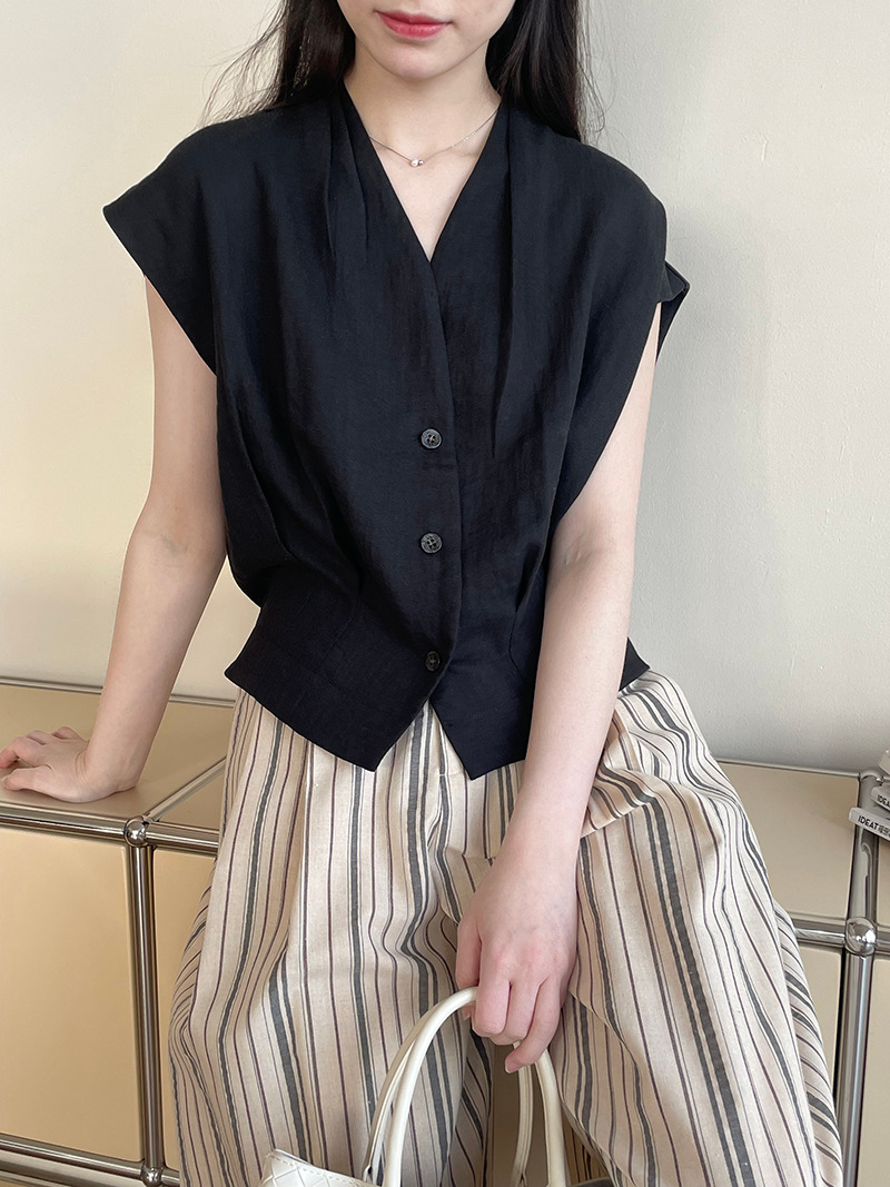 아오카와 디자인 V-넥 주름 작은 플라이 슬리브 탑 여성 하이 엔드 웨어 어깨 민소매 셔츠 2703스토어 가기