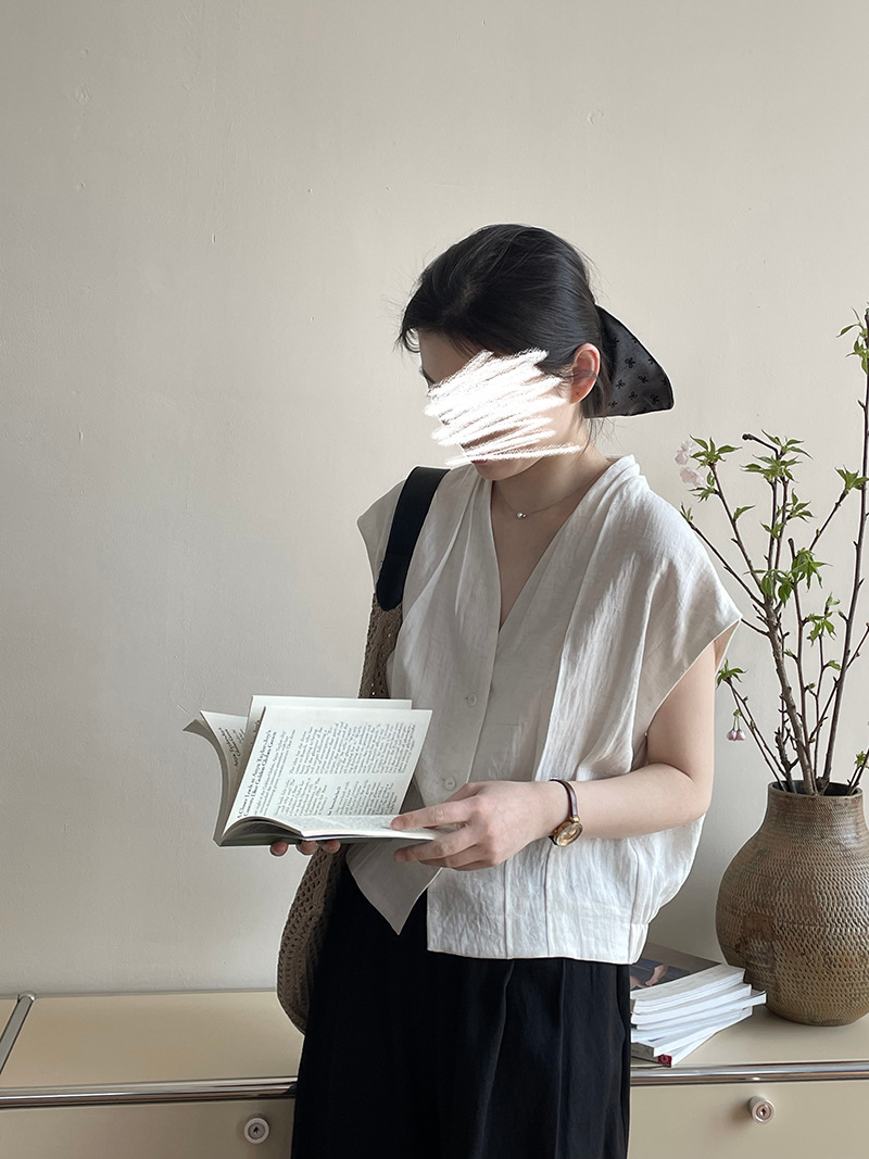 아오카와 디자인 V-넥 주름 작은 플라이 슬리브 탑 여성 하이 엔드 웨어 어깨 민소매 셔츠 2703