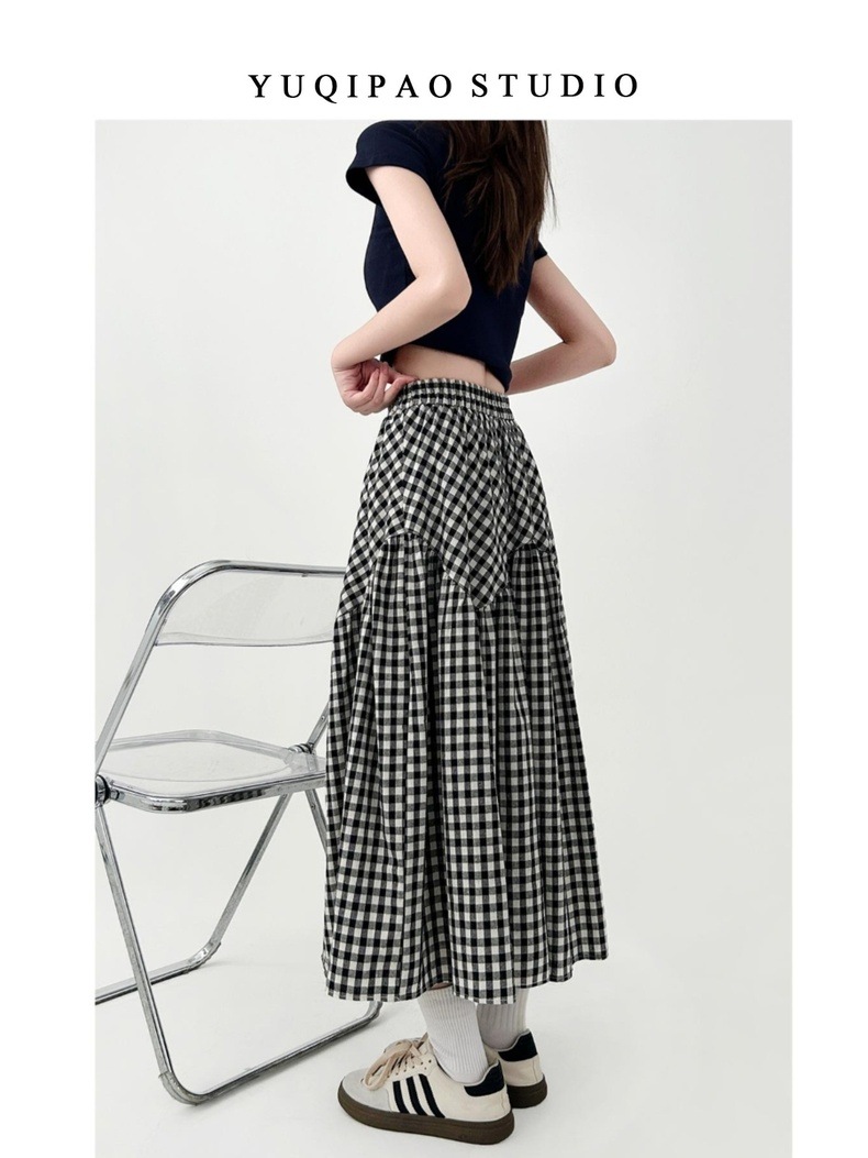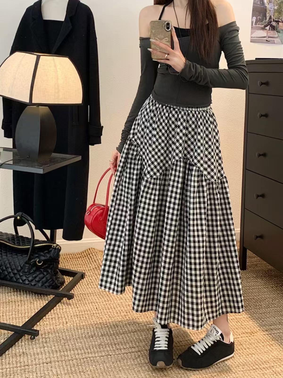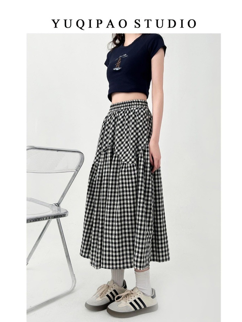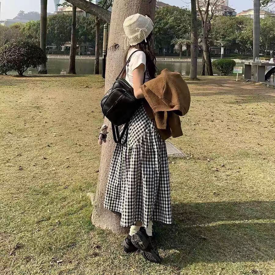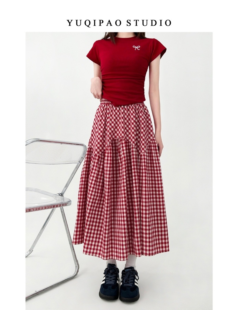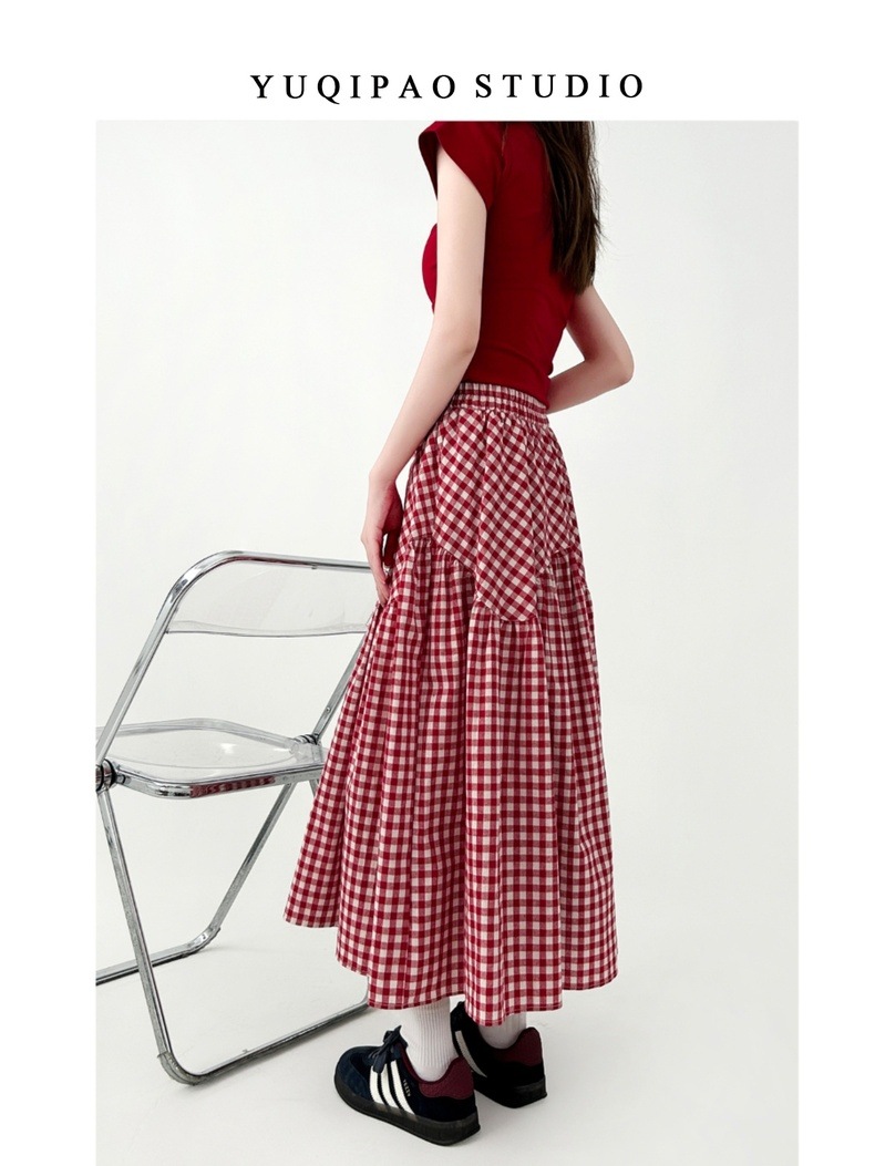 리얼 샷 레드 체크 무늬 스커트 여성 스티칭 우산 스커트 얇은 중간 길이 스커트 학업 스타일 롱 스커트 A-라인 스커트