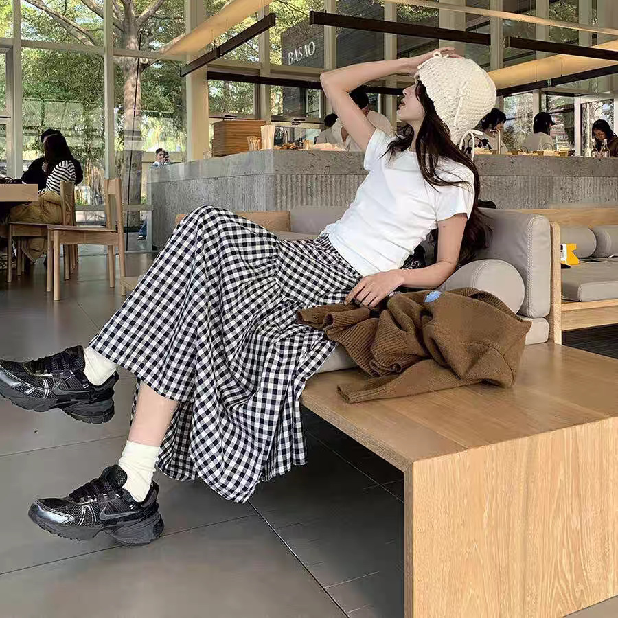 리얼 샷 레드 체크 무늬 스커트 여성 스티칭 우산 스커트 얇은 중간 길이 스커트 학업 스타일 롱 스커트 A-라인 스커트스토어 가기