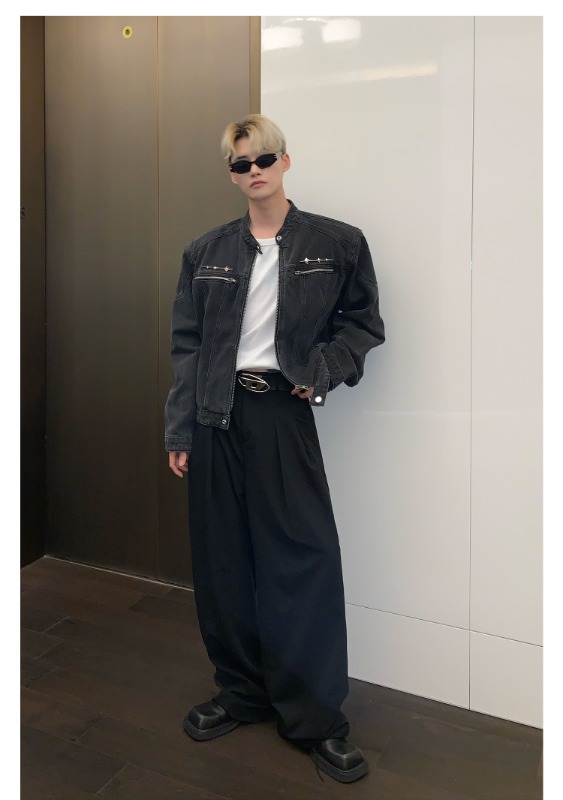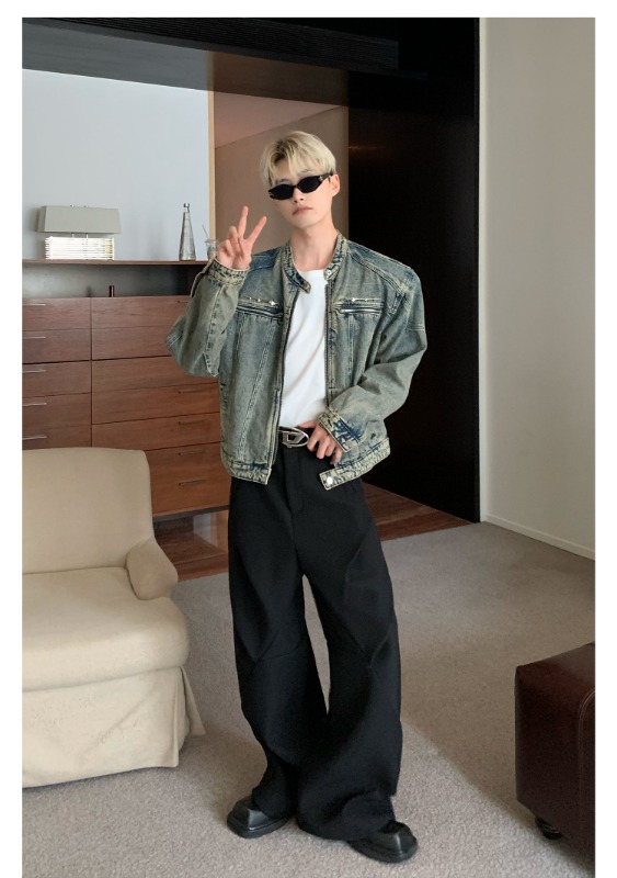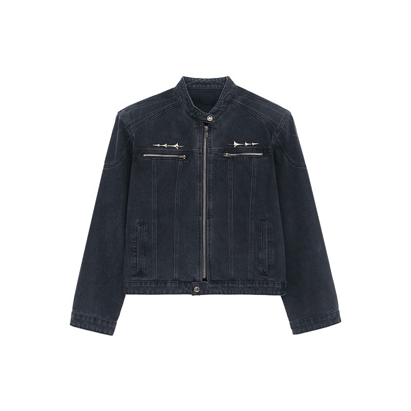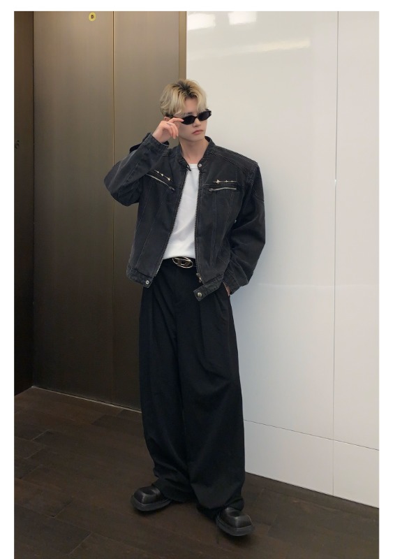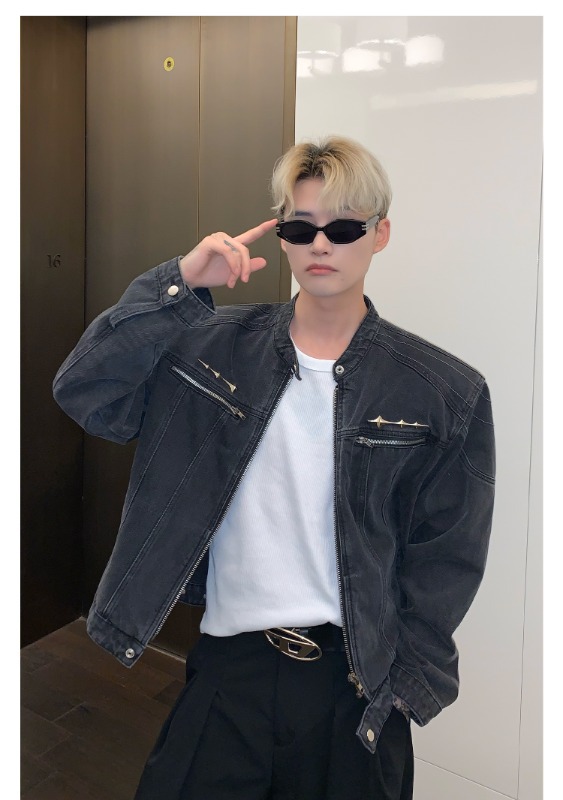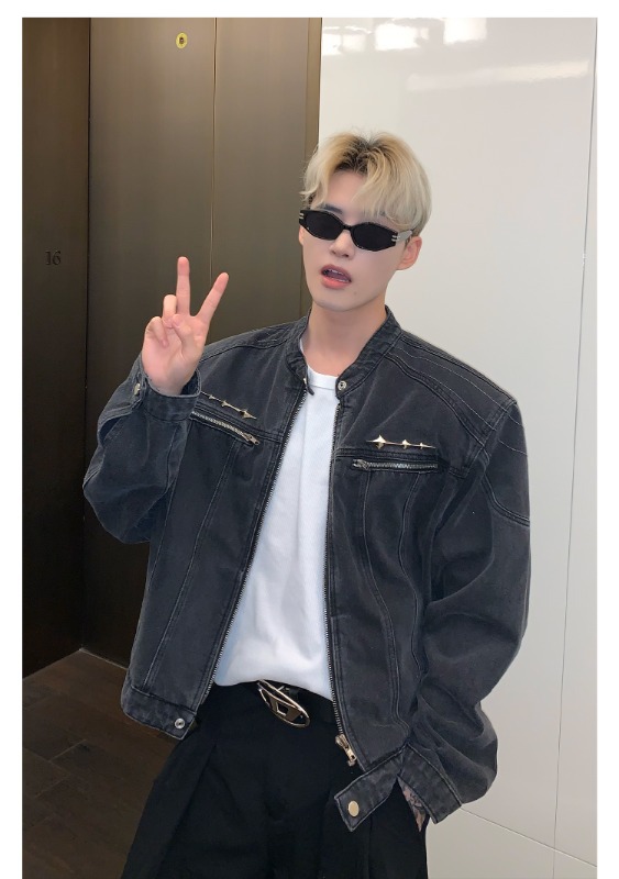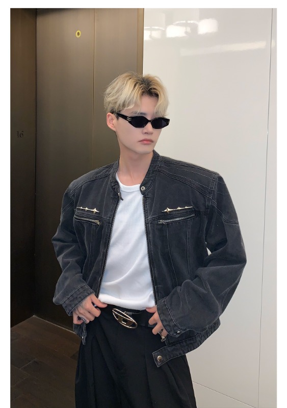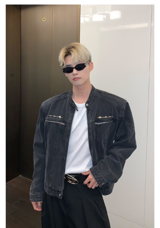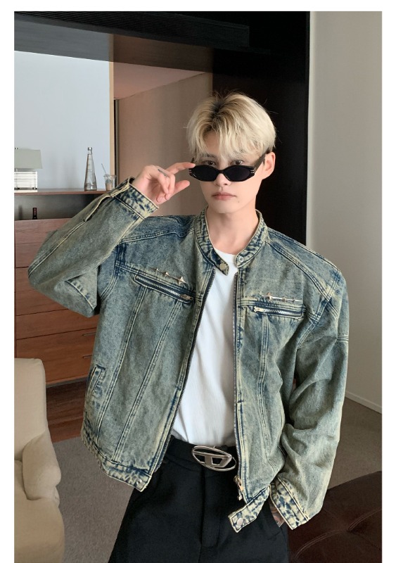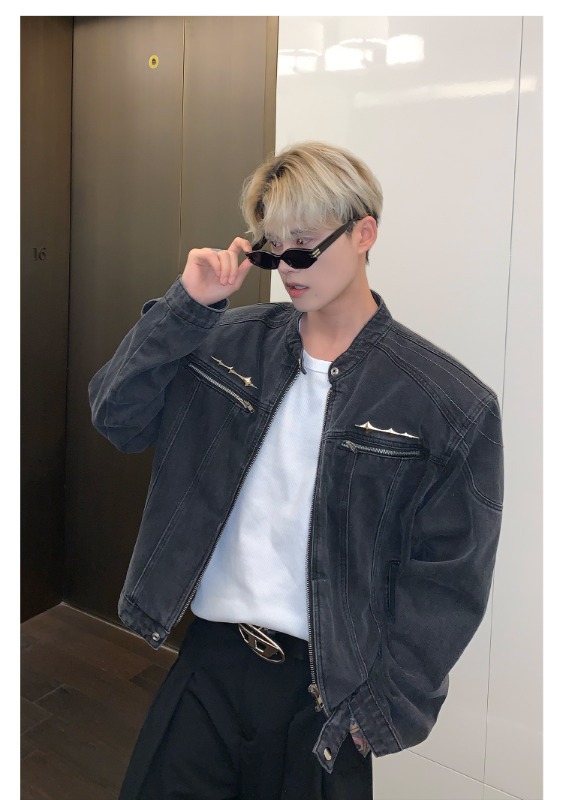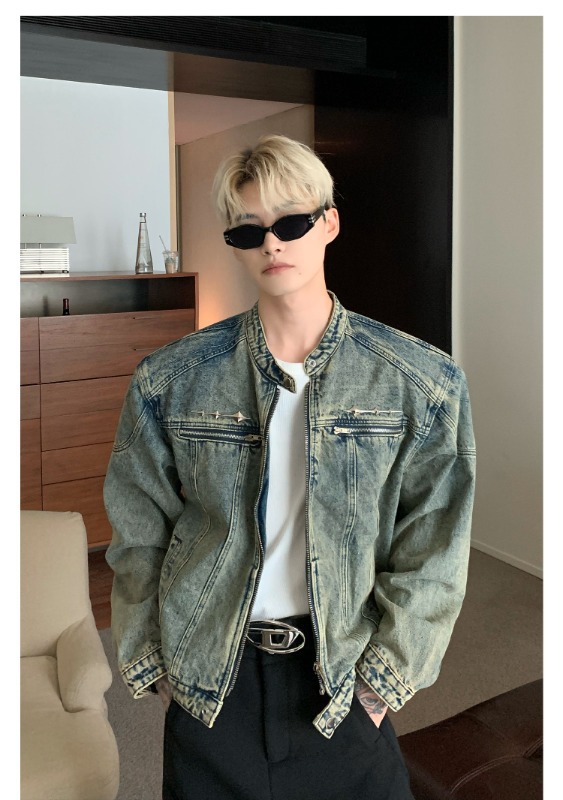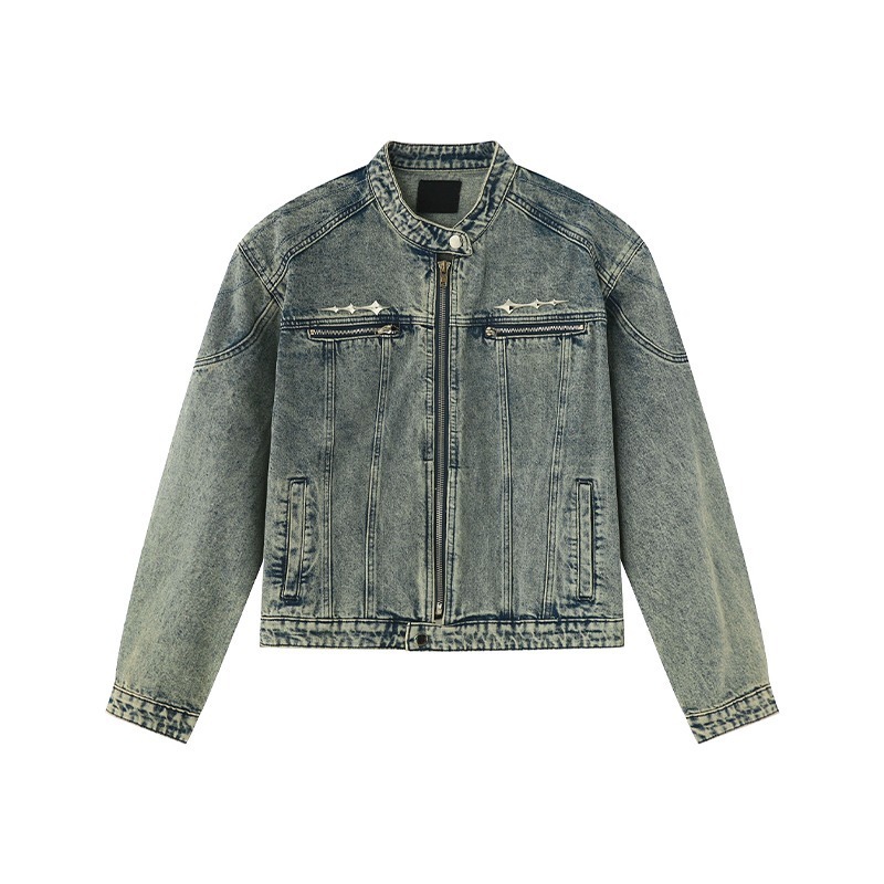 남성용 크로스보더 아메리칸 하이 스트리트 데님 재킷, 지퍼 디자인, 오른쪽 어깨 재킷, 고급 워싱 데님 재킷스토어 가기