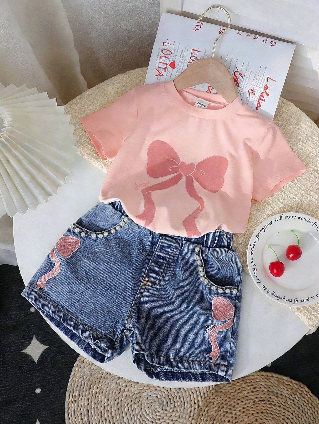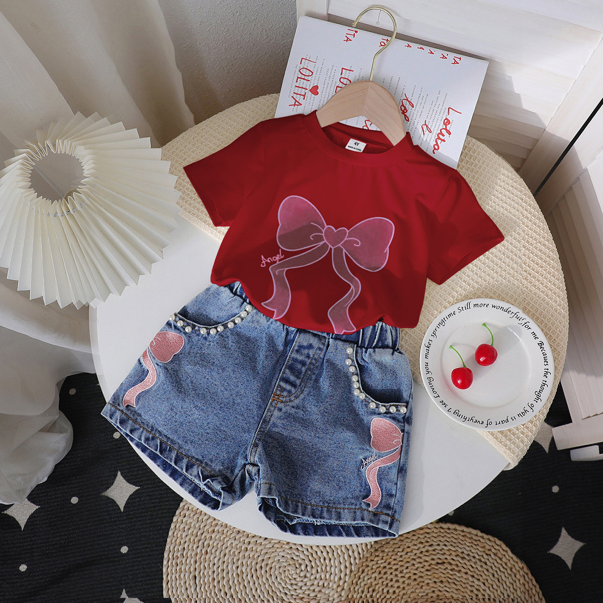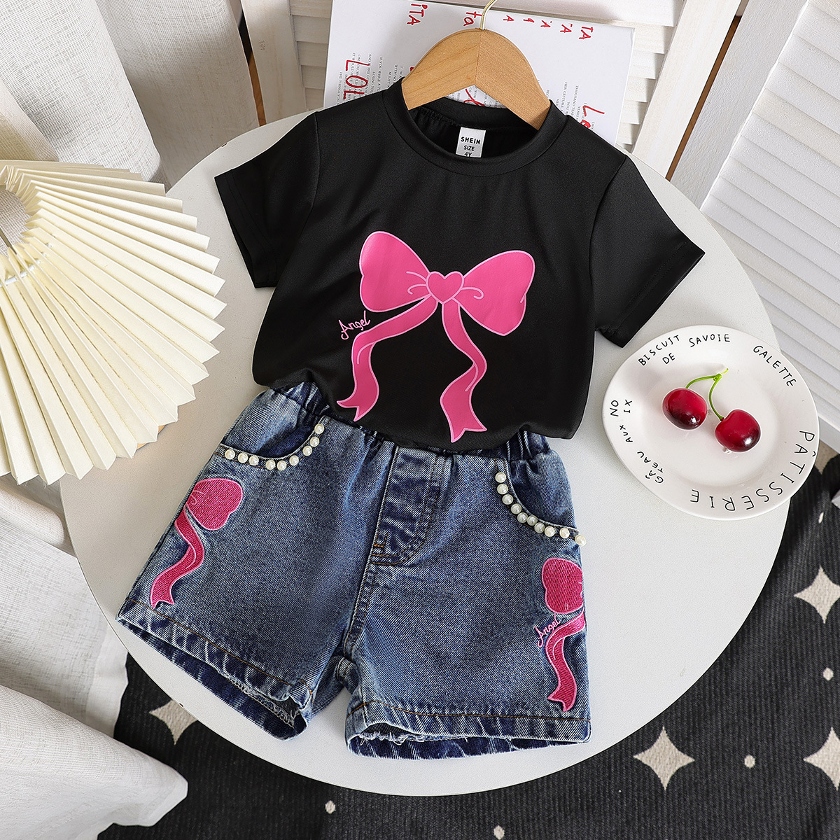 2025 새로운 크로싱 걸스 라운드 넥 인쇄 니트 탑 데님 구슬 수 놓은 청바지 세트 2 피스 세트스토어 가기