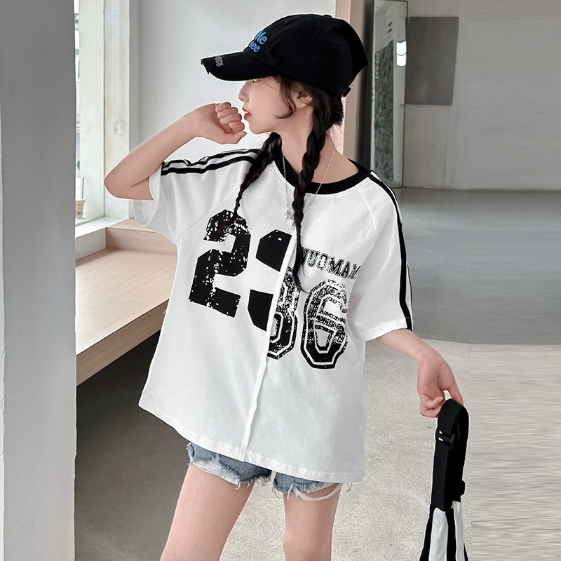 국경 간 소녀 여름 반팔 티셔츠 2025 새로운 스타일 중대형 어린이 여름 트렌디 반팔 올 매치 루즈 탑 트렌디