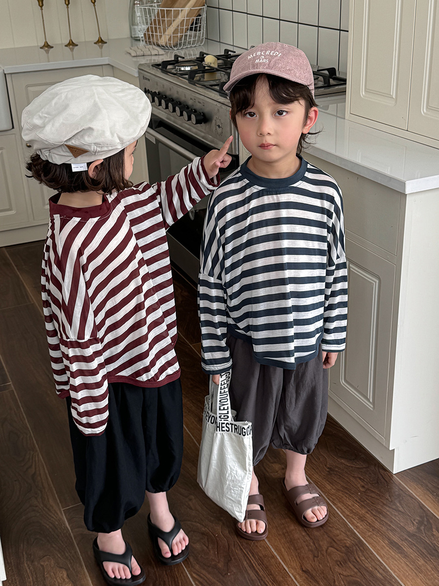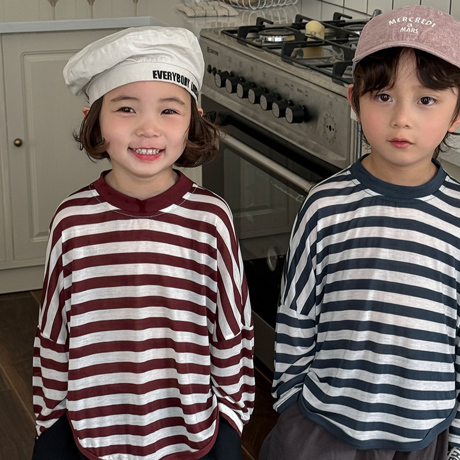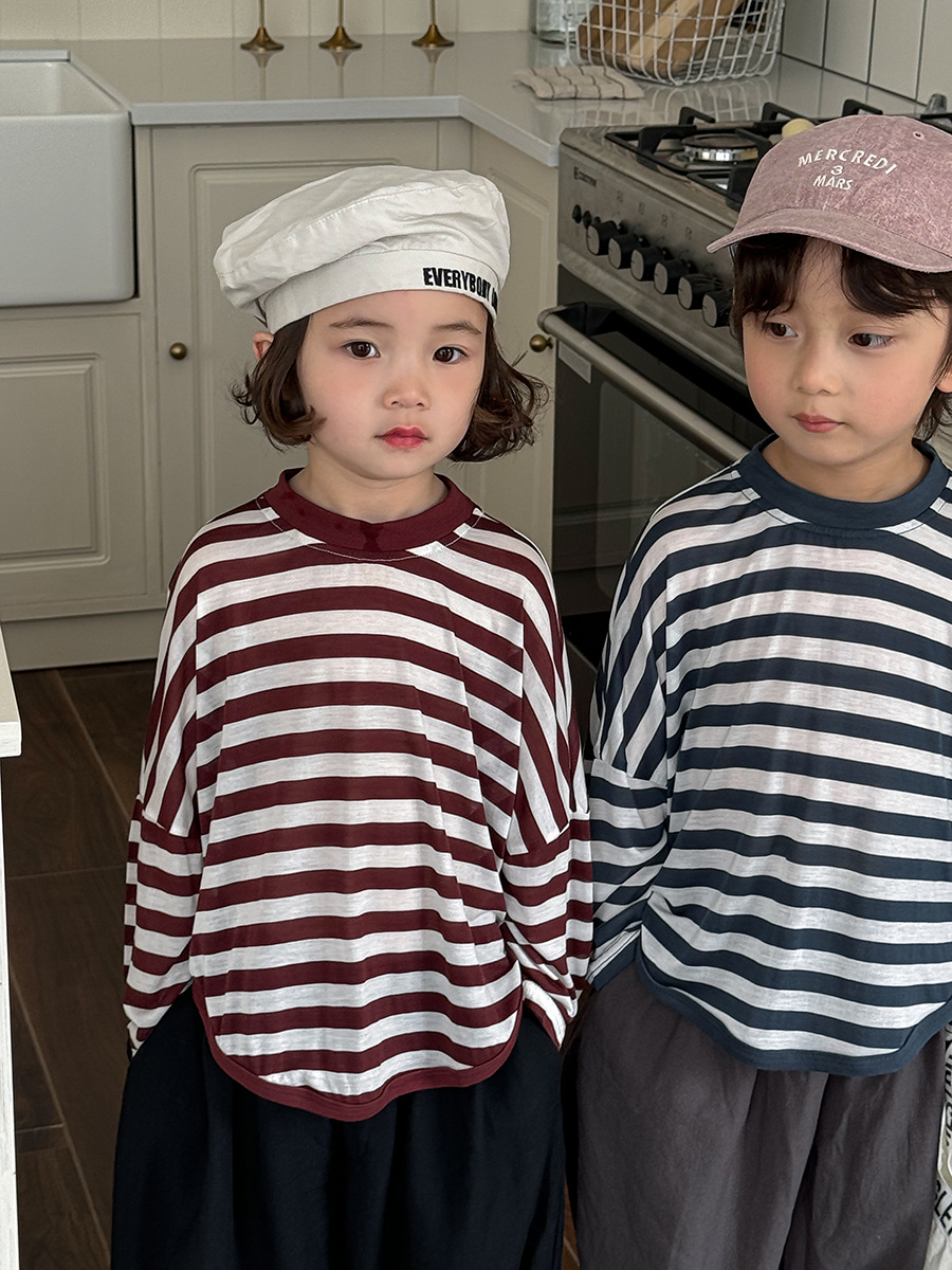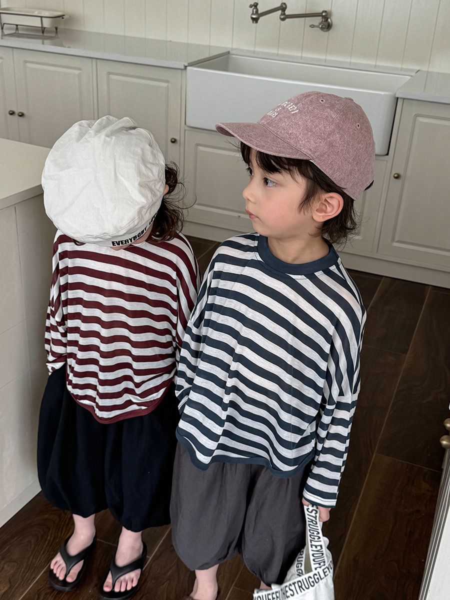 Jiaye 어린이 제품 2025 어린이 여름 새로운 줄무늬 텐셀 티셔츠 소년과 소녀를위한 느슨하고 시원한 태양 보호 의류스토어 가기