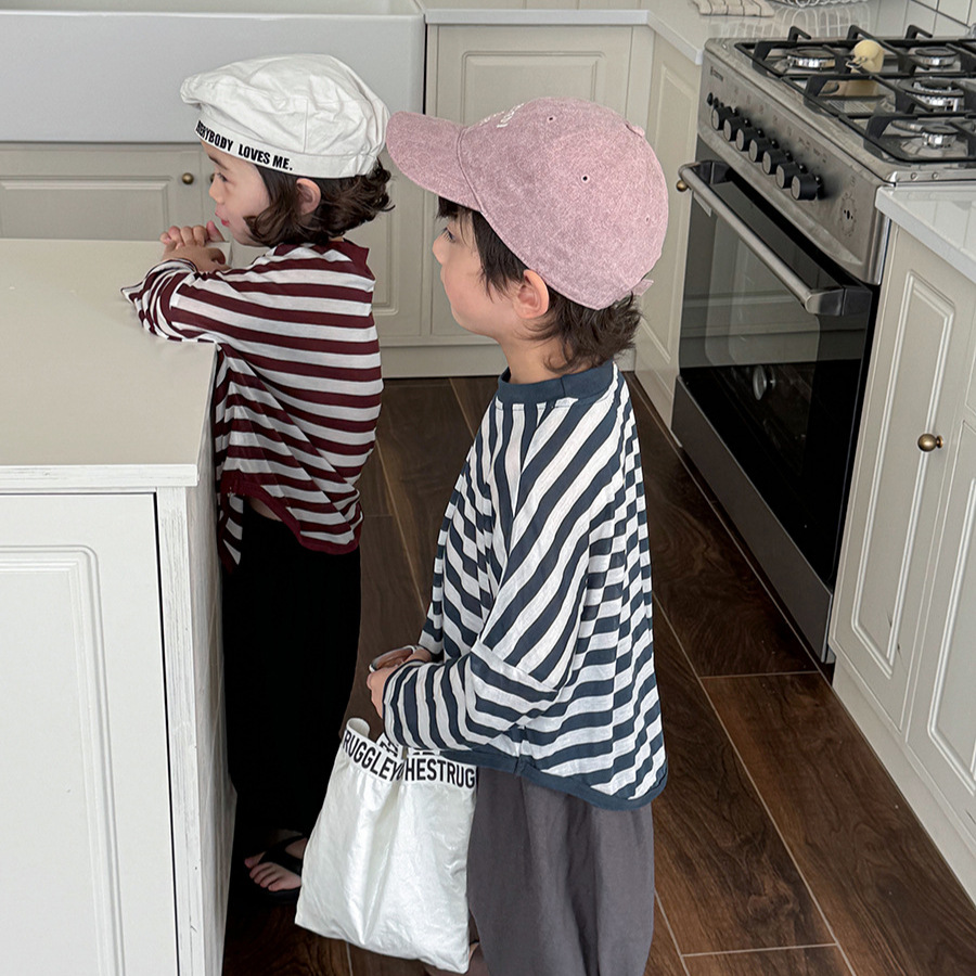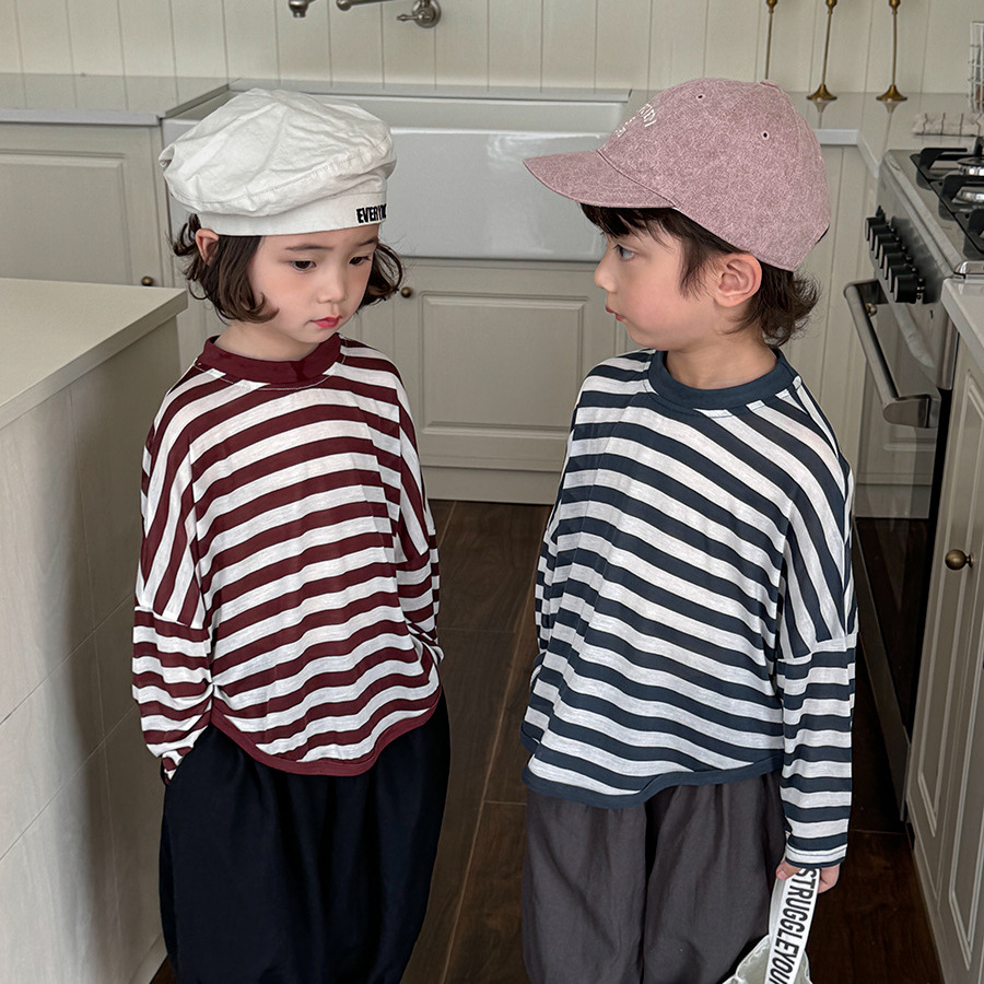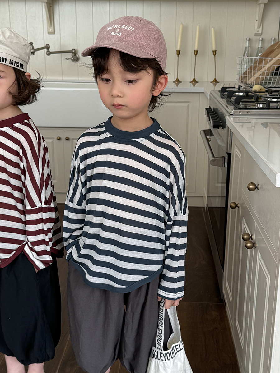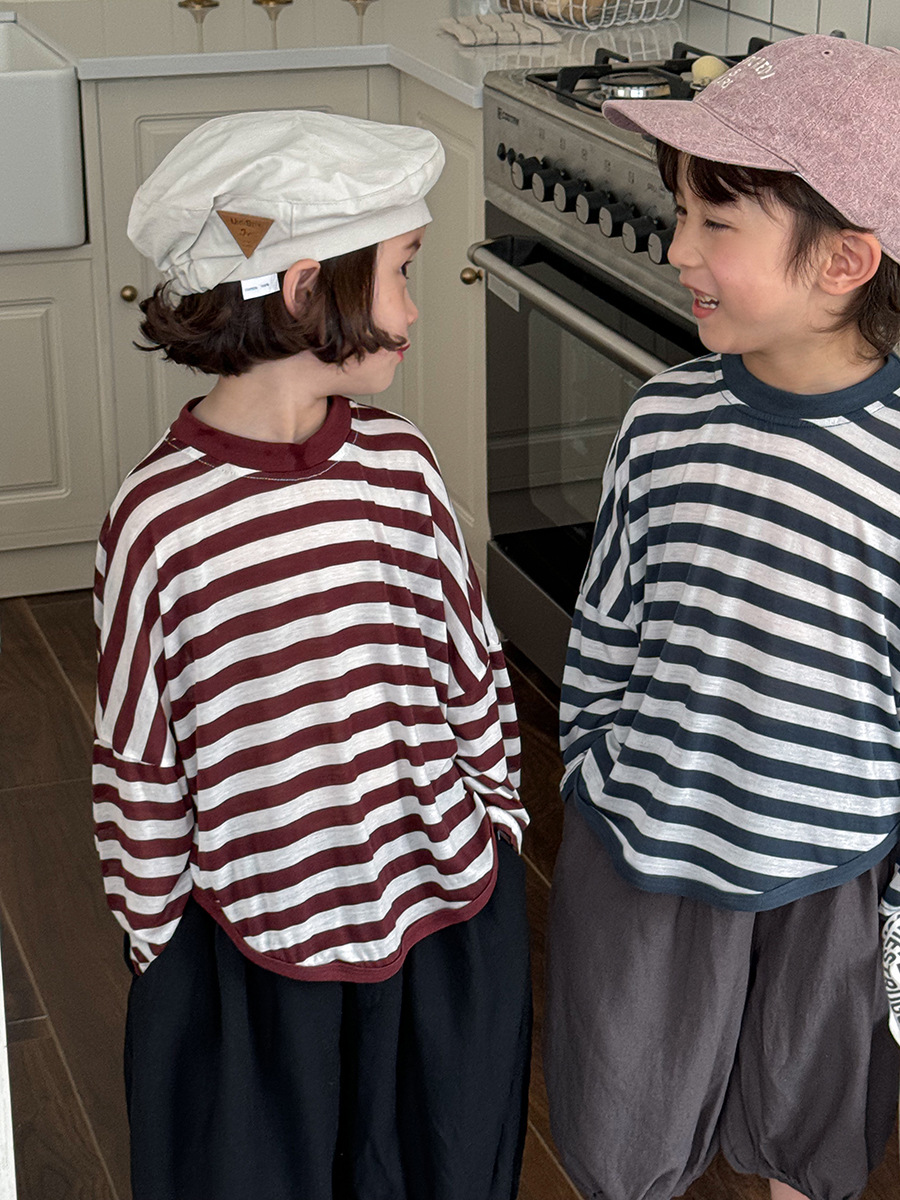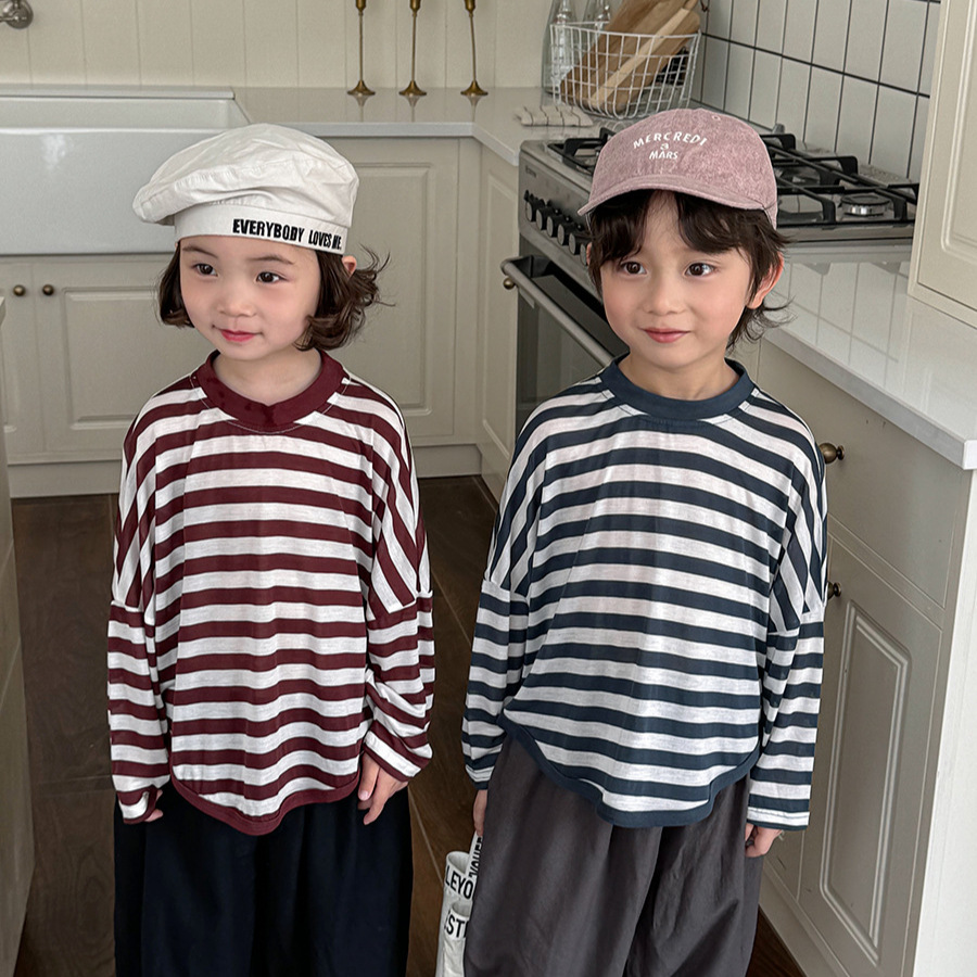 Jiaye 어린이 제품 2025 어린이 여름 새로운 줄무늬 텐셀 티셔츠 소년과 소녀를위한 느슨하고 시원한 태양 보호 의류스토어 가기