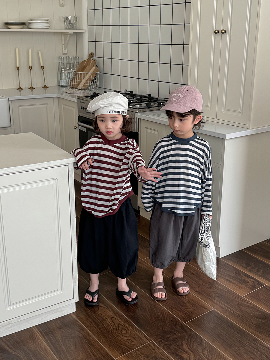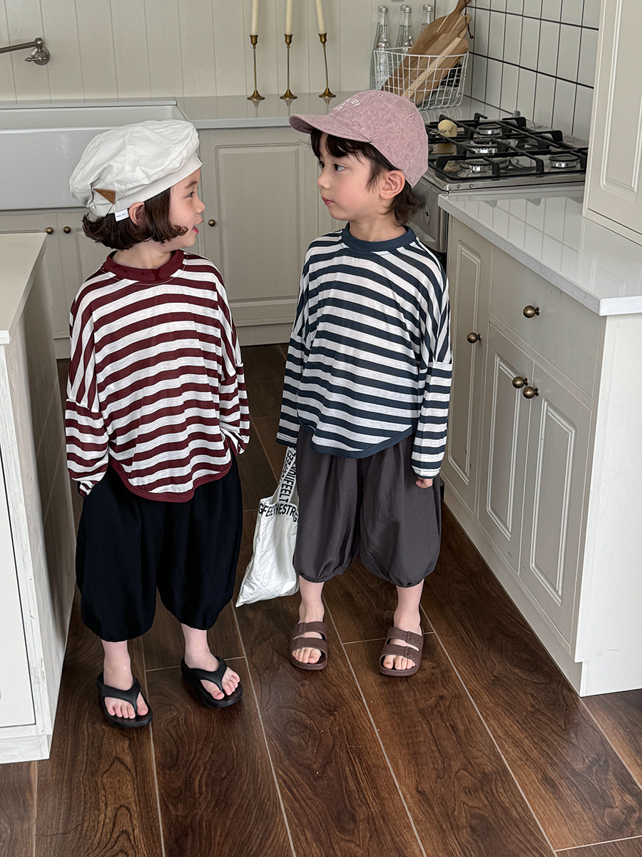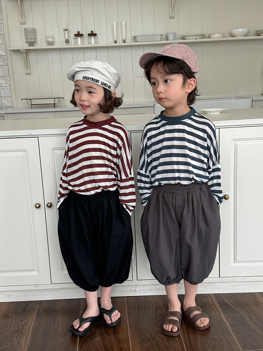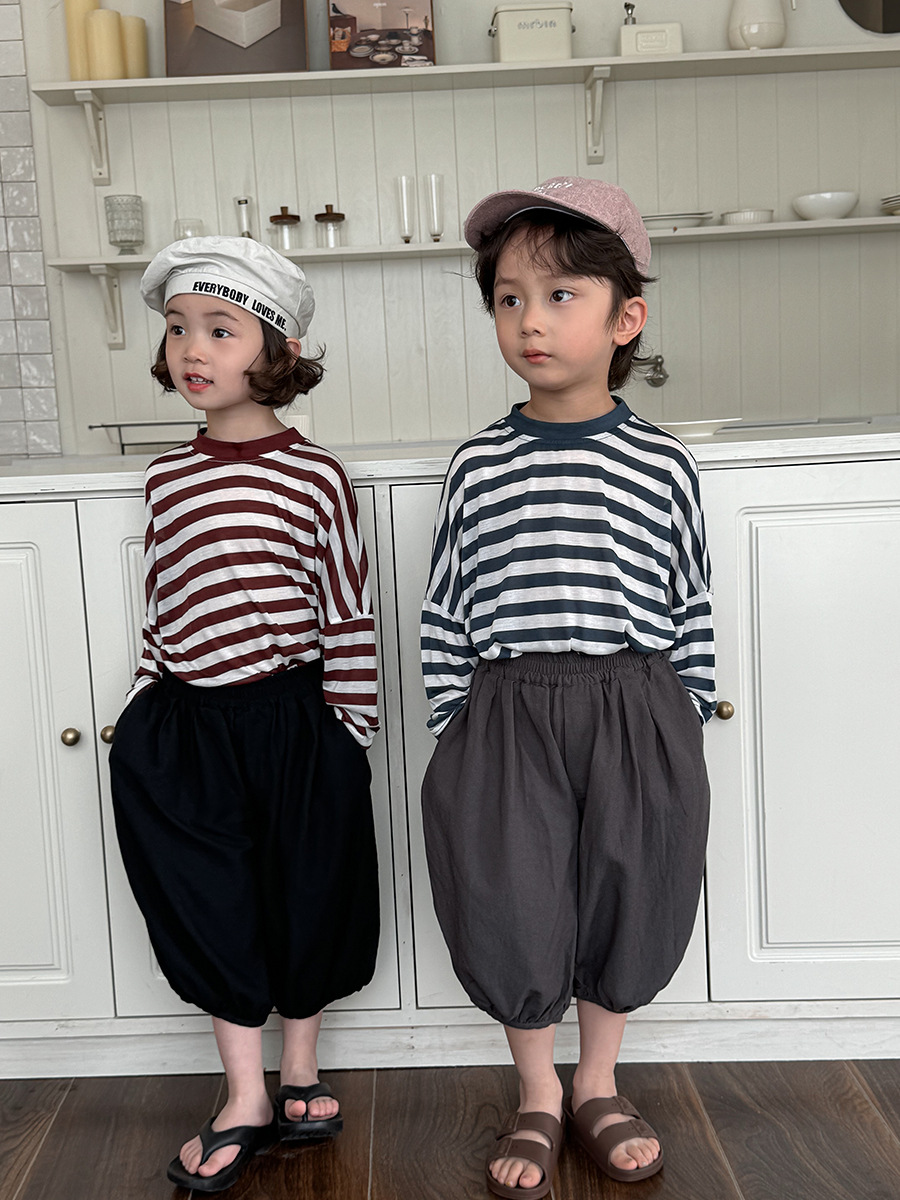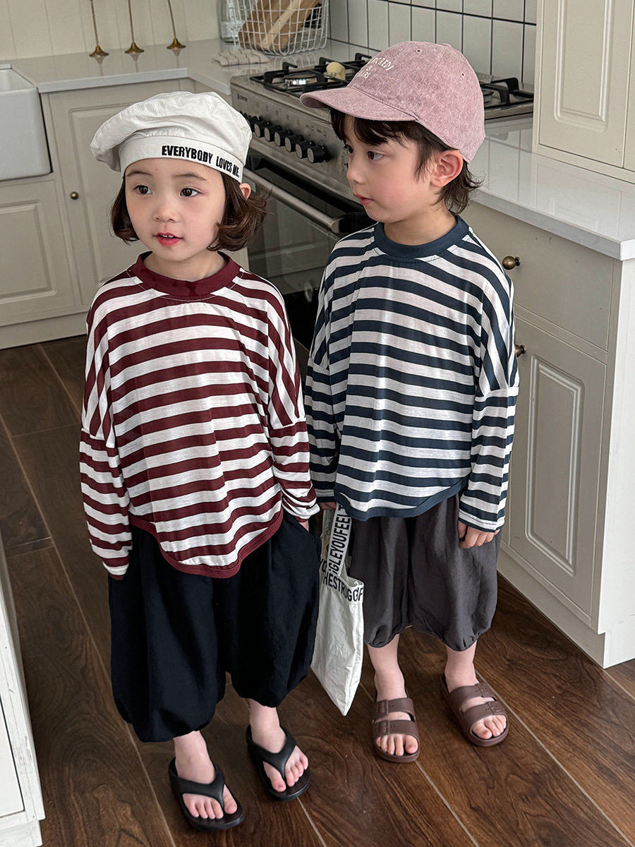 Jiaye 어린이 제품 2025 어린이 여름 새로운 줄무늬 텐셀 티셔츠 소년과 소녀를위한 느슨하고 시원한 태양 보호 의류