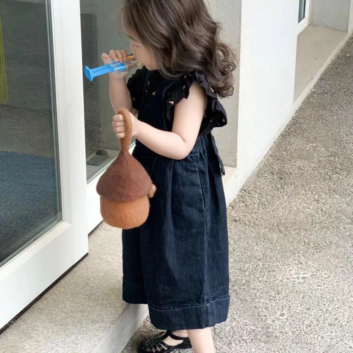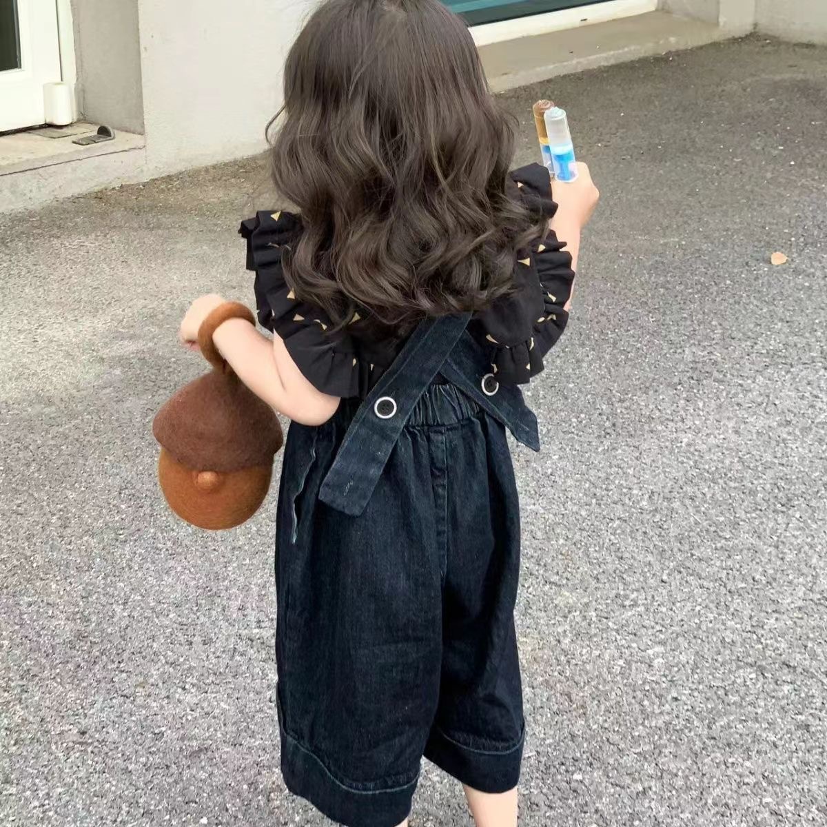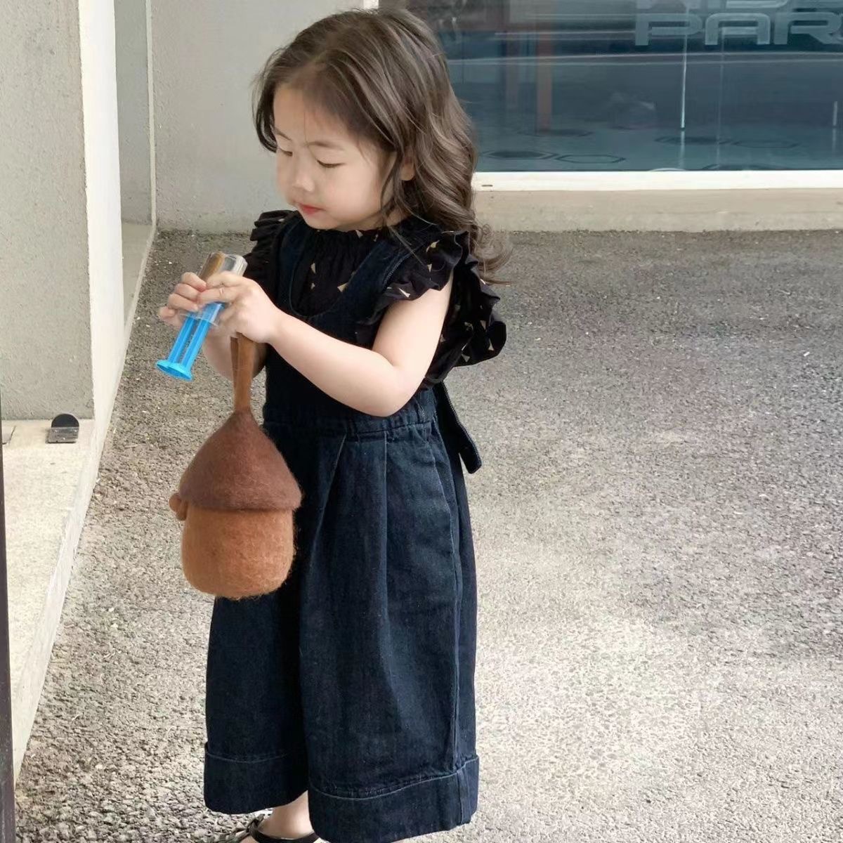 한국 스타일 아동복 2026 봄 여름 여아 와이드 데님 멜빵바지 아기 올오버 프린트 플라잉 슬리브 상의 세트스토어 가기