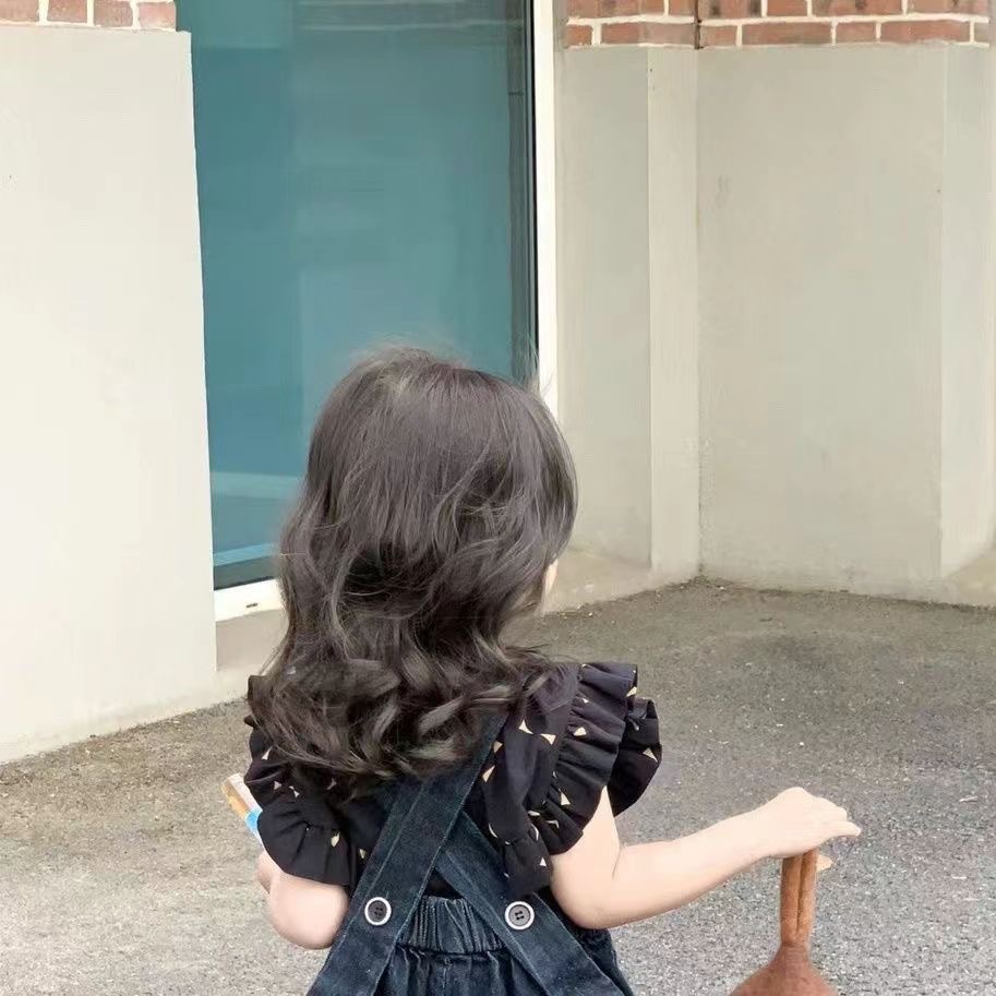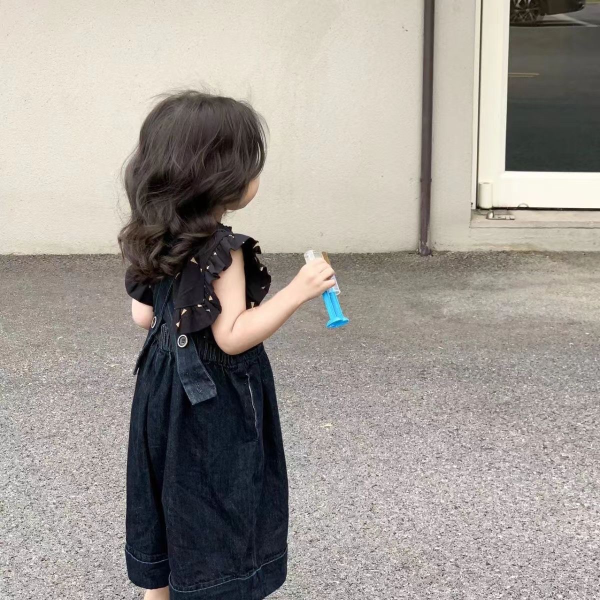 한국 스타일 아동복 2026 봄 여름 여아 와이드 데님 멜빵바지 아기 올오버 프린트 플라잉 슬리브 상의 세트