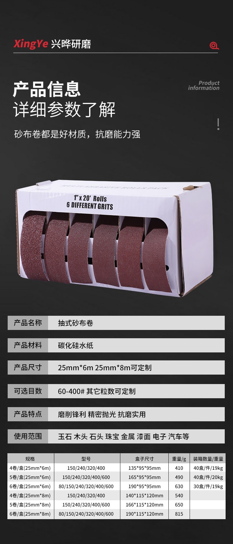 4축, 5축, 6축 사포 박스형 풀아웃 사포 롤 손으로 찢을 수 있는 건식 연삭 금속 유리 목재 사포