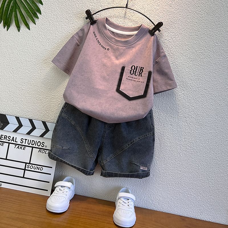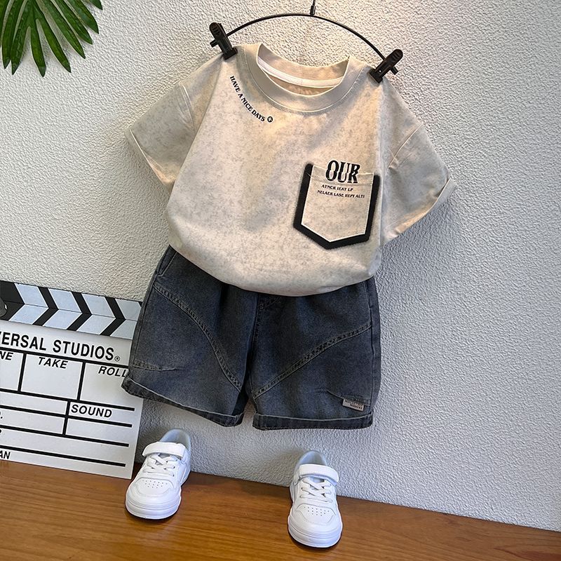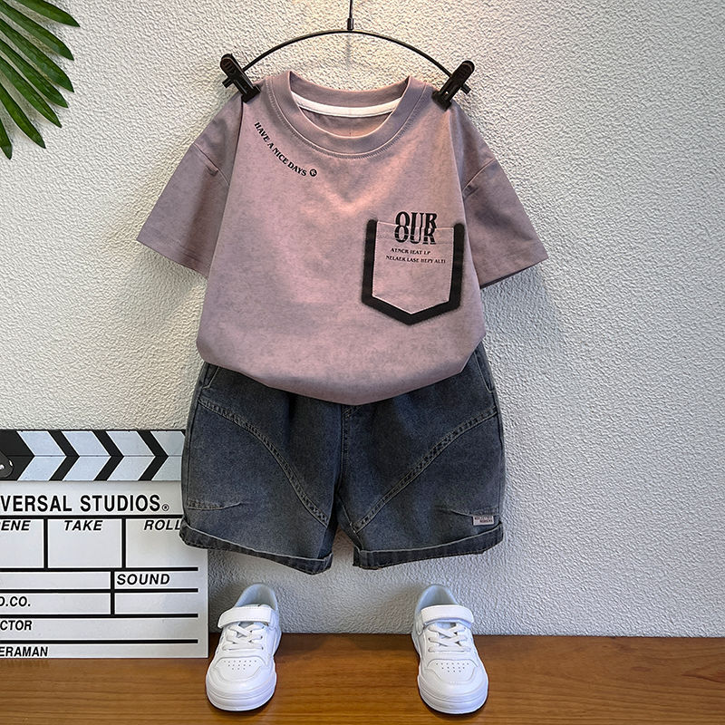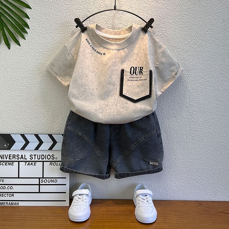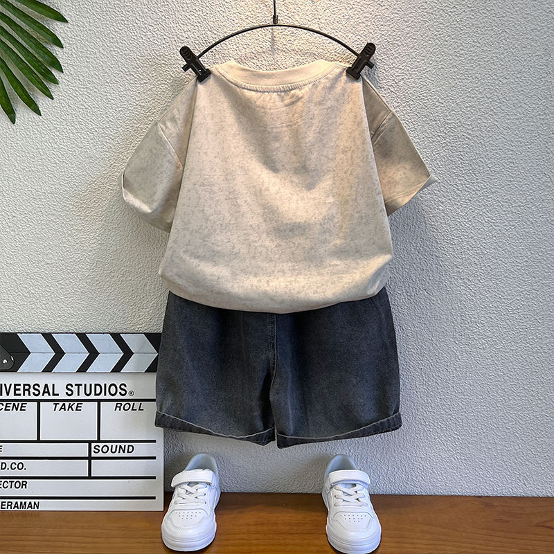 남학생 반팔 티셔츠 세트 2025 년 여름 새 스타일 코튼 남자 아기의 유행 옷 어린이 여름 투피스 세트스토어 가기