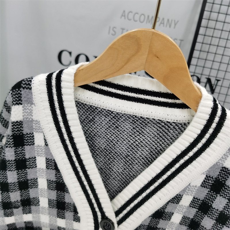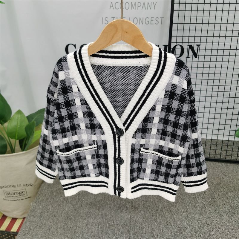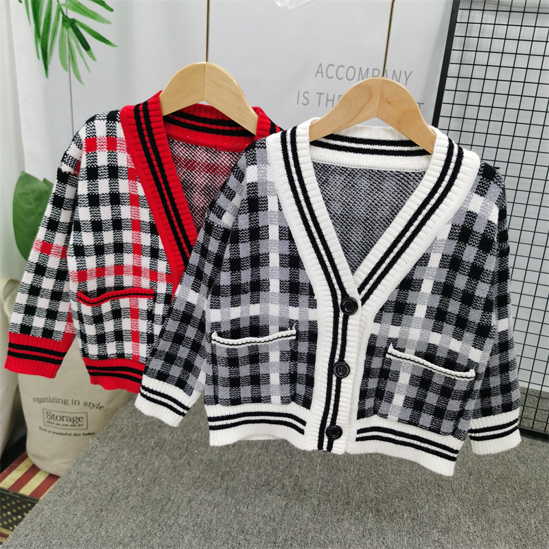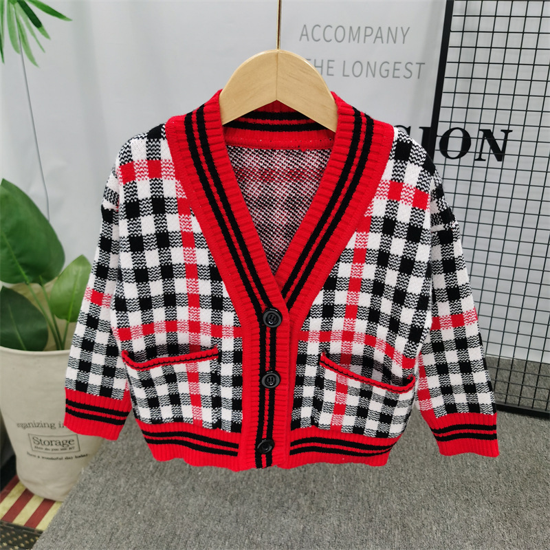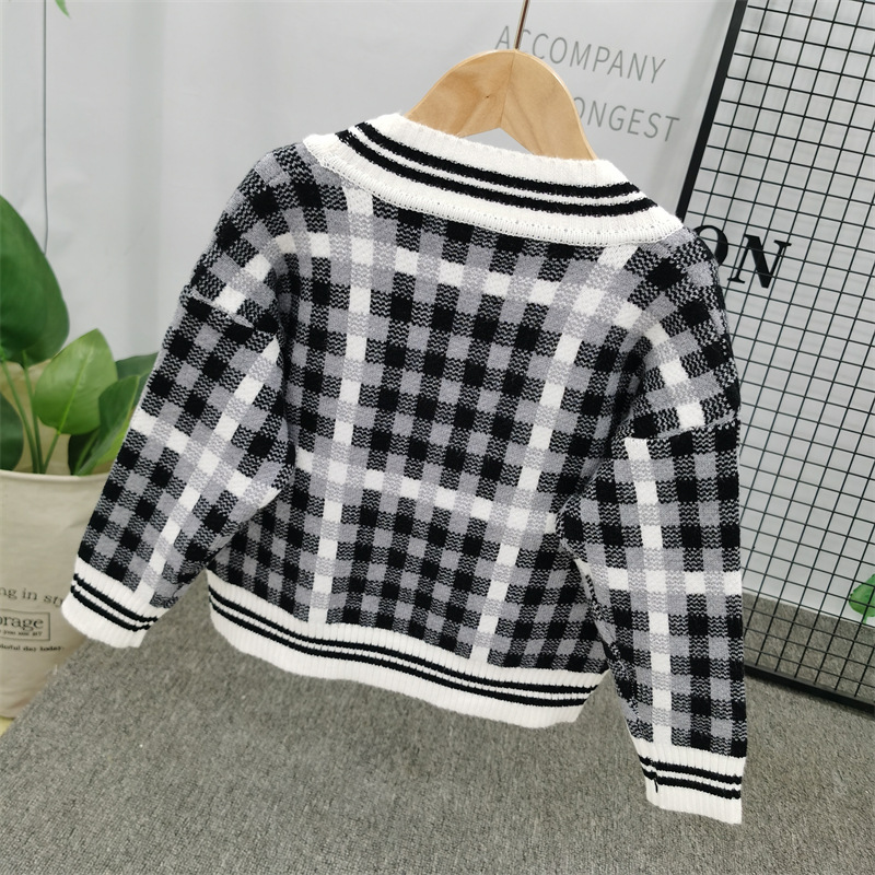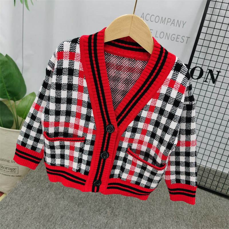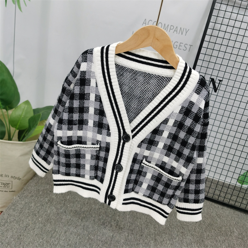 어린이 니트 재킷 가을, 겨울 새로운 한국 스타일 소년 아기 스타일 두꺼운 v 넥 격자 무늬 스웨터 카디건