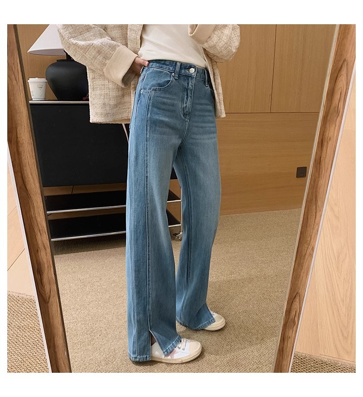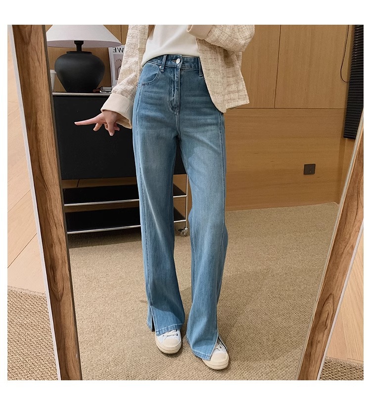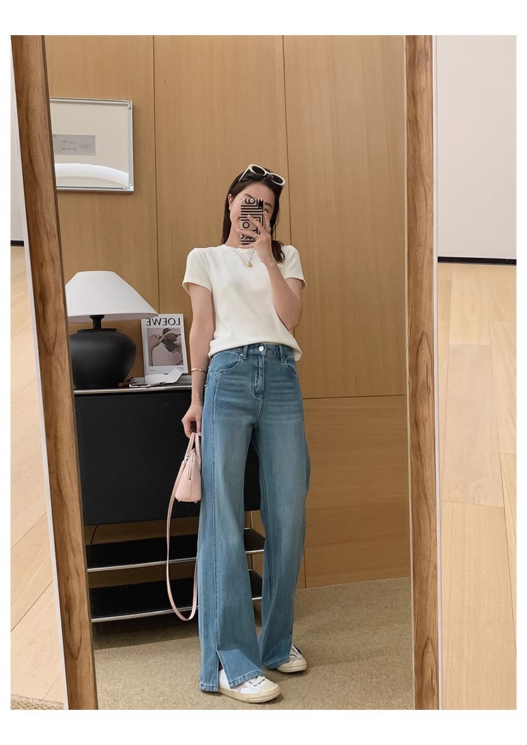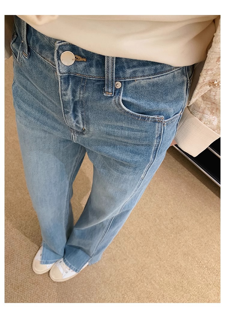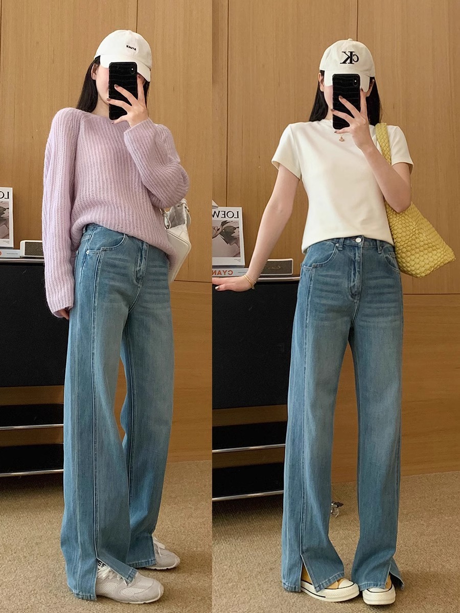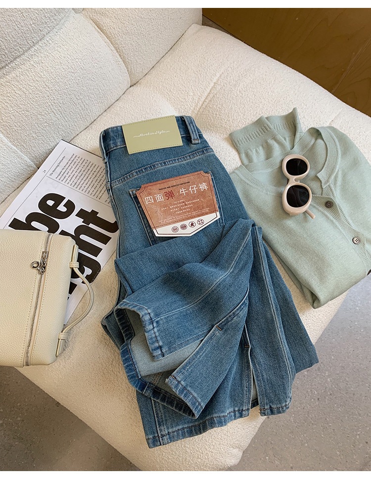 一穿即瘦软膜四面弹侧骨位开叉窄版牛仔裤!