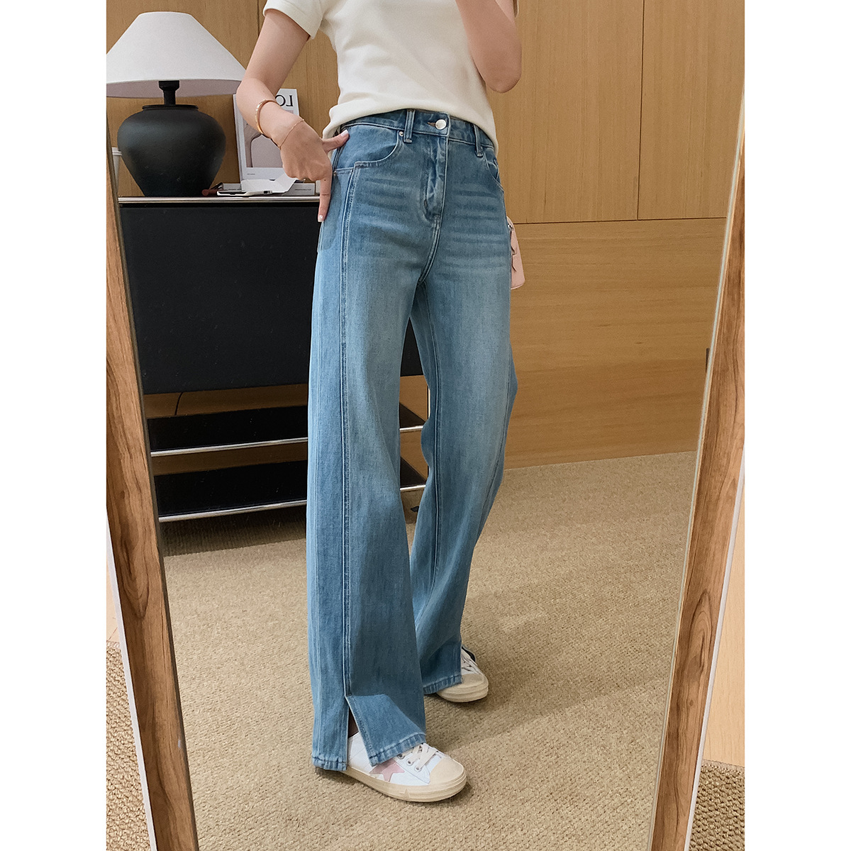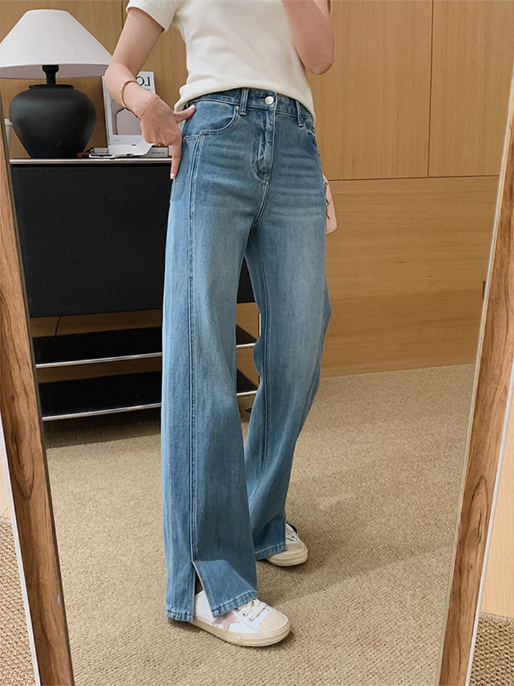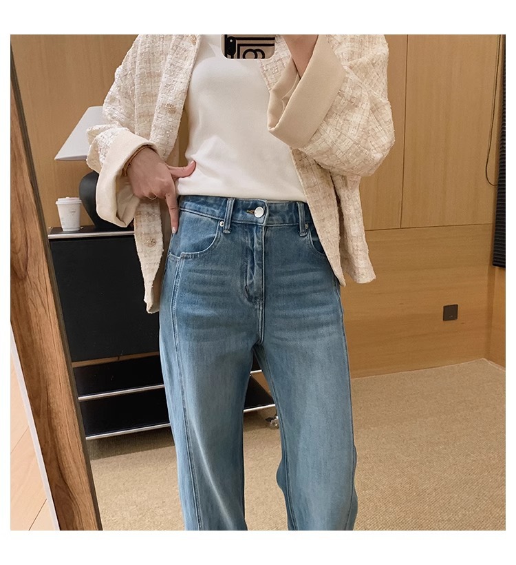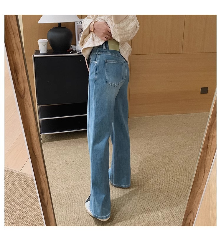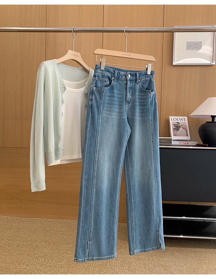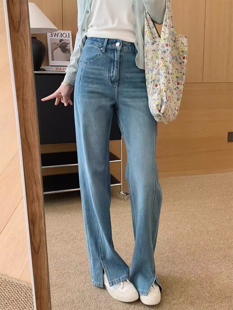 一穿即瘦软膜四面弹侧骨位开叉窄版牛仔裤!