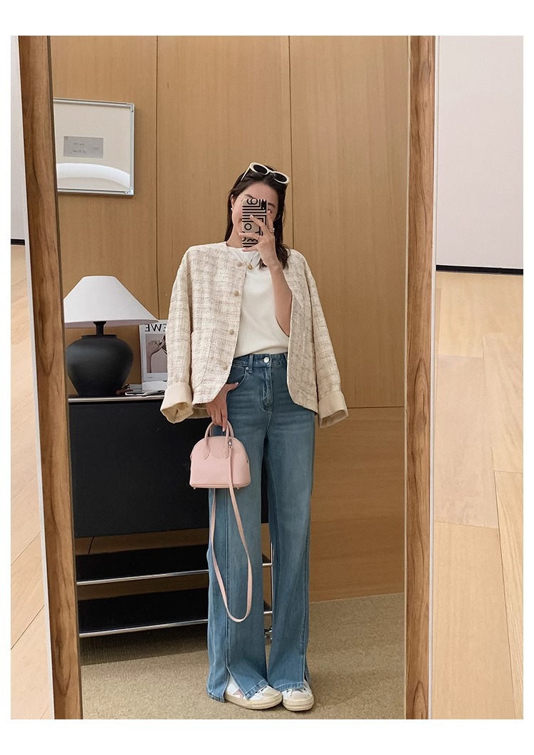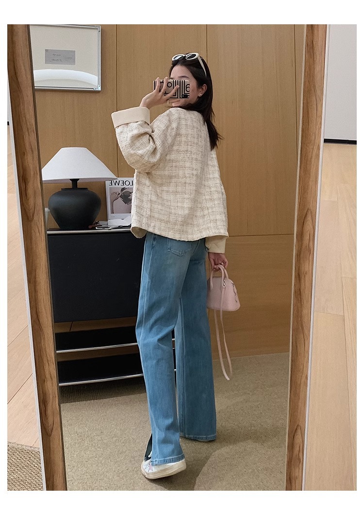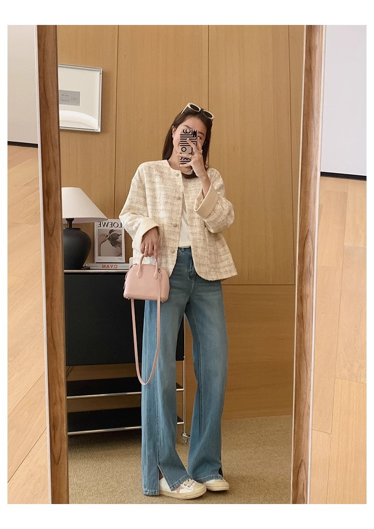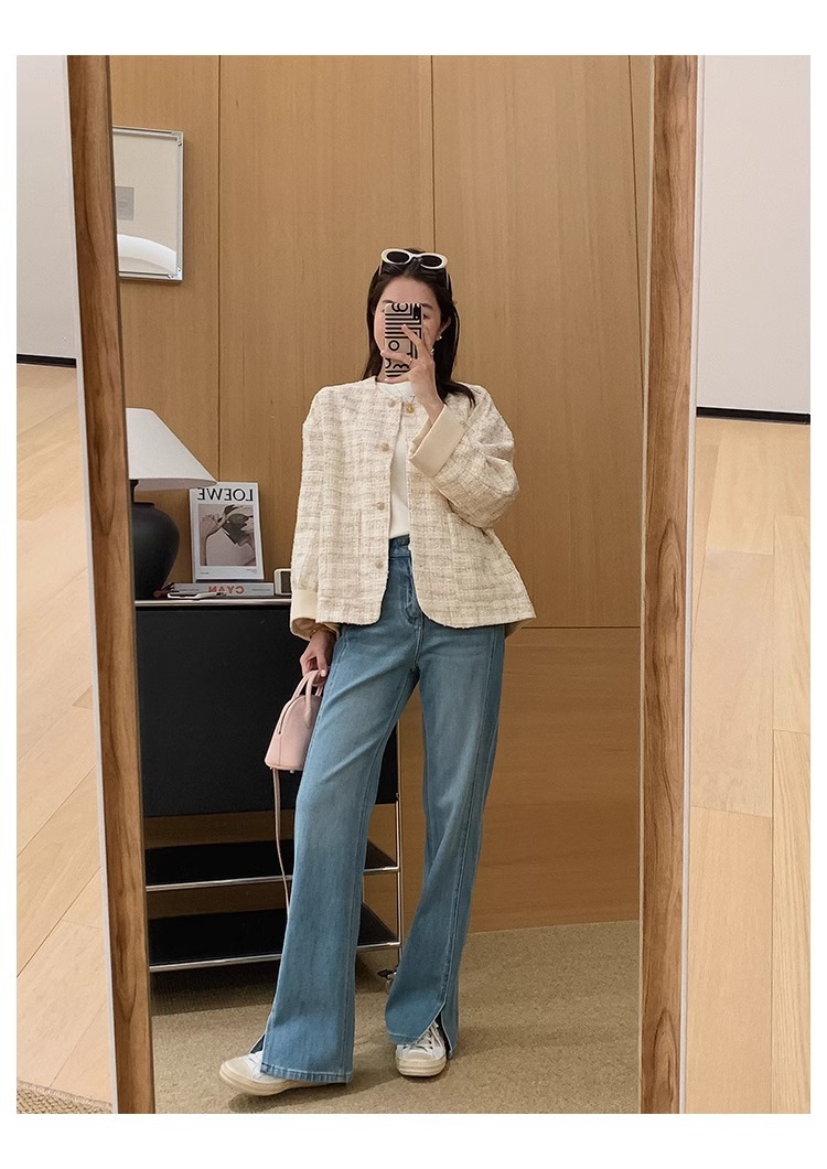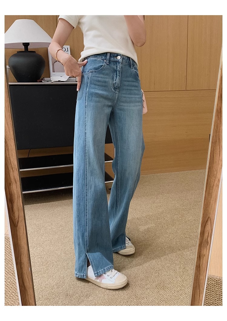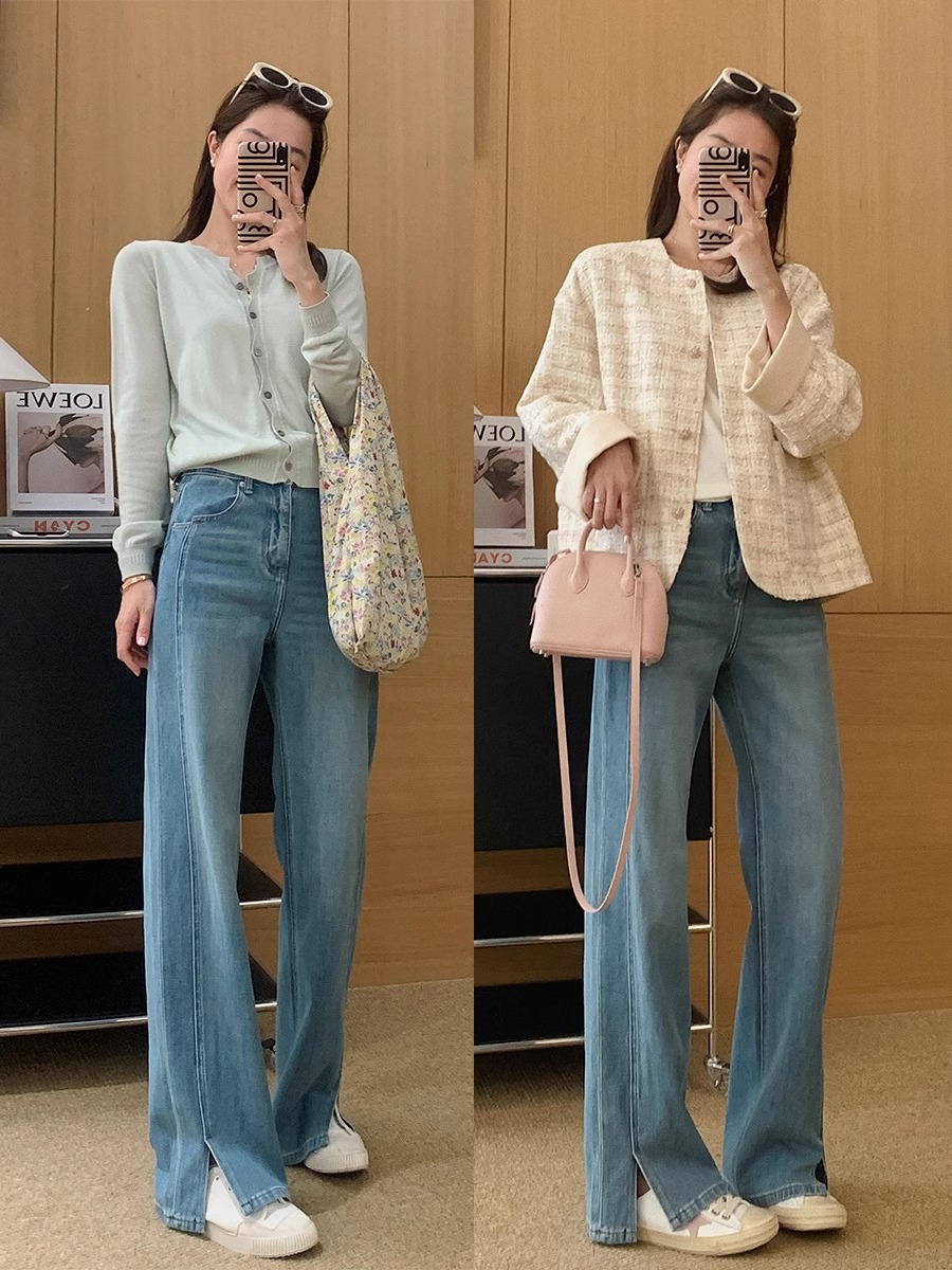 一穿即瘦软膜四面弹侧骨位开叉窄版牛仔裤!