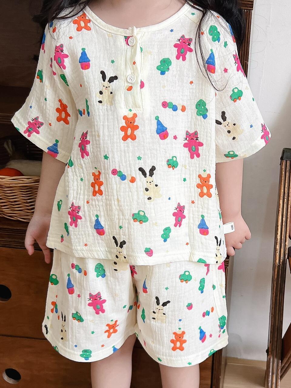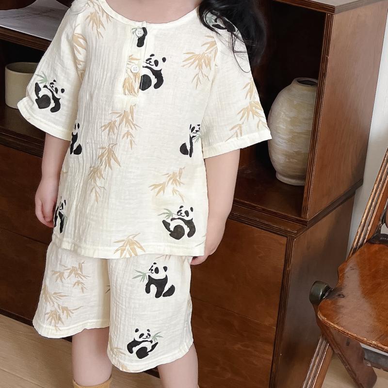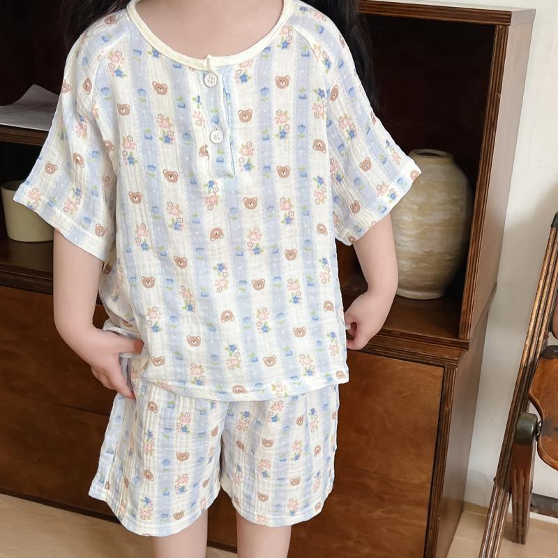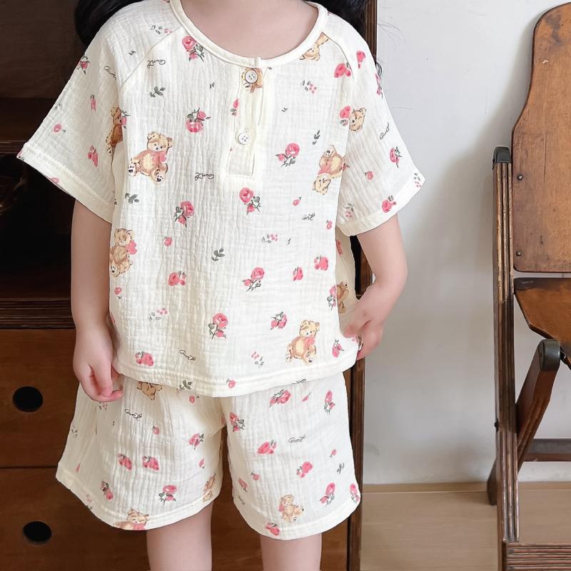 2025 새로운 소녀 여름 홈 의류 거즈 코튼 클래스 짧은 소매 반바지 파자마 소년 세트스토어 가기