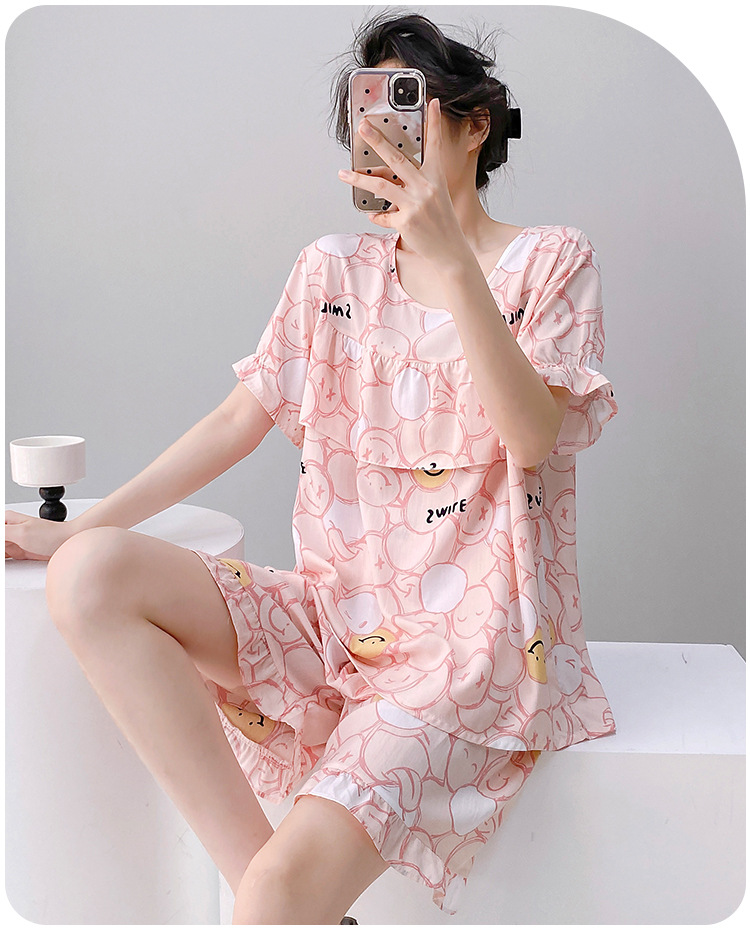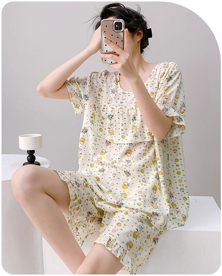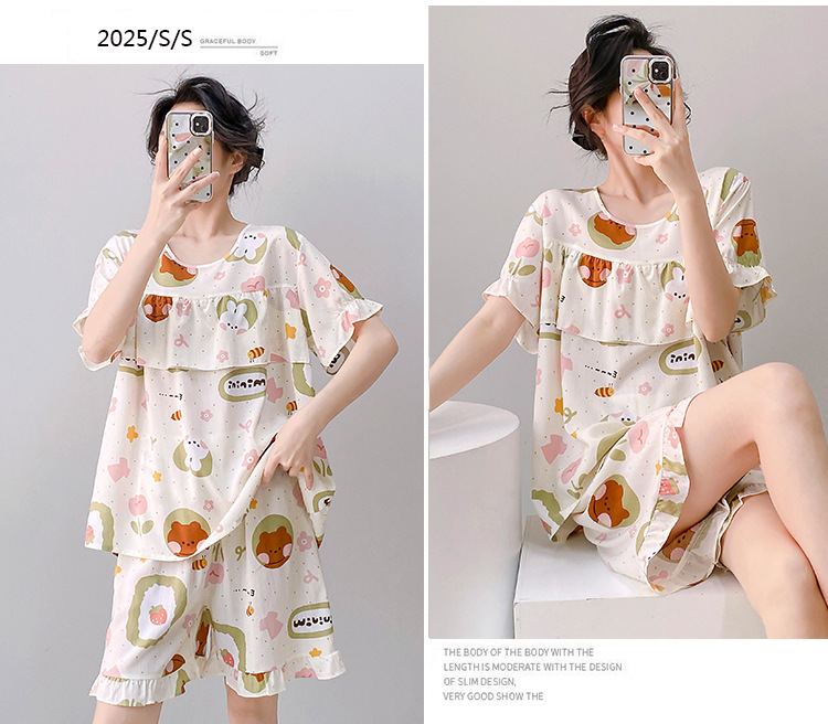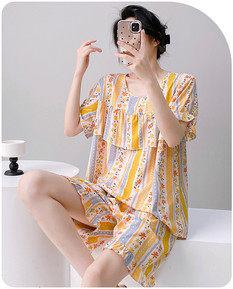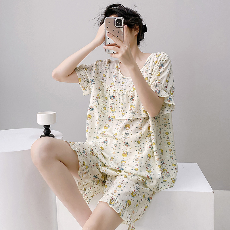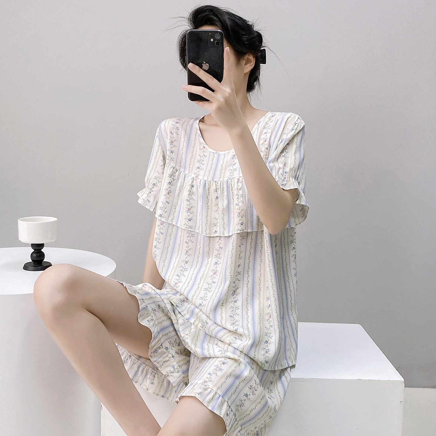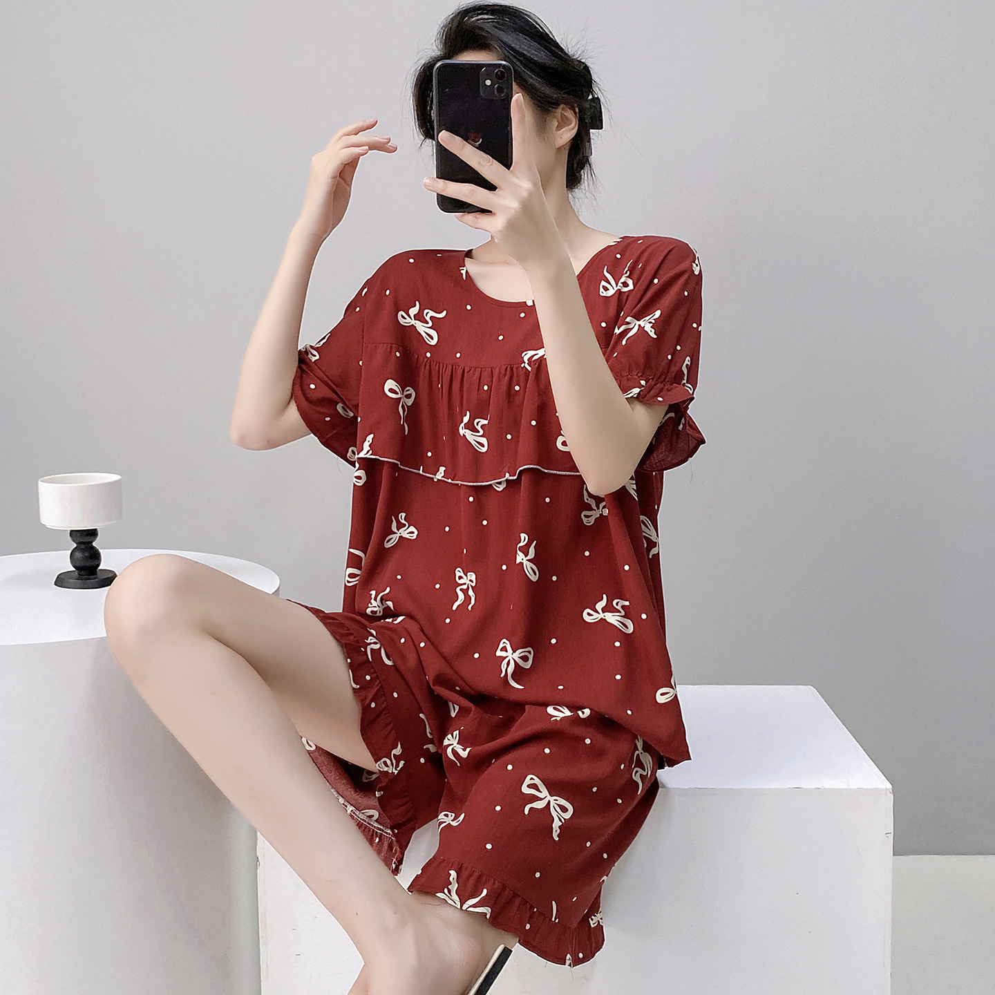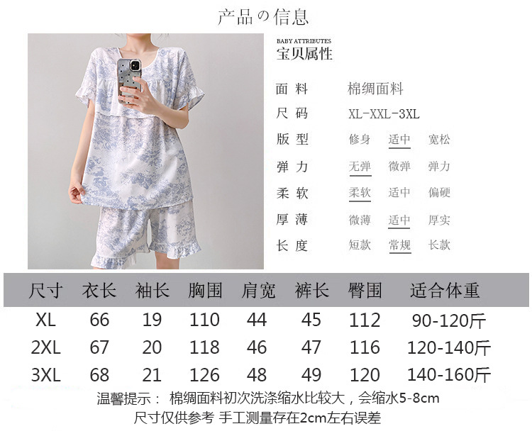 여름 면 실크 파자마 여성의 얇은 반팔 반바지 안티 범프 세트 고급 인공 면 플러스 사이즈 외부 착용 홈 의류스토어 가기