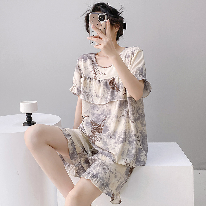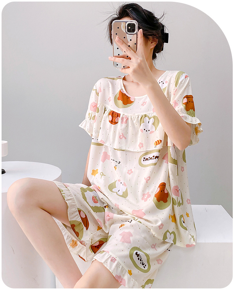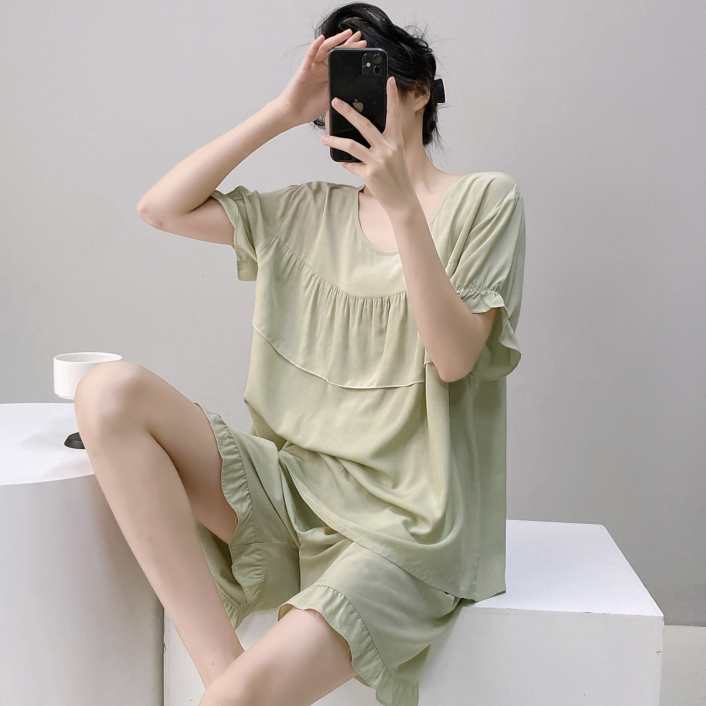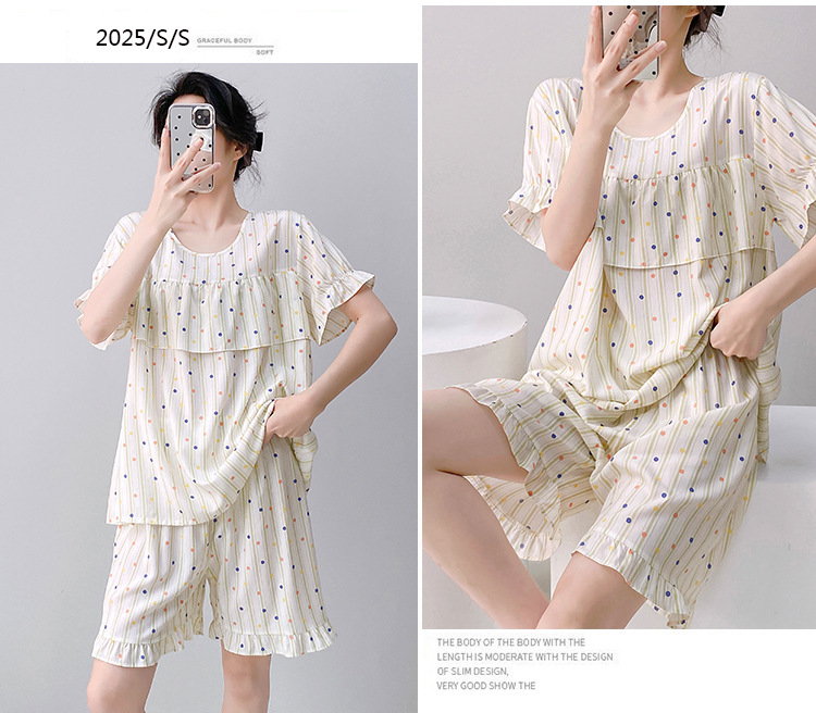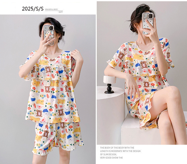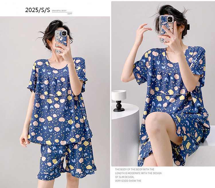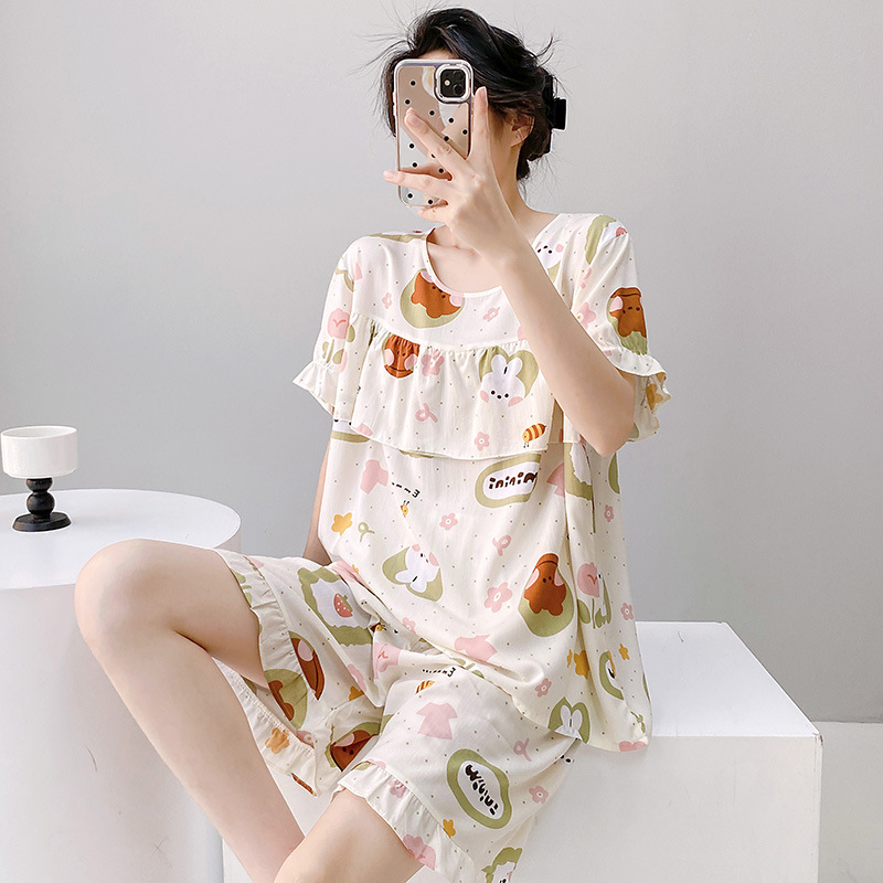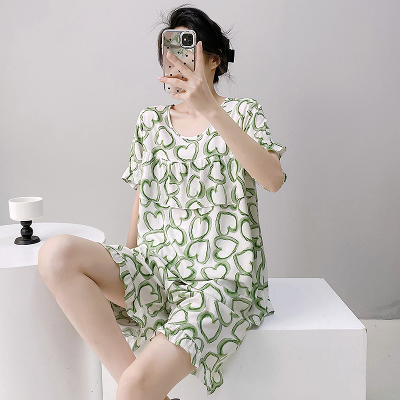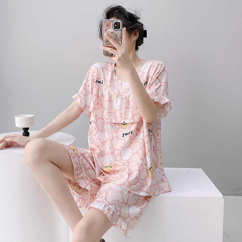 여름 면 실크 파자마 여성의 얇은 반팔 반바지 안티 범프 세트 고급 인공 면 플러스 사이즈 외부 착용 홈 의류스토어 가기