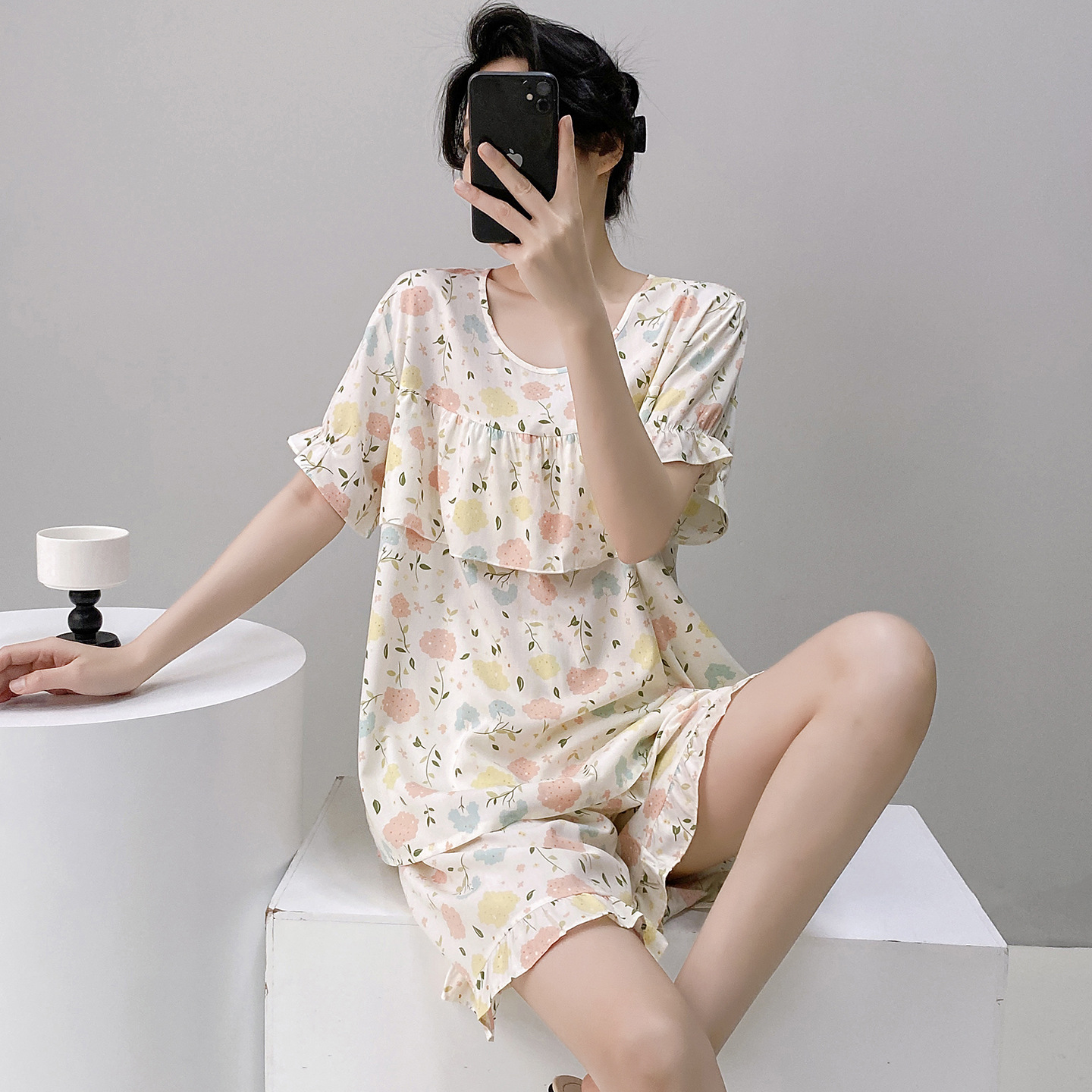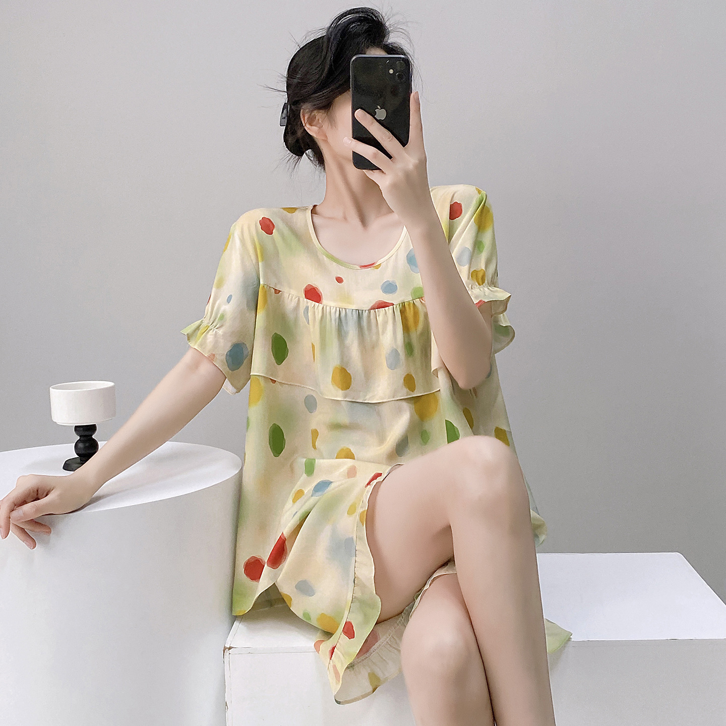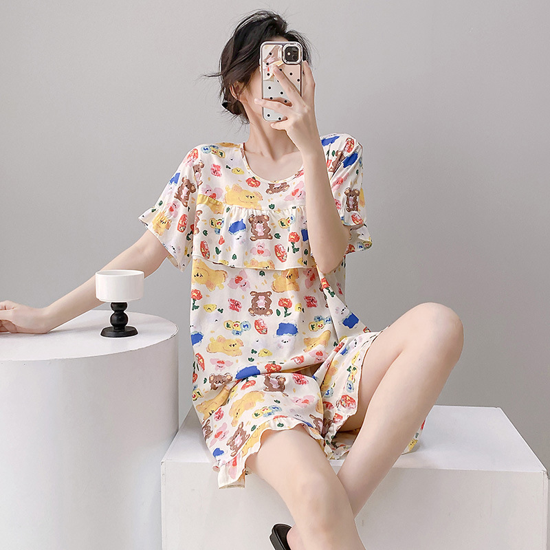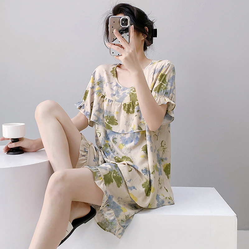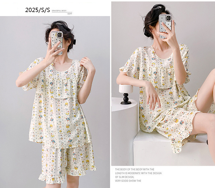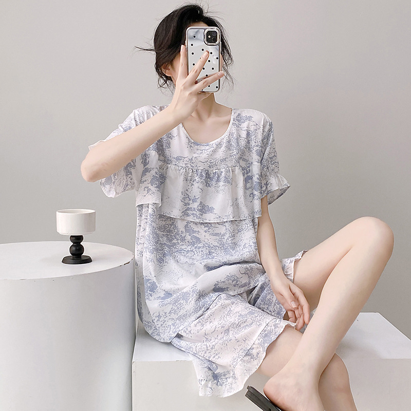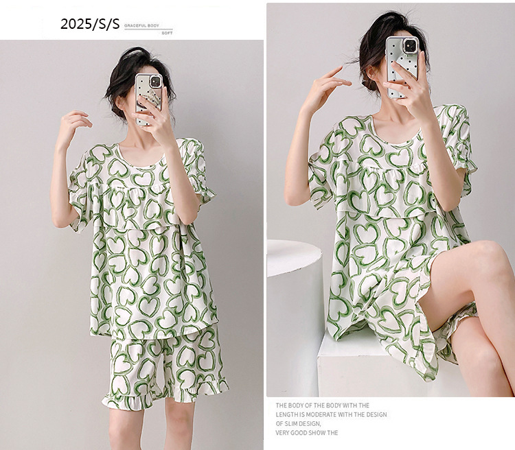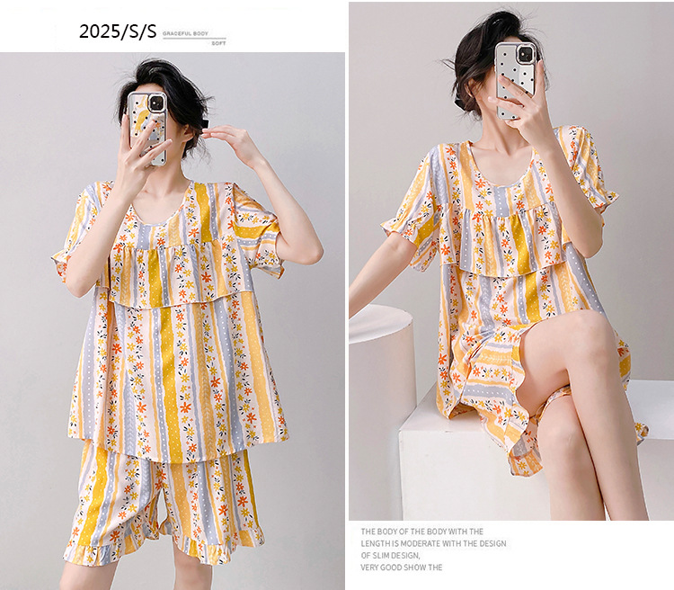 여름 면 실크 파자마 여성의 얇은 반팔 반바지 안티 범프 세트 고급 인공 면 플러스 사이즈 외부 착용 홈 의류스토어 가기