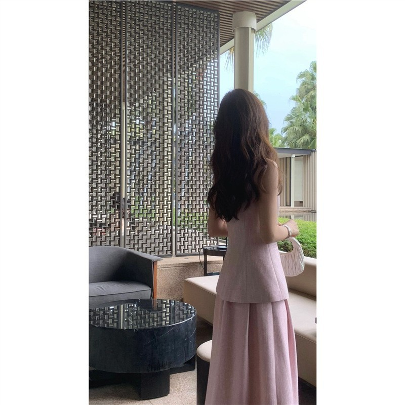 [재고] 프랑스 레트로 샤넬 스타일 핑크 민소매 조끼 스커트 세트 우아한 여성 2025 새로운스토어 가기