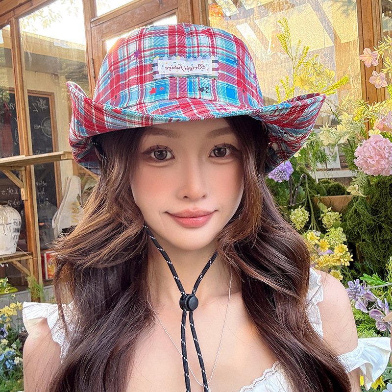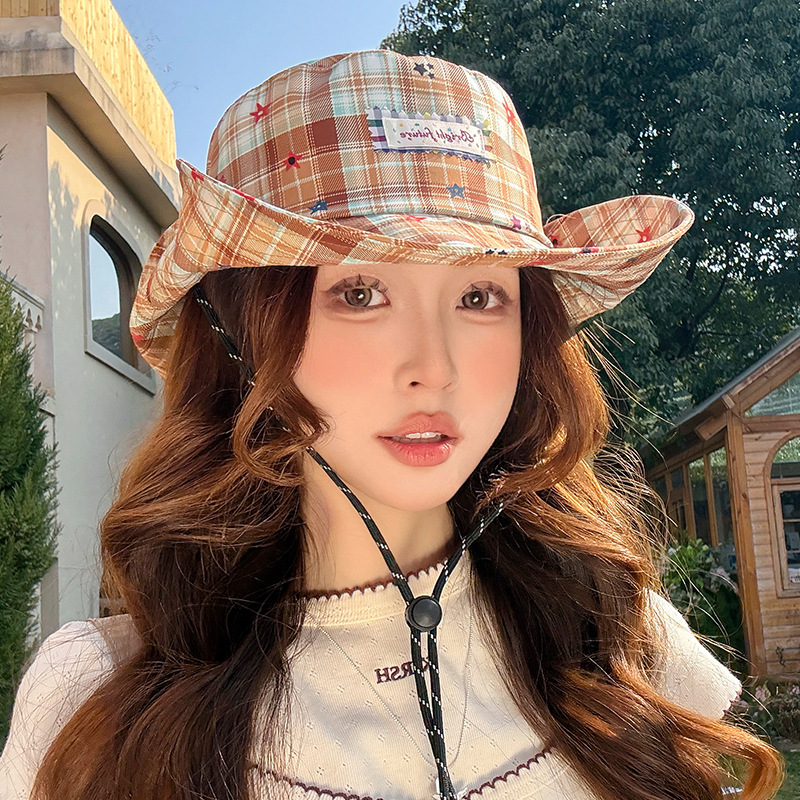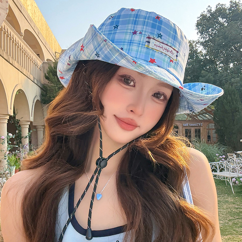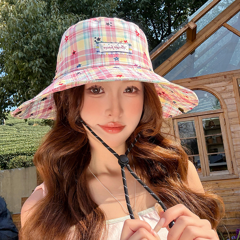 美式复古格纹渔夫帽女夏季遮阳防晒盆帽百搭显脸小星星刺绣大檐帽
