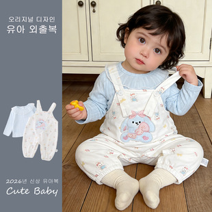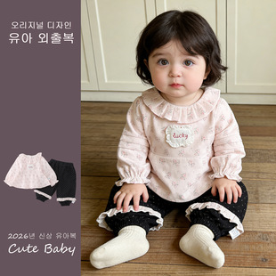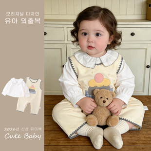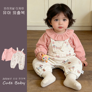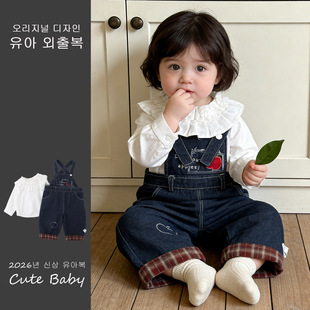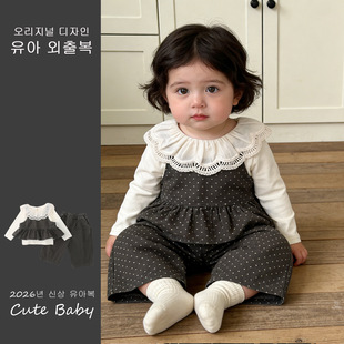 2026春装新款婴幼儿贴布背带裤套装女宝宝花边领打底衫外出两件套