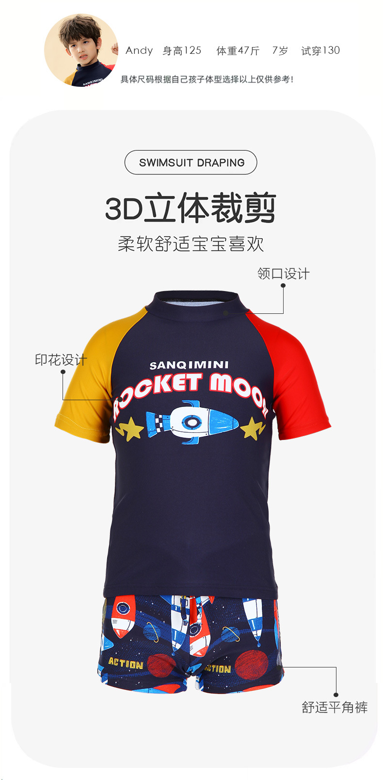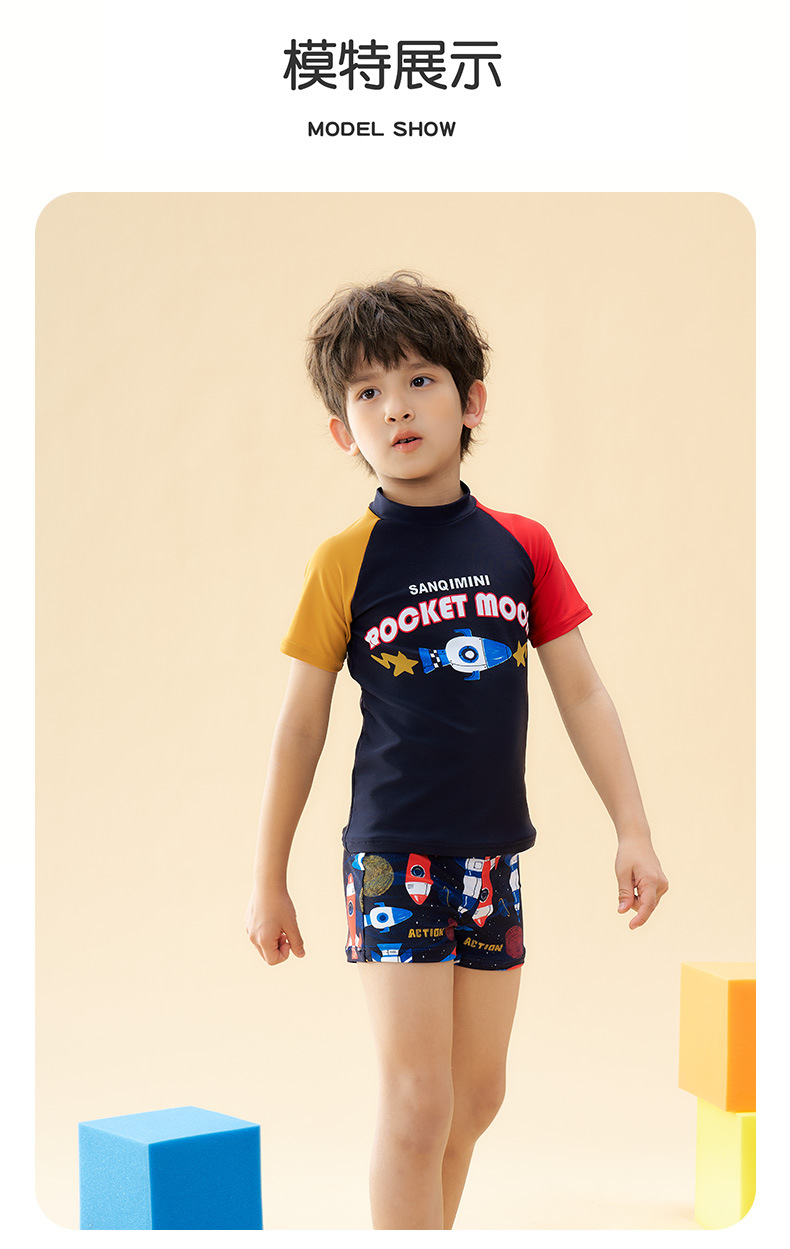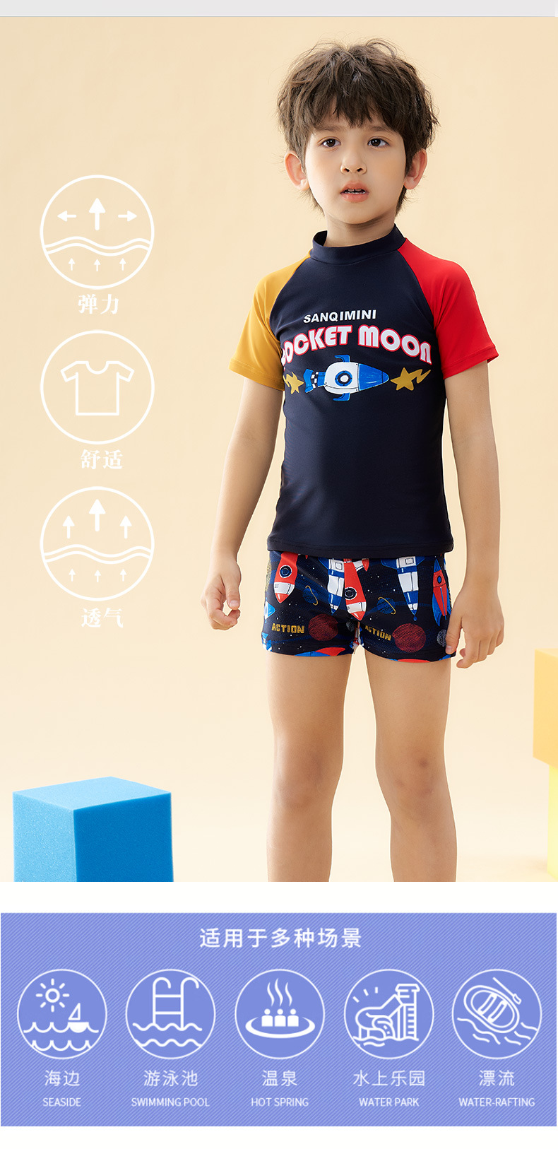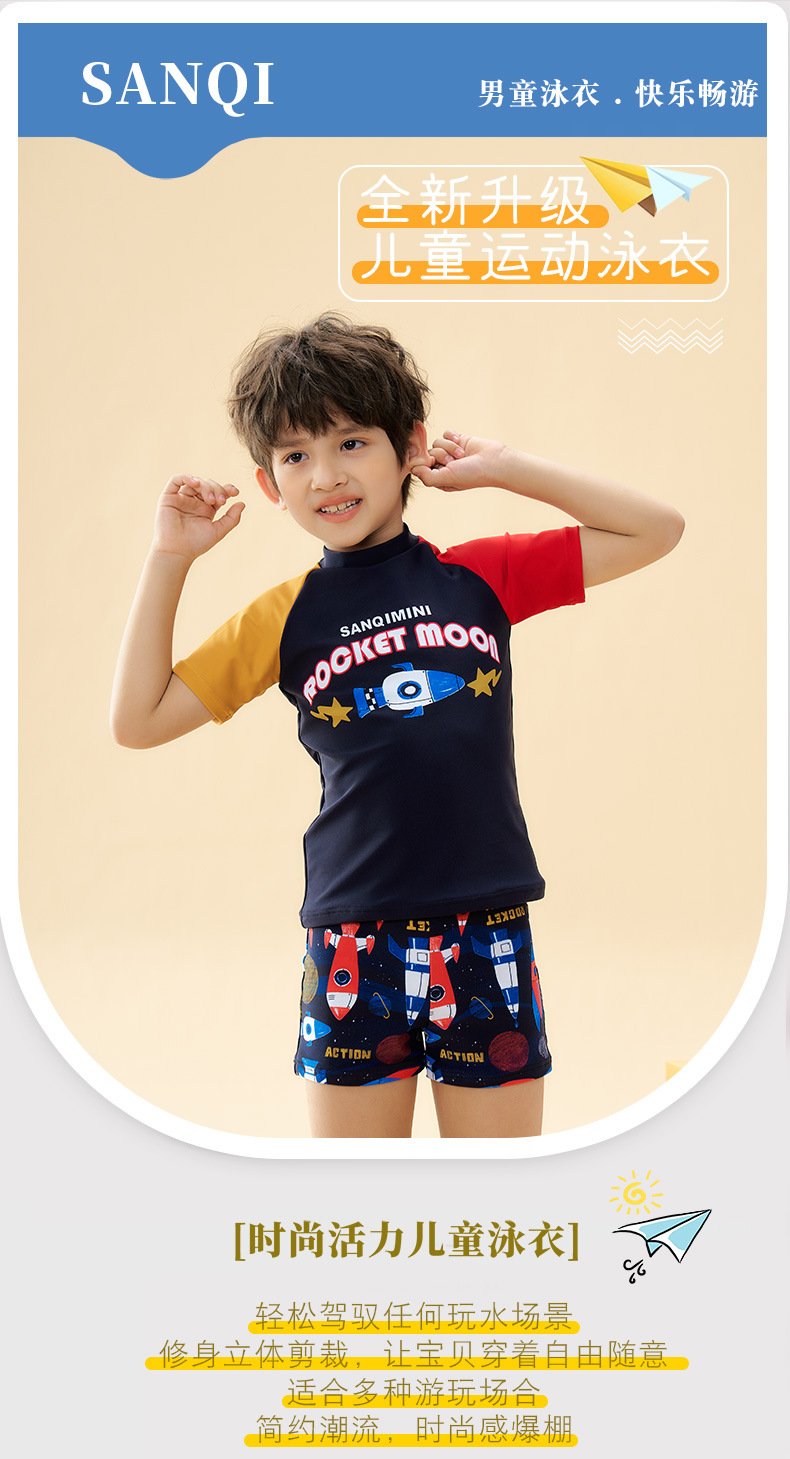 Sanqi 어린이 수영복 소년 스플릿 중형 및 대형 아동 수영복 2025 새로운 반팔 복서 속건성 소년 수영복