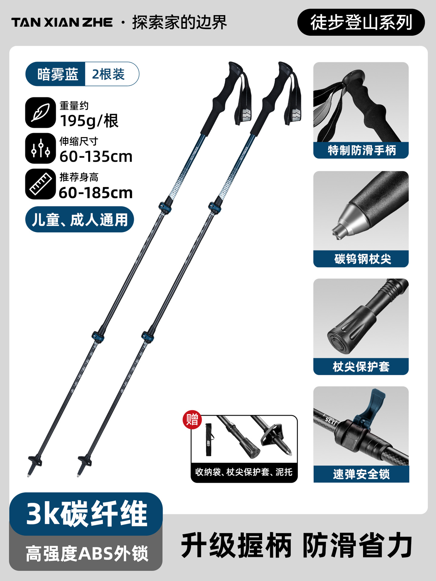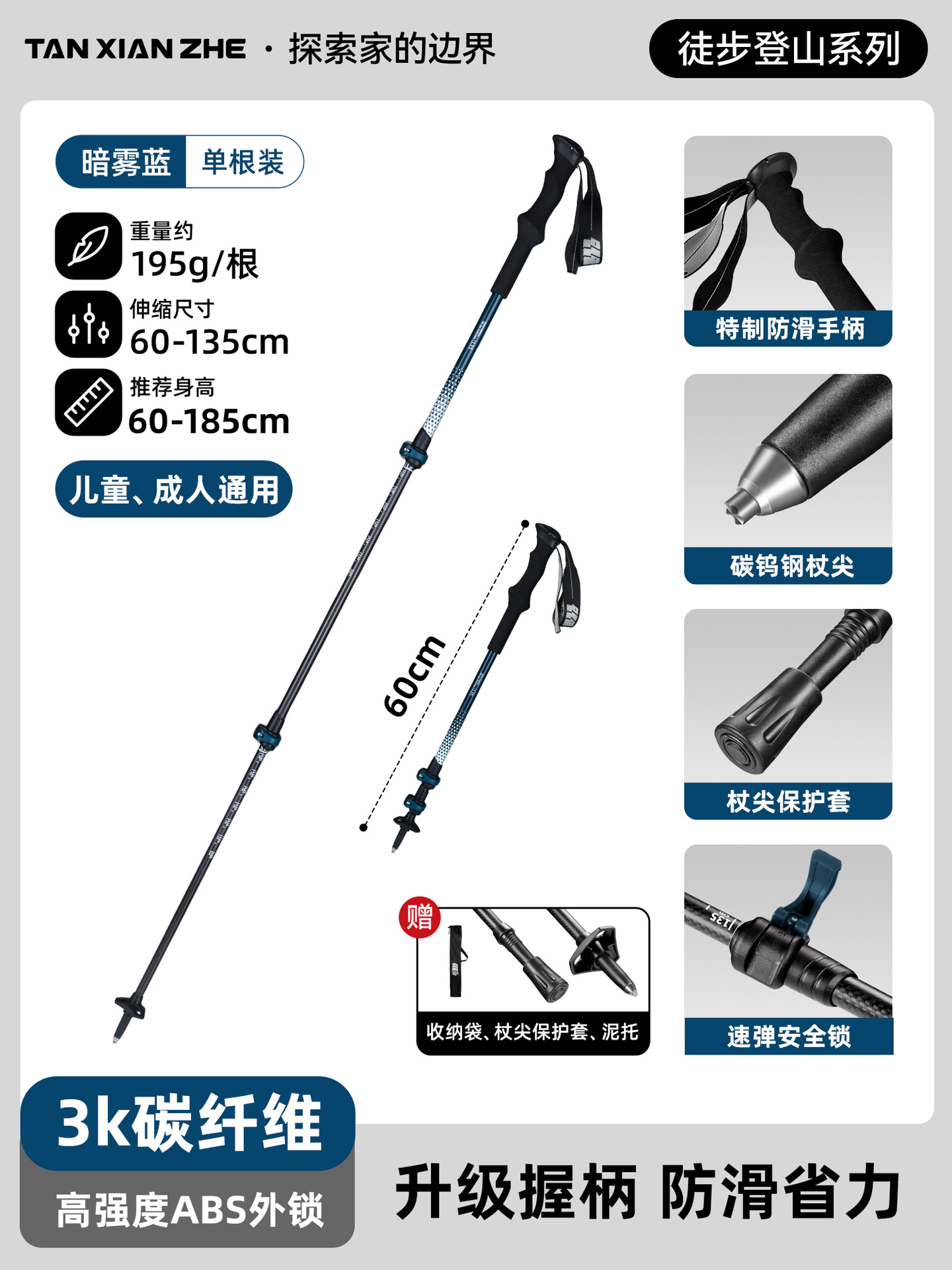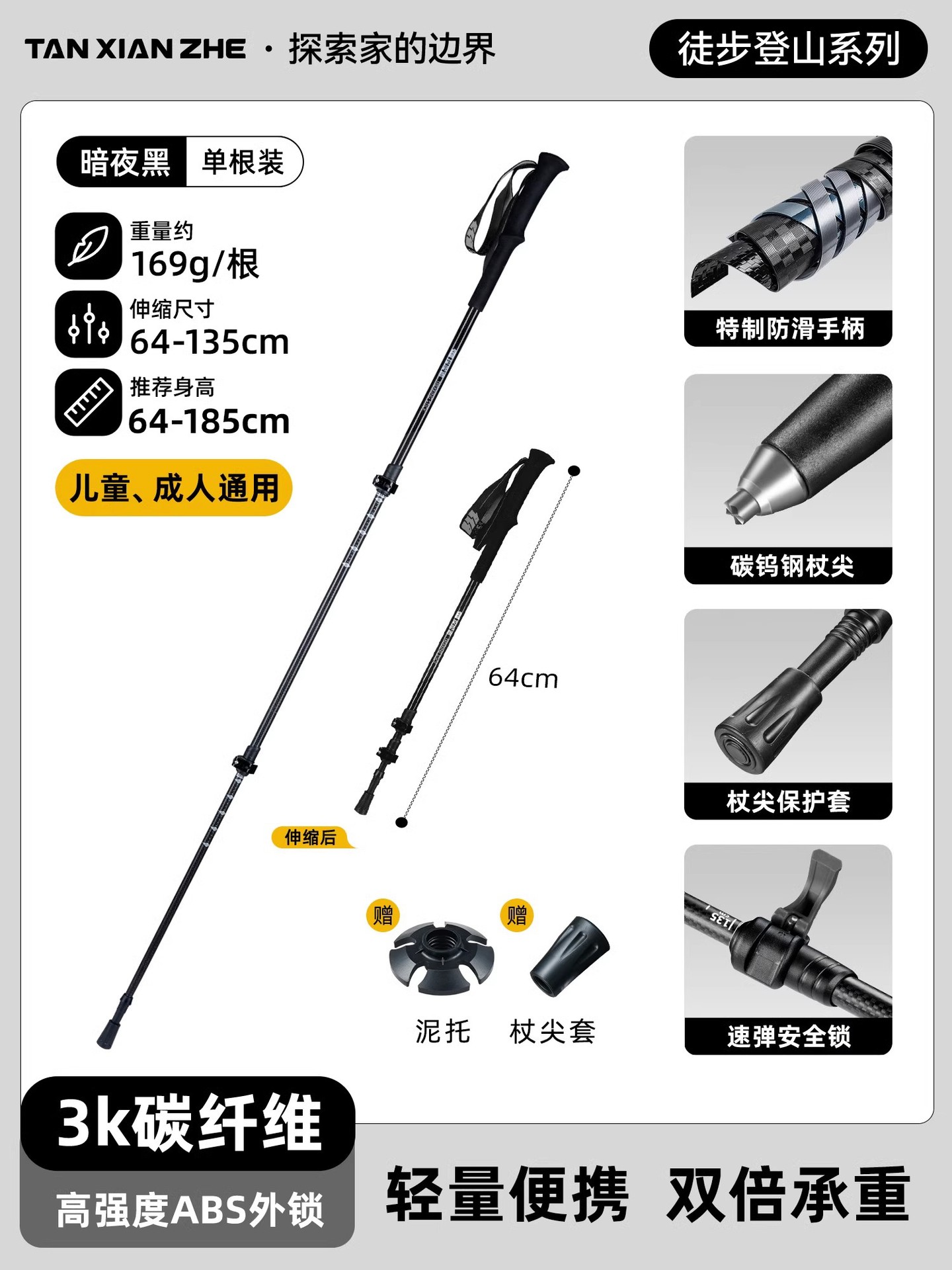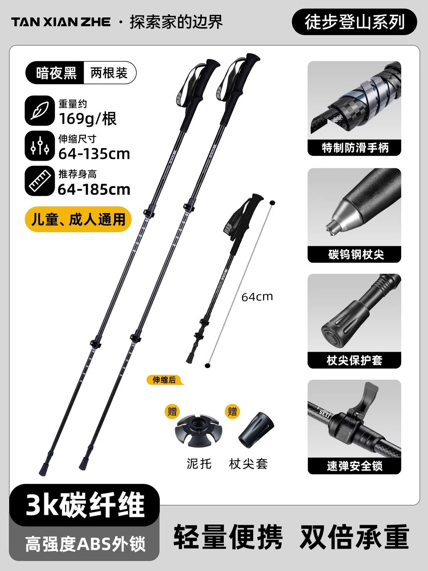 • 카본 컬러 [탄소섬유 접이식 트레킹 폴] 탄소강 합금 폴 팁 - 무게 206g에 불과