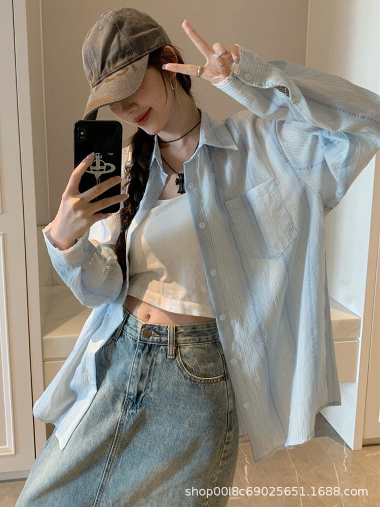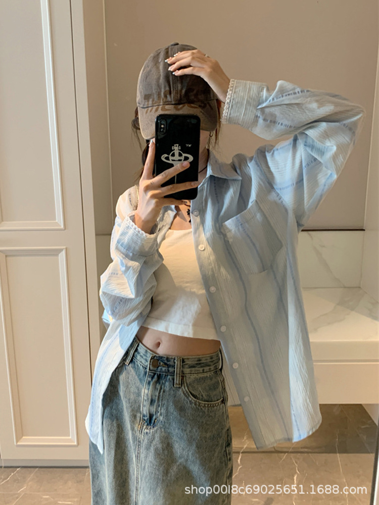 한국 스타일 레이스 바느질 줄무늬 긴팔 셔츠 여성의 봄 및 여름 태양 보호 의류 느슨한 적합 슬리밍 디자인 할로우 아웃 코트스토어 가기