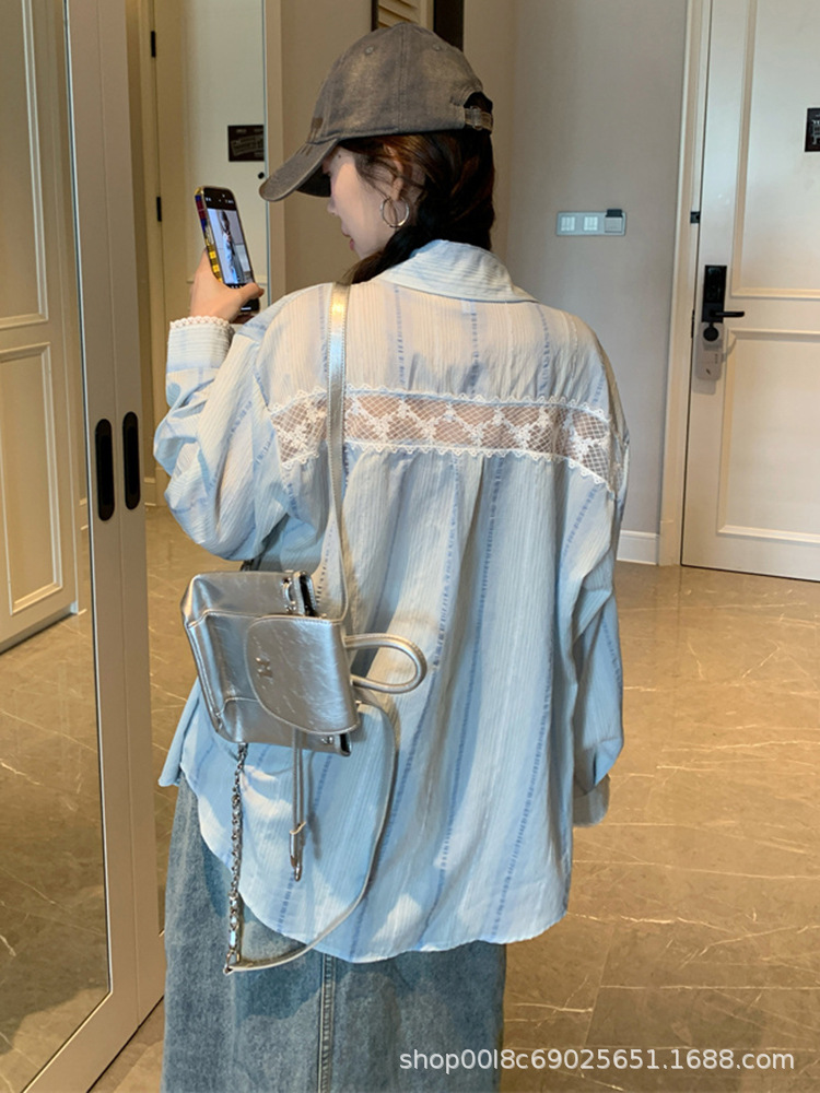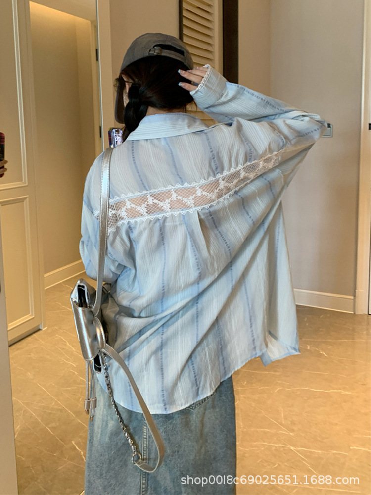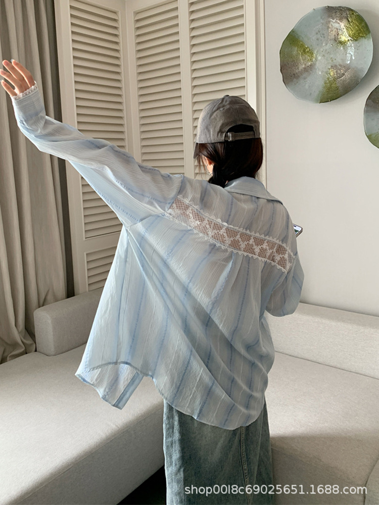 한국 스타일 레이스 바느질 줄무늬 긴팔 셔츠 여성의 봄 및 여름 태양 보호 의류 느슨한 적합 슬리밍 디자인 할로우 아웃 코트