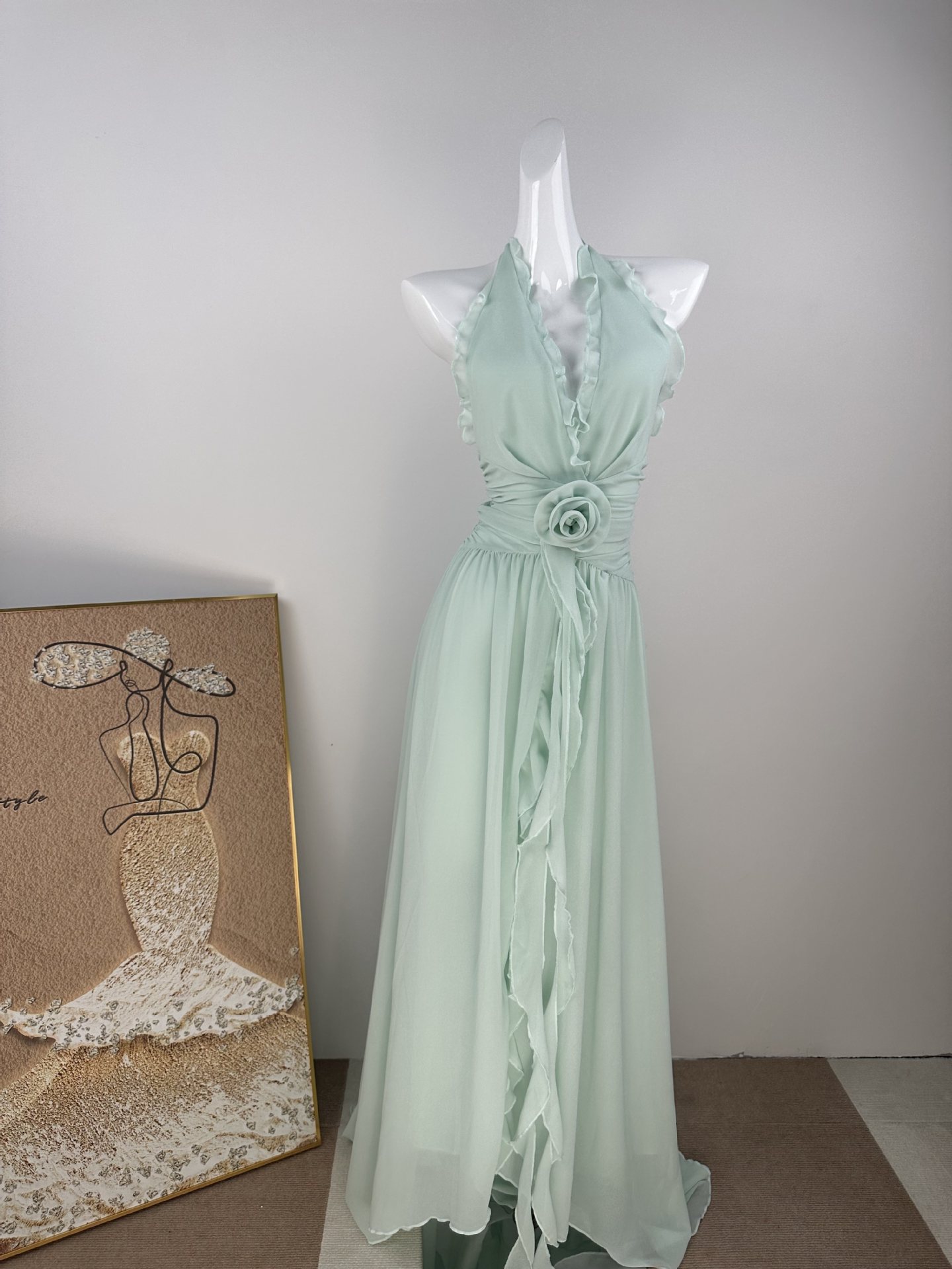 프랑스 스타일 휴가 스타일 V 넥 교수형 목 귀 주름 원피스 쉬폰 3 차원 꽃 백리스 섹시한 저녁 원피스