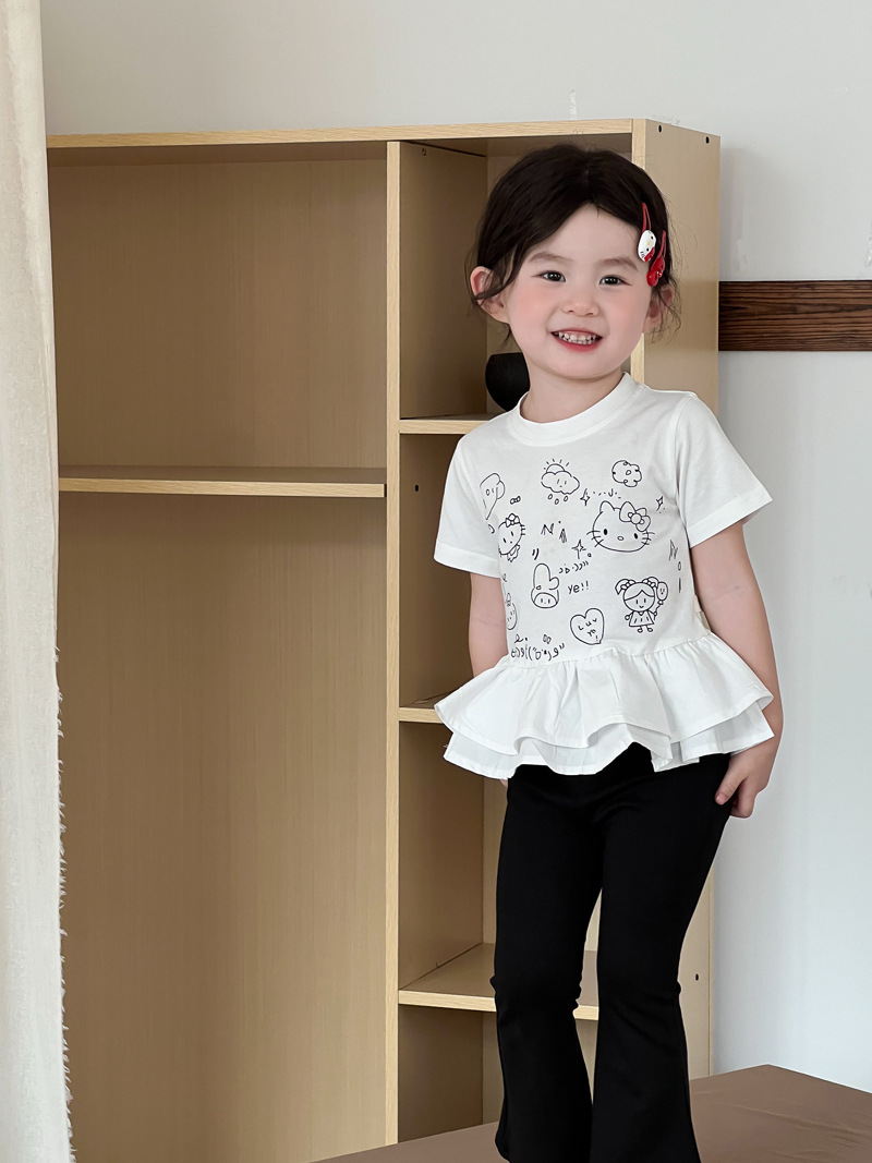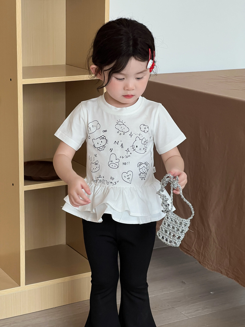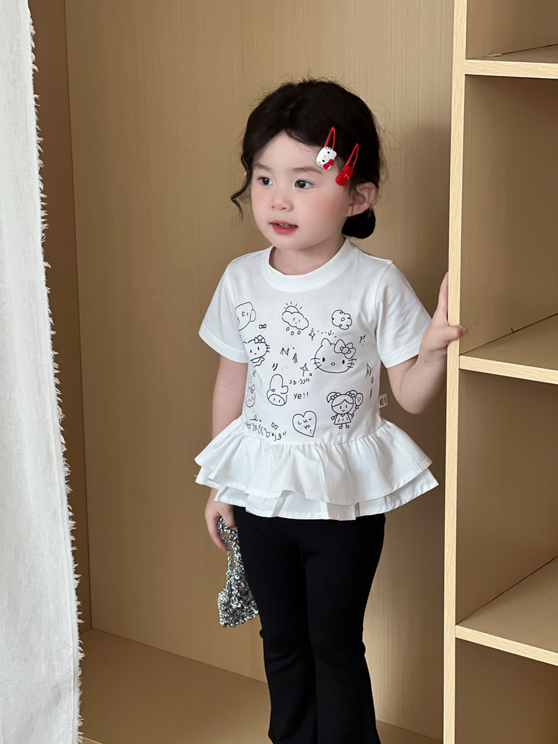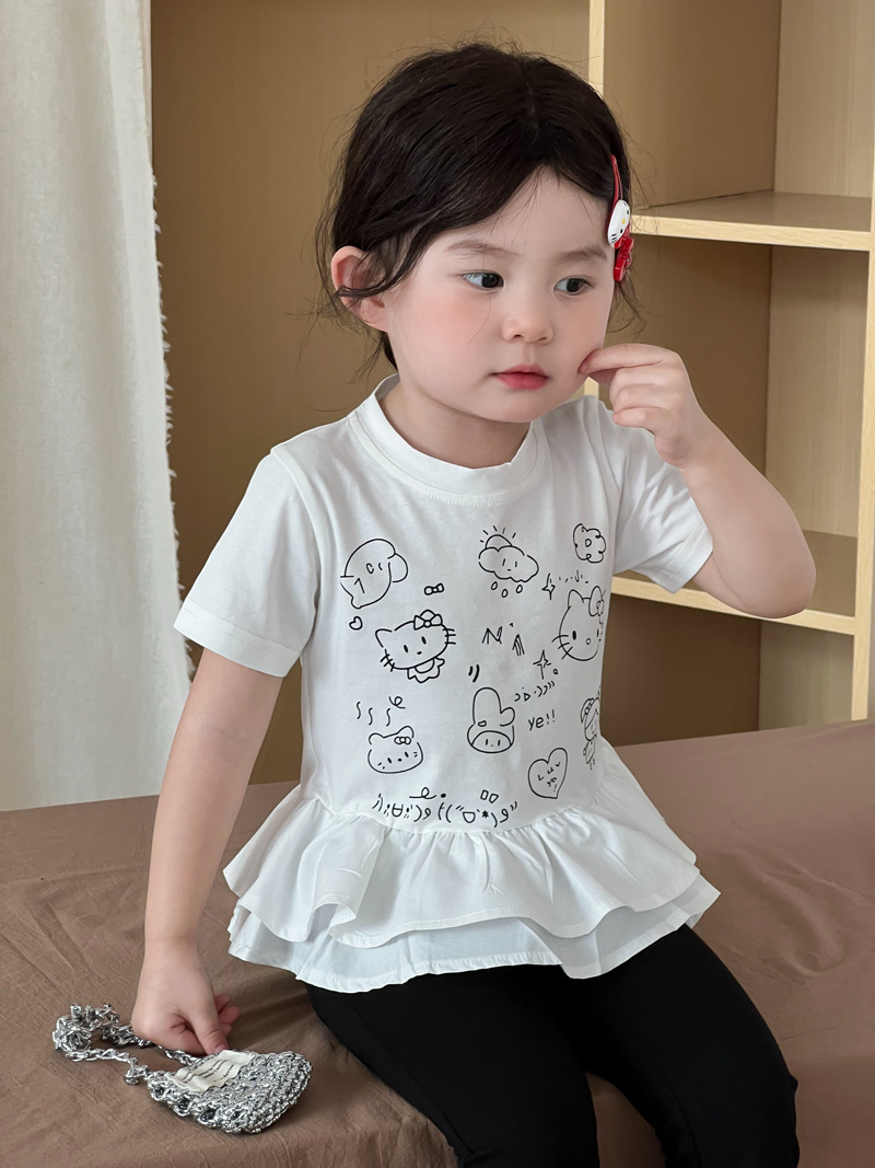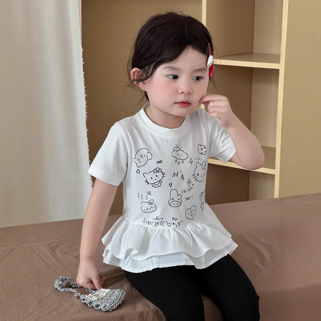2025 년 여름 새 아동복 한국 소녀 귀여운 새끼 고양이 주름 밑단 티셔츠 어린이 만화 반팔 T