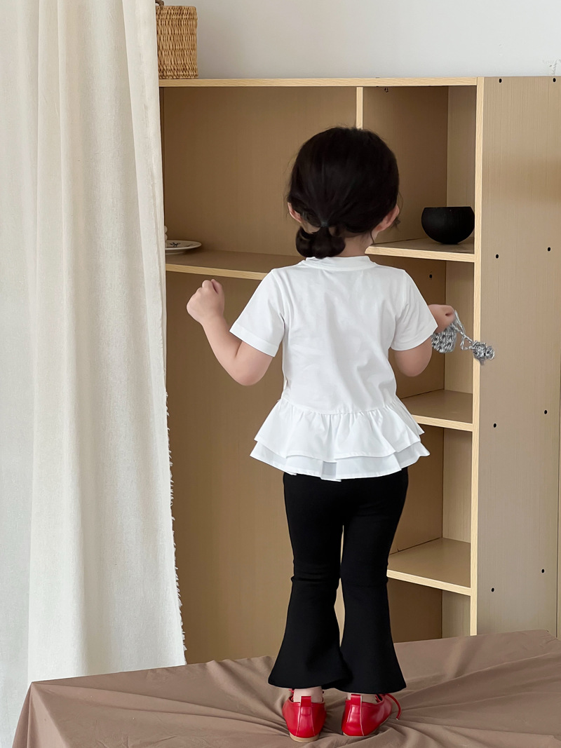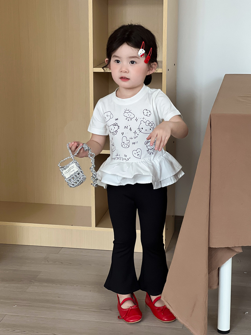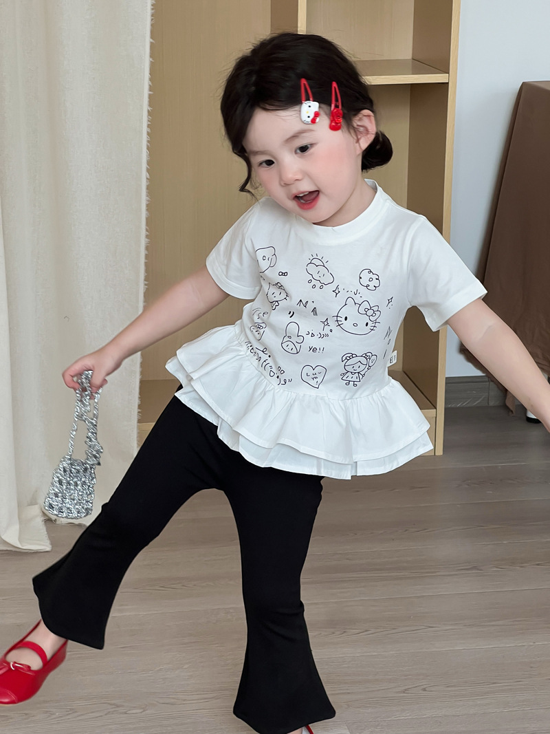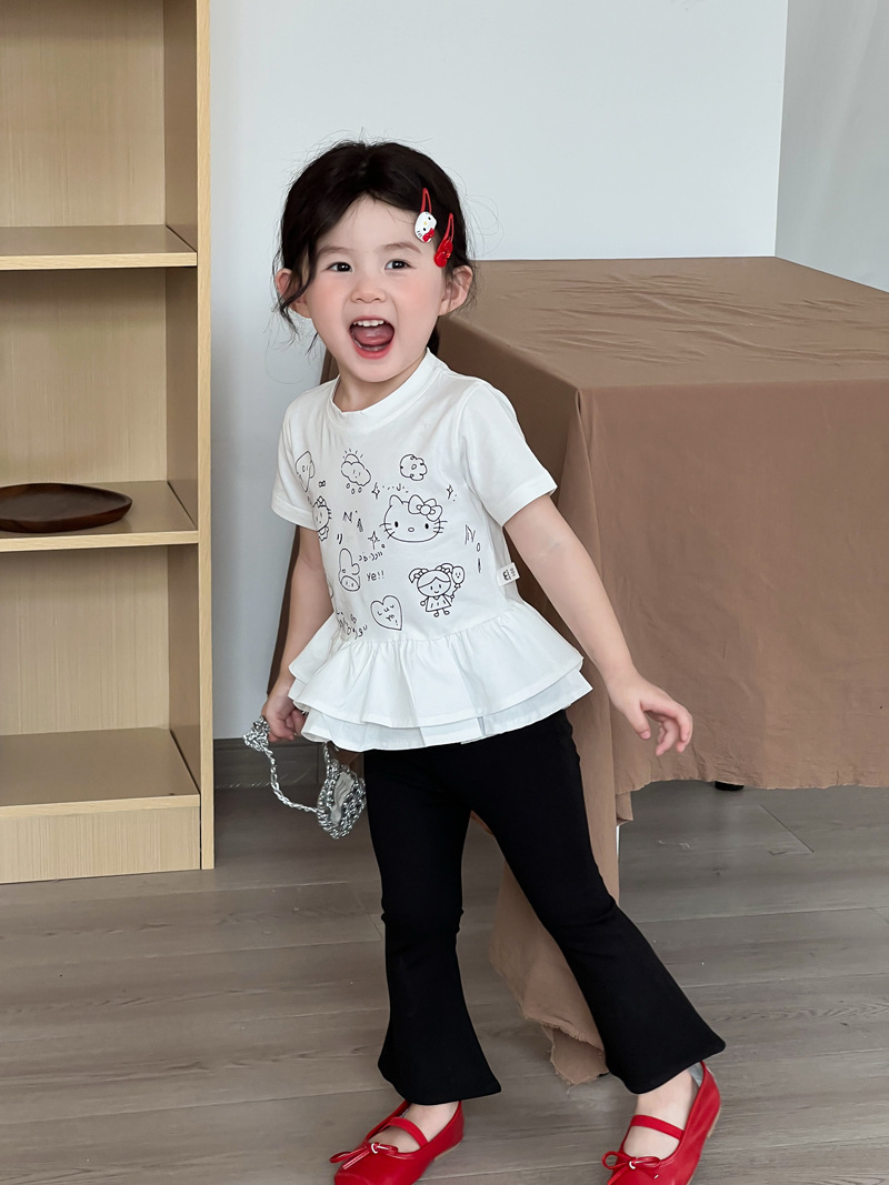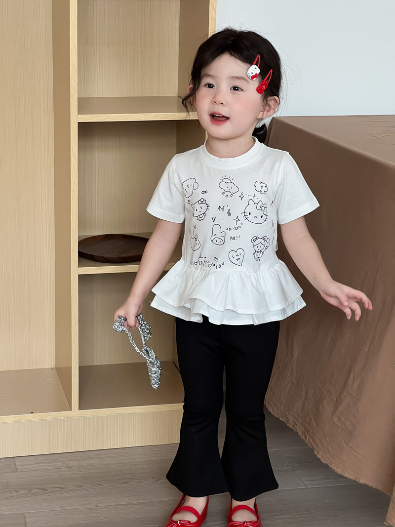 2025 년 여름 새 아동복 한국 소녀 귀여운 새끼 고양이 주름 밑단 티셔츠 어린이 만화 반팔 T