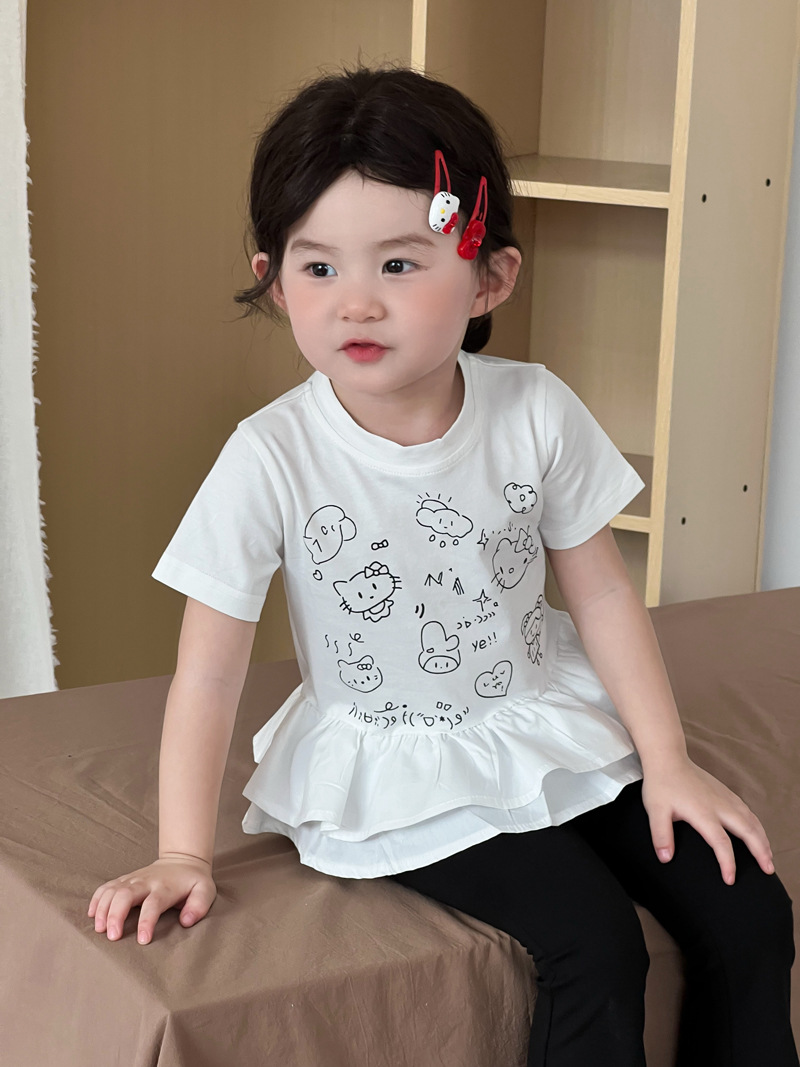 2025 년 여름 새 아동복 한국 소녀 귀여운 새끼 고양이 주름 밑단 티셔츠 어린이 만화 반팔 T스토어 가기