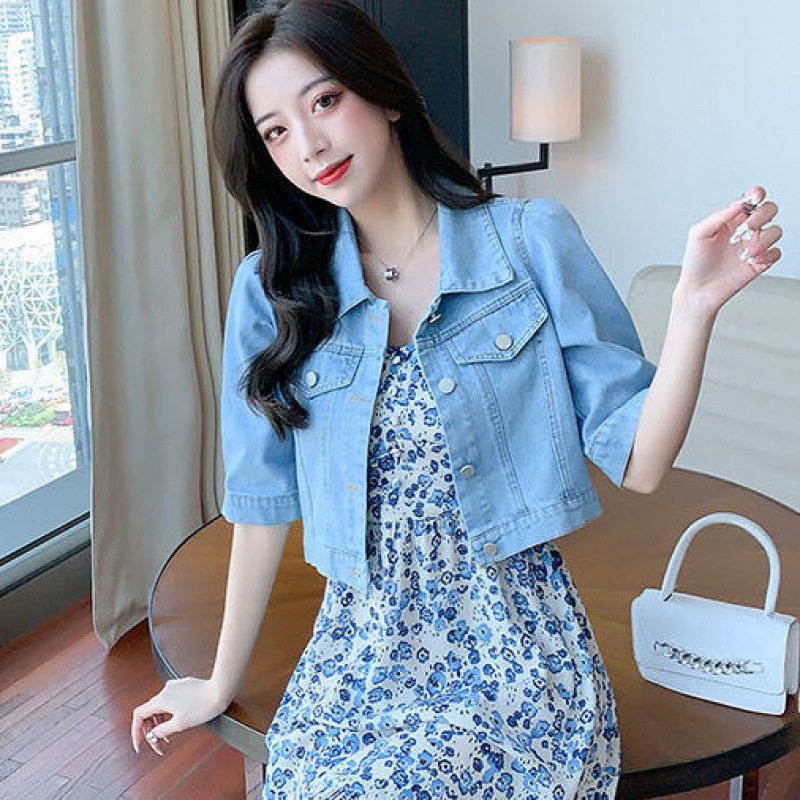 여성을위한 레트로 짧은 데님 재킷 봄과 여름 새로운 한국 스타일 느슨한 다목적 슬리브 중공 외부 탑 재킷스토어 가기