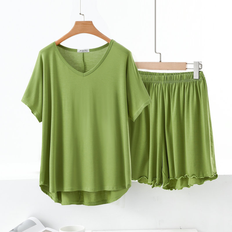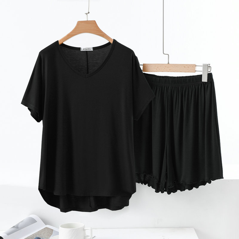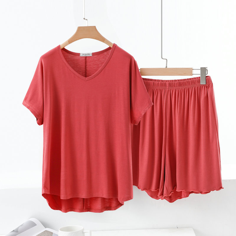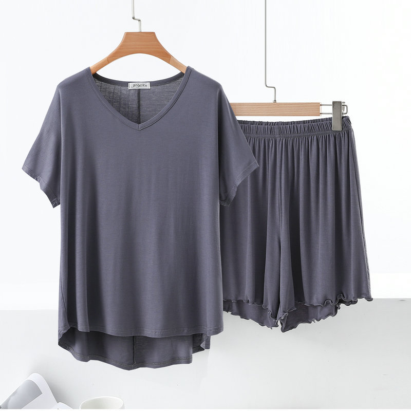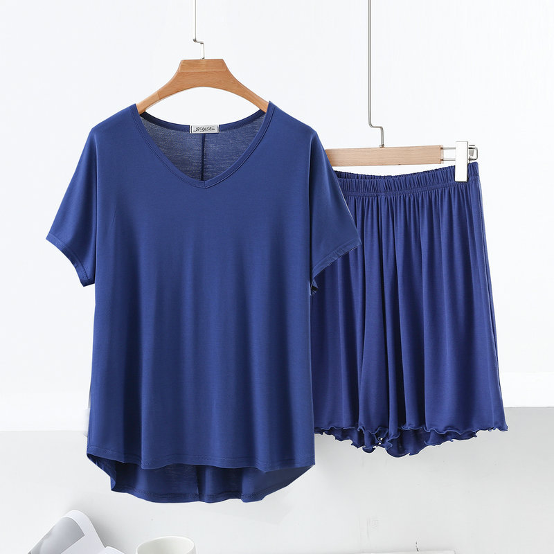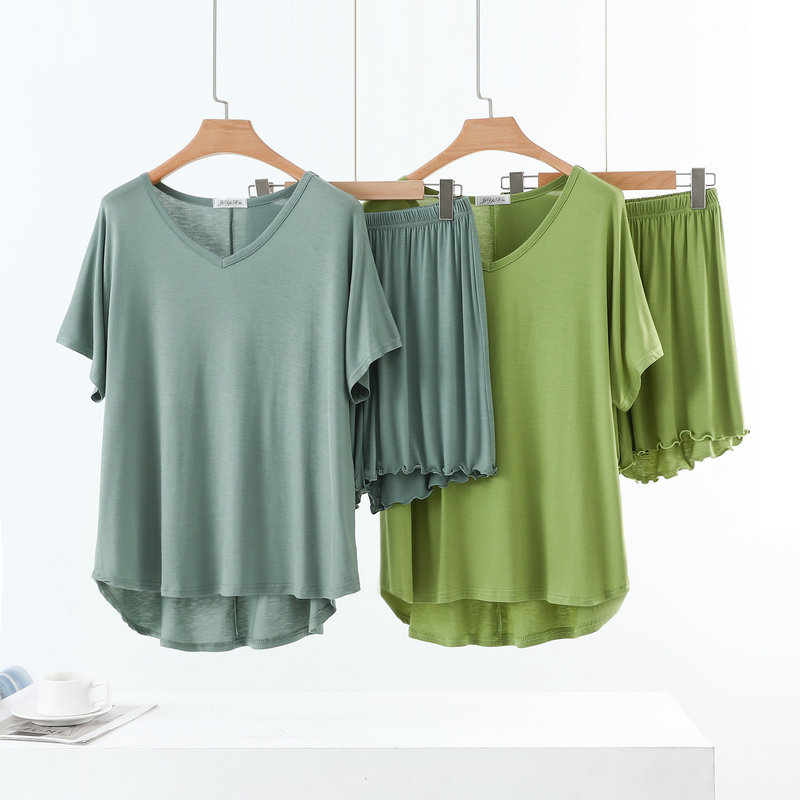 국경 간 Bitmian 여성용 여름 홈 의류 파자마 여름 얇은 풀오버 V-넥 반팔 반바지 플러스 사이즈 세트