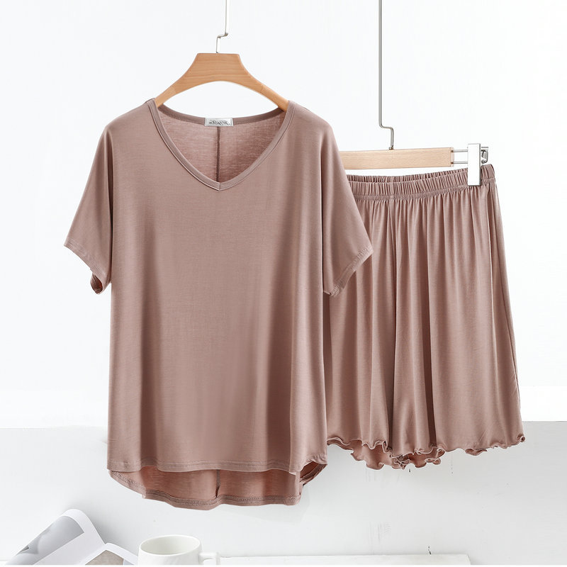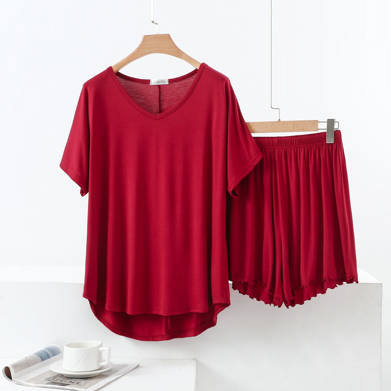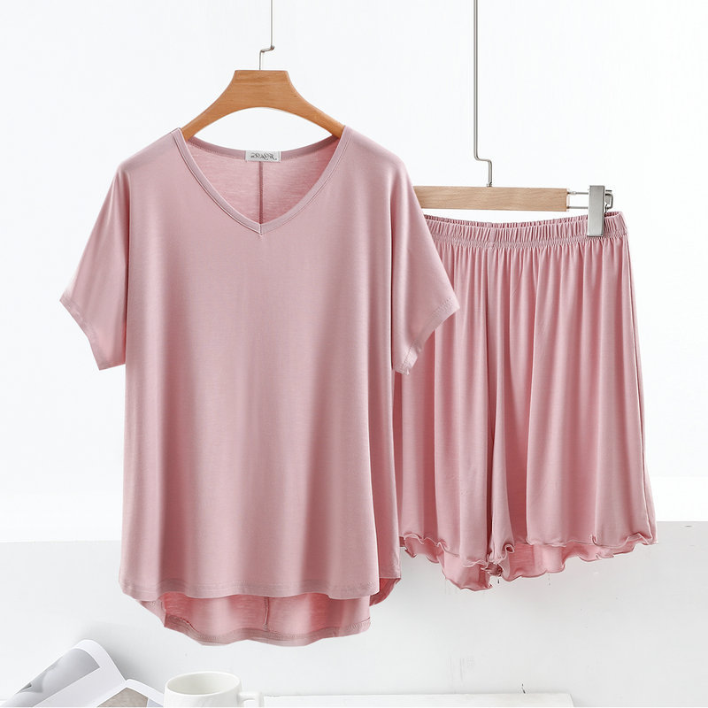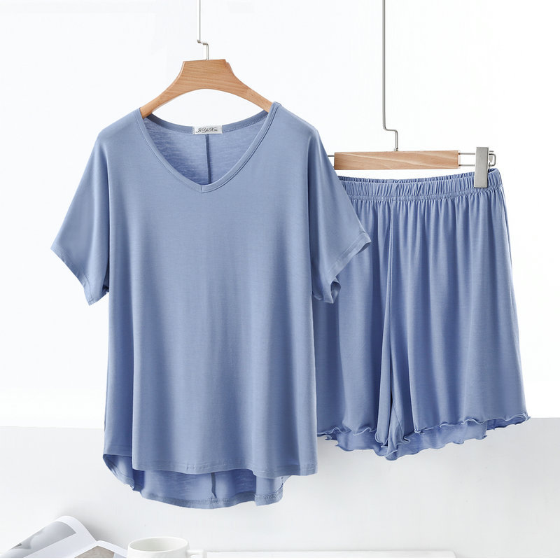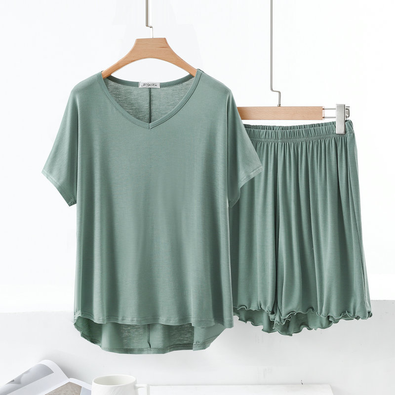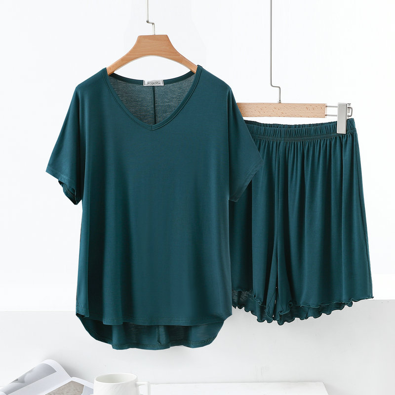 국경 간 Bitmian 여성용 여름 홈 의류 파자마 여름 얇은 풀오버 V-넥 반팔 반바지 플러스 사이즈 세트