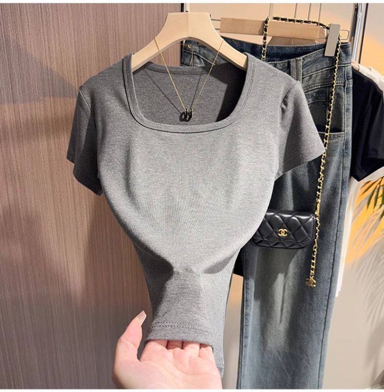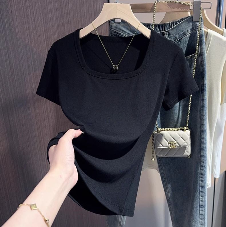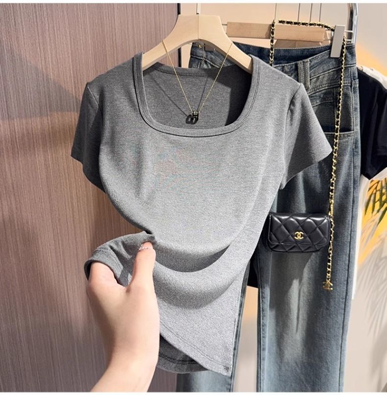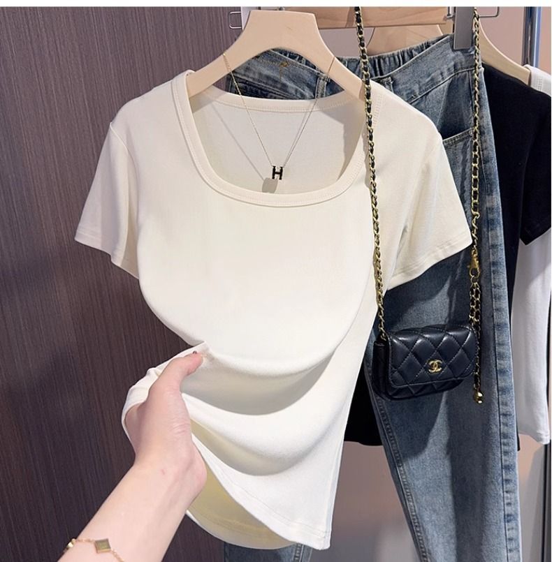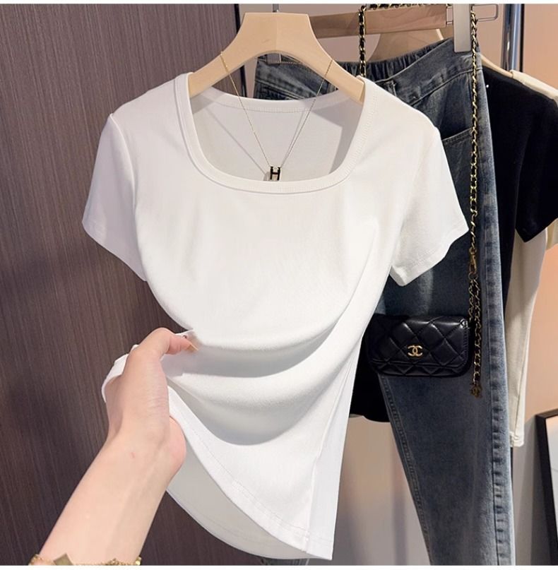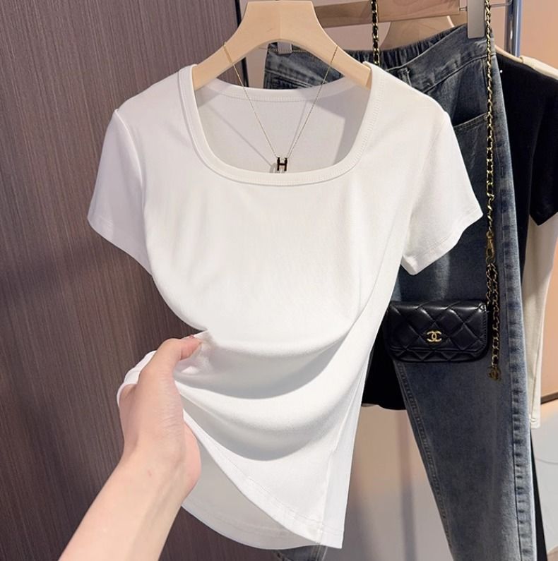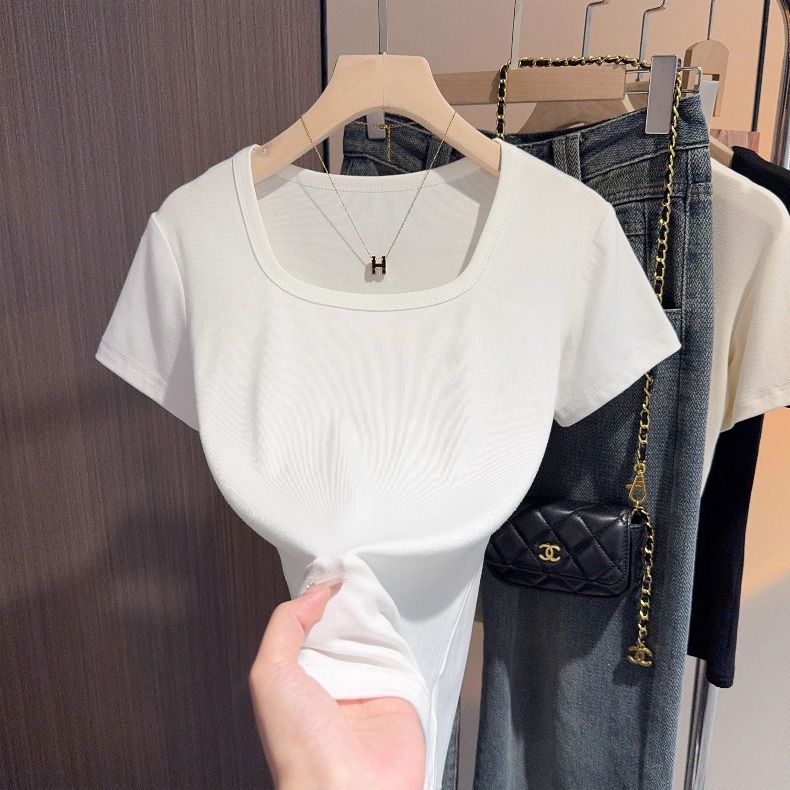 화이트 스퀘어 넥 티셔츠 여성 반팔 2025 여름 신작 달콤한 연령 감소 하이 엔드 슬림 피트 로우 넥 탑스토어 가기