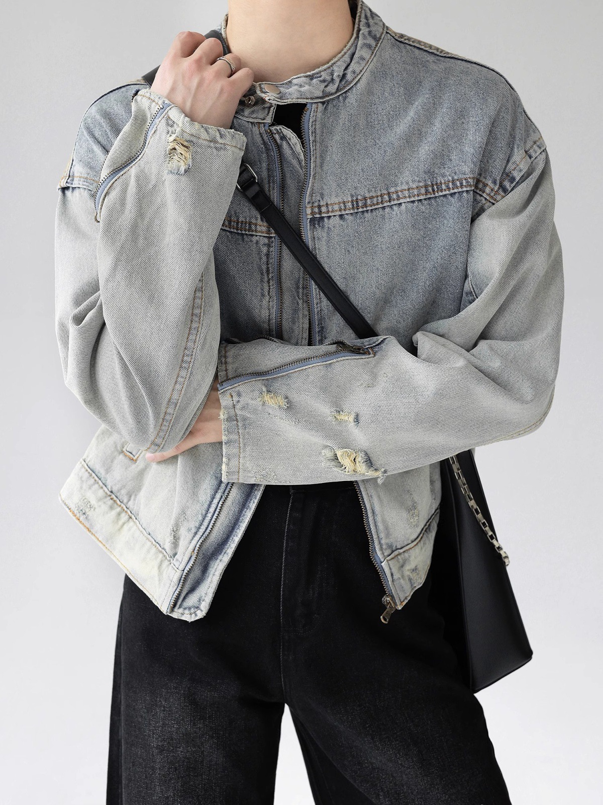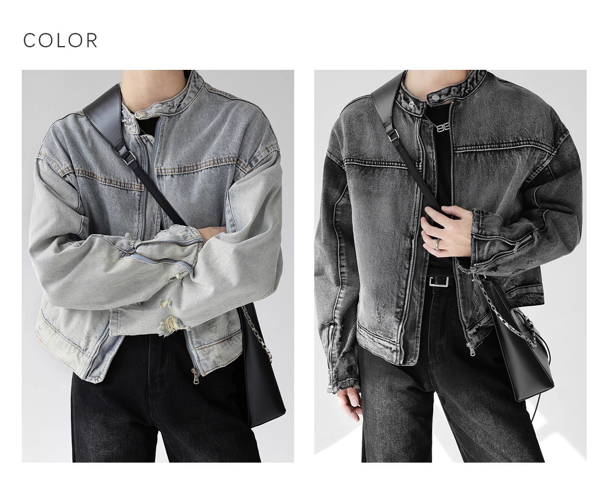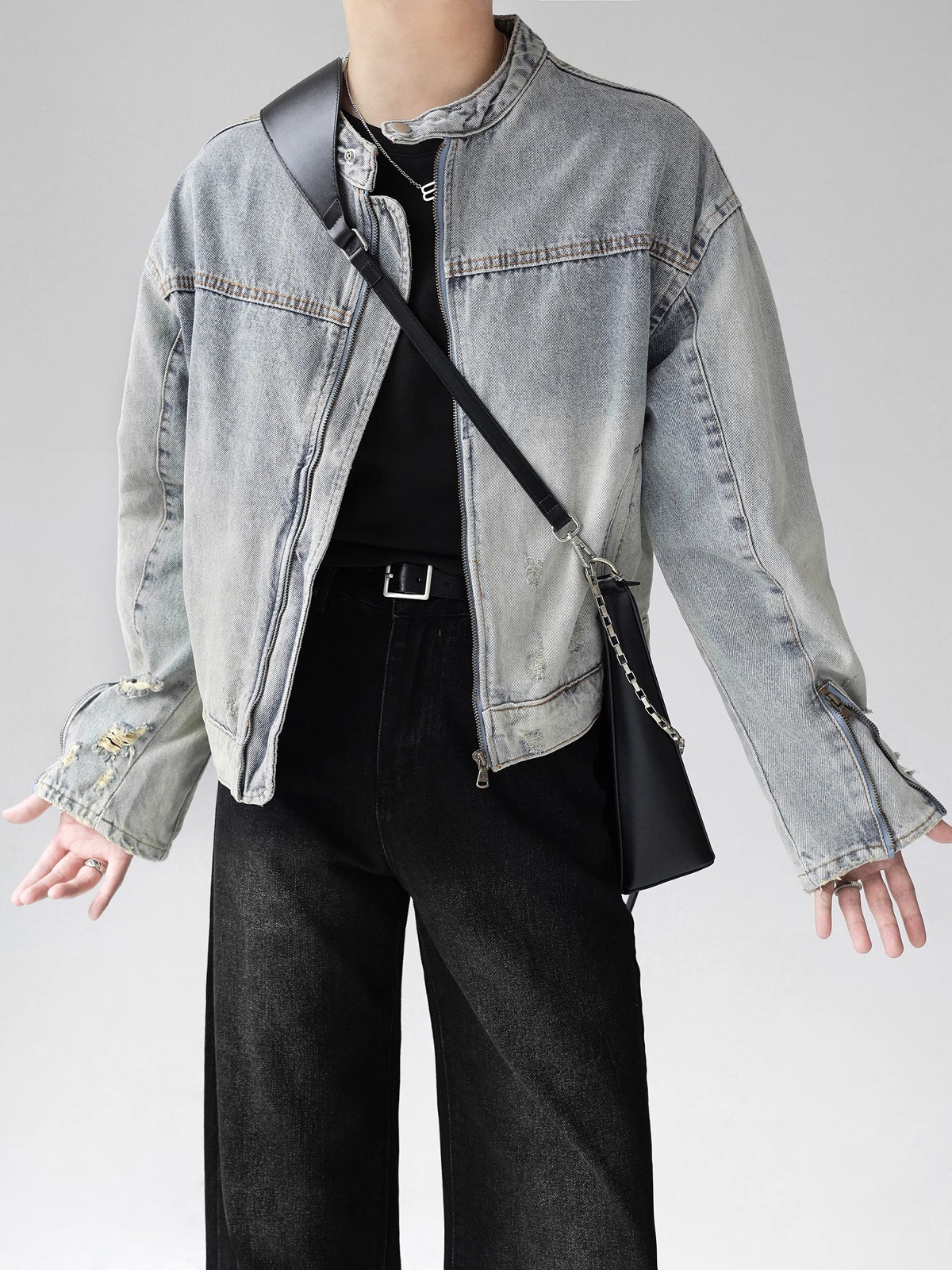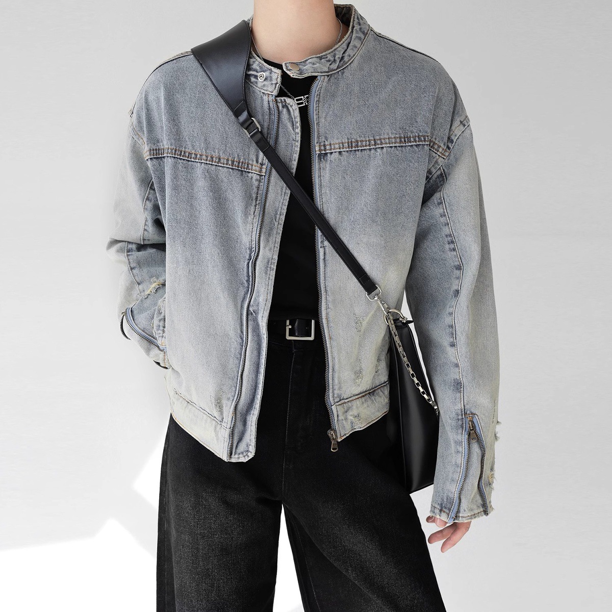 봄, 가을 남성용 아메리칸 하이 스트리트 하이엔드 핸섬 데님 재킷 새로운 스타일 워싱 및 디스트레스드 루즈하고 다재다능한 짧은 재킷스토어 가기