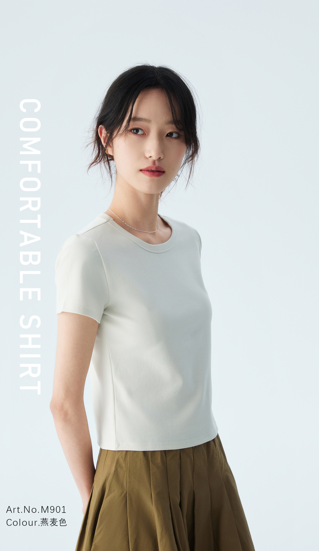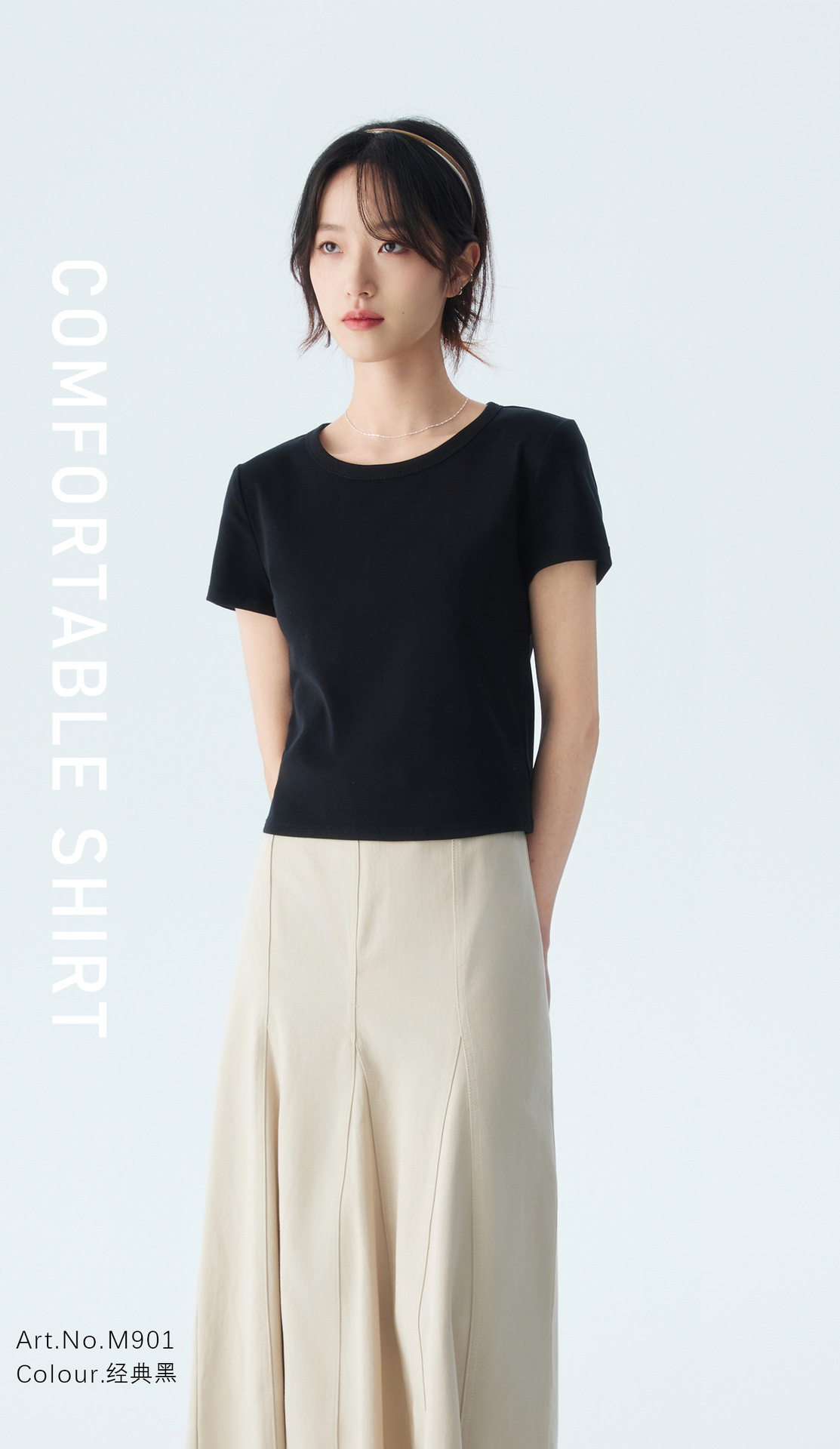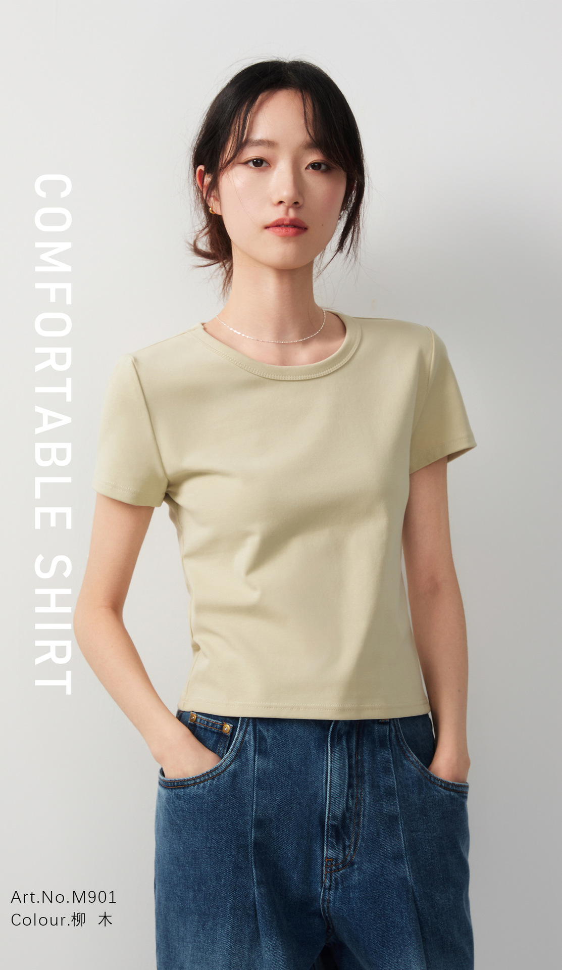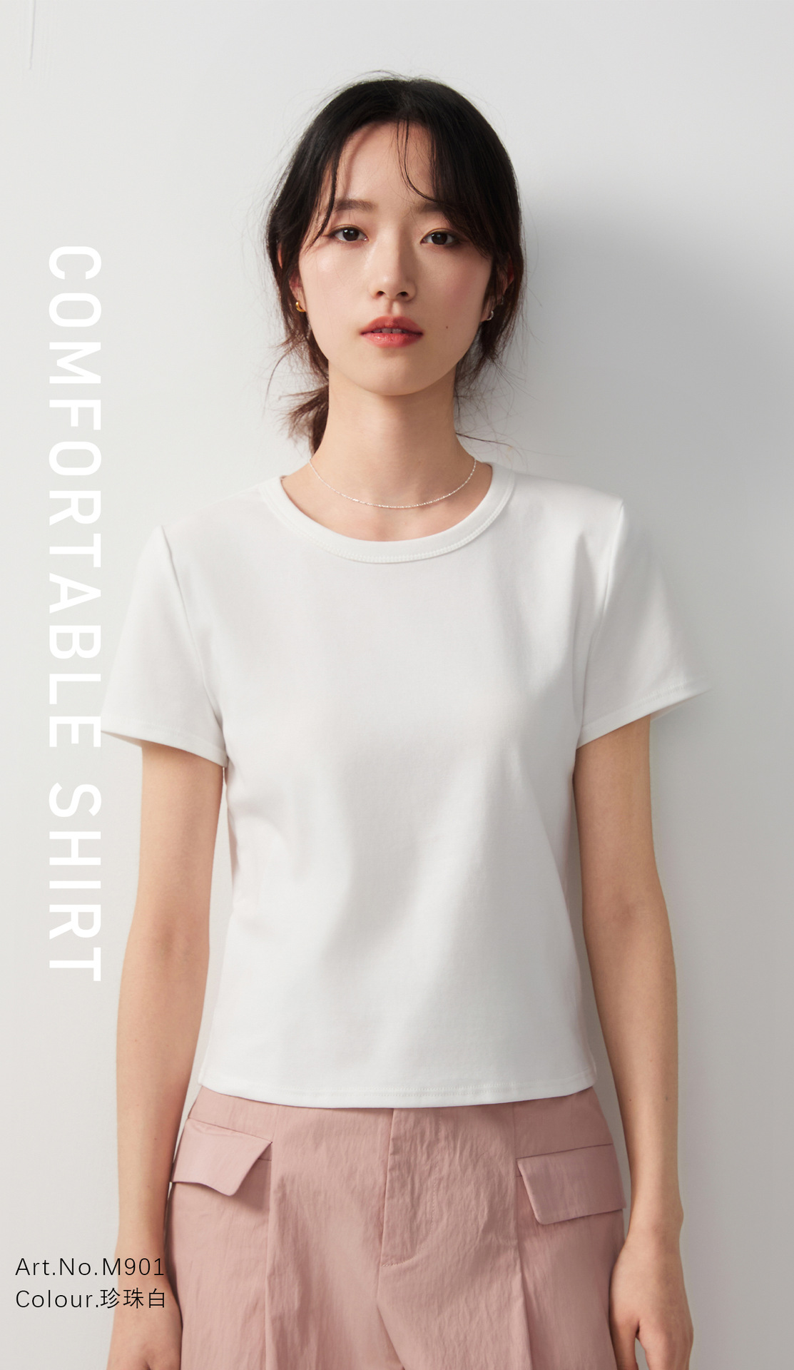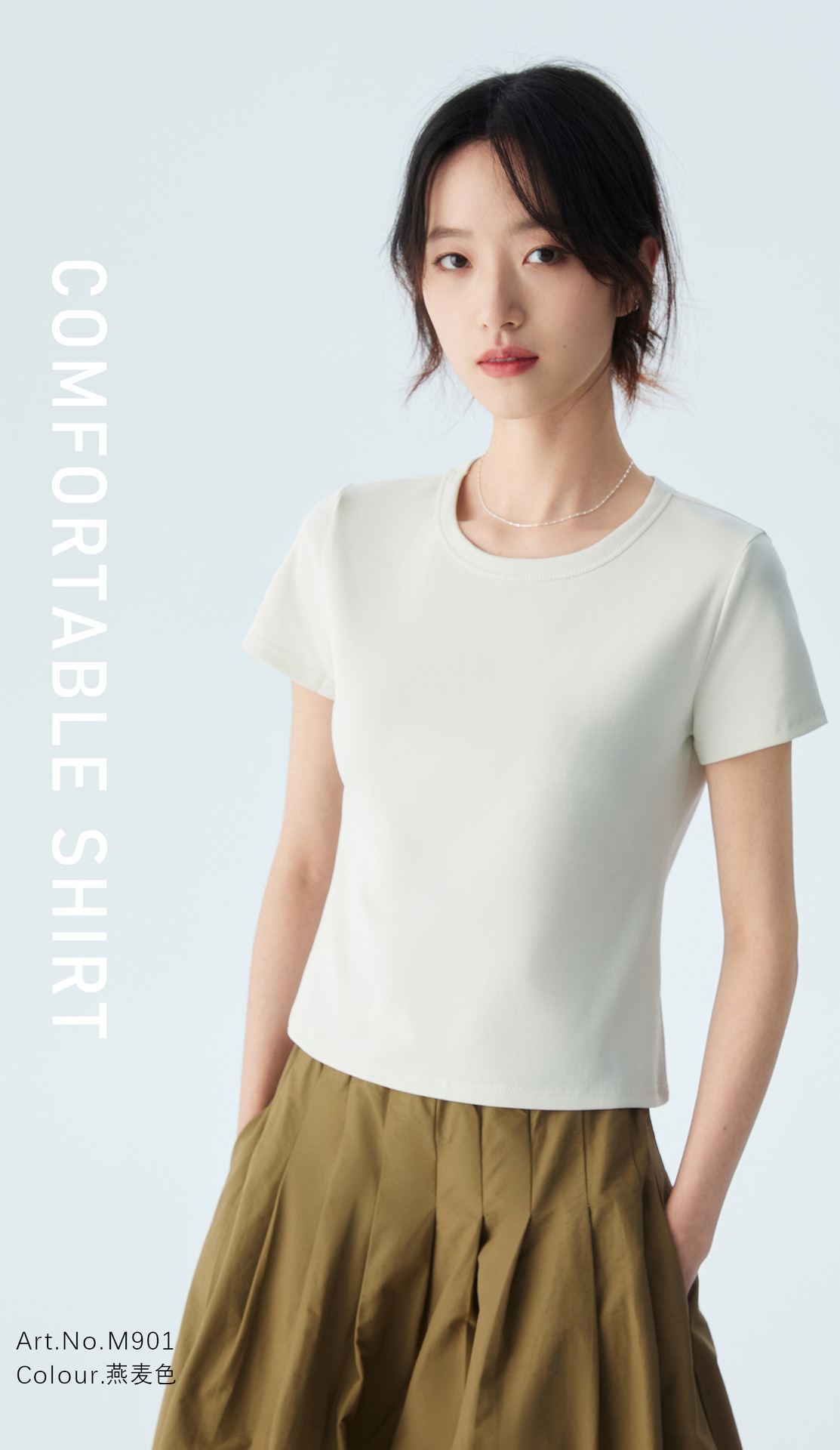 2025 봄과 여름 간단한 패션 단색 짧은 소매 어깨 둥근 목 탑 티셔츠