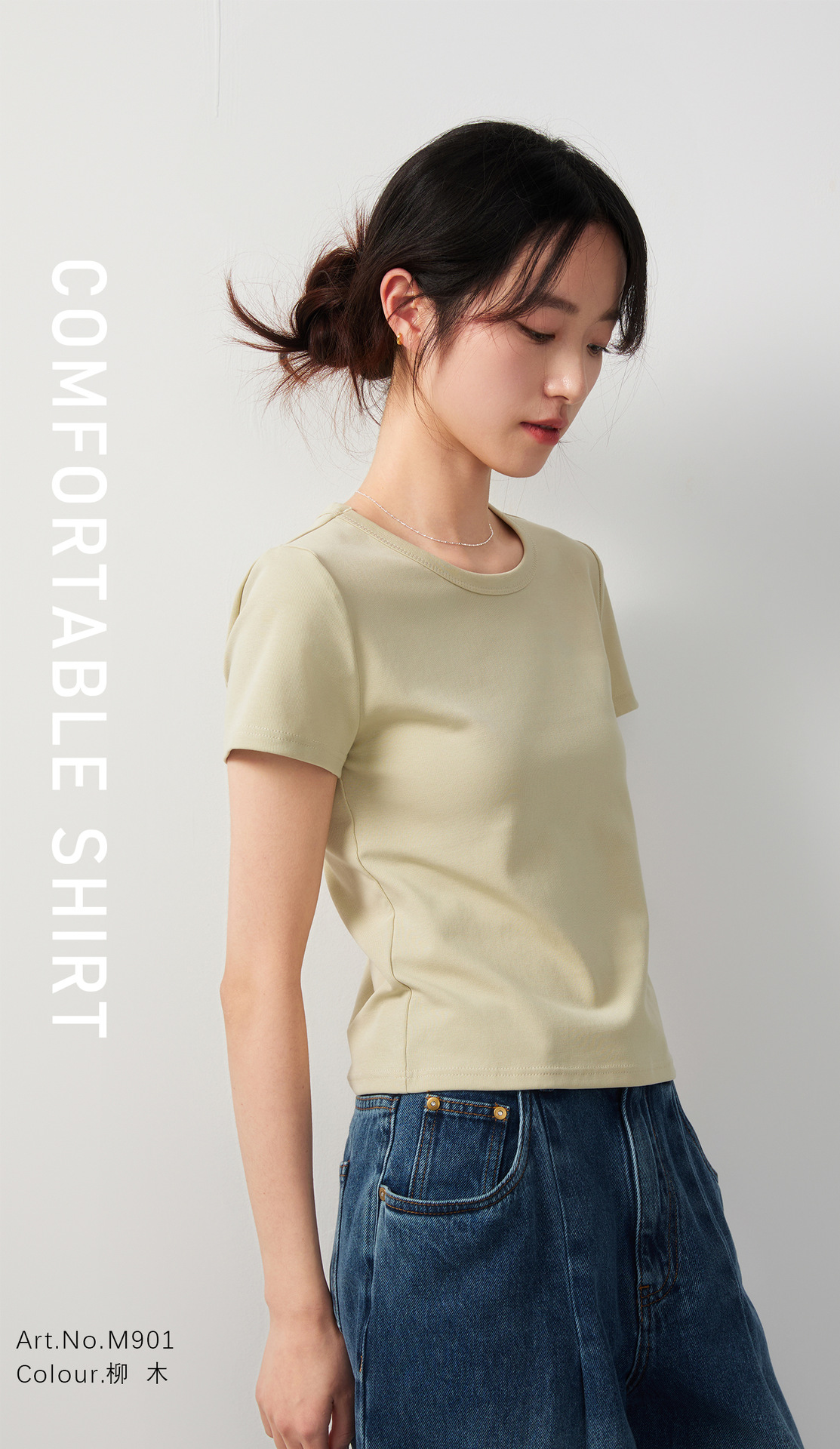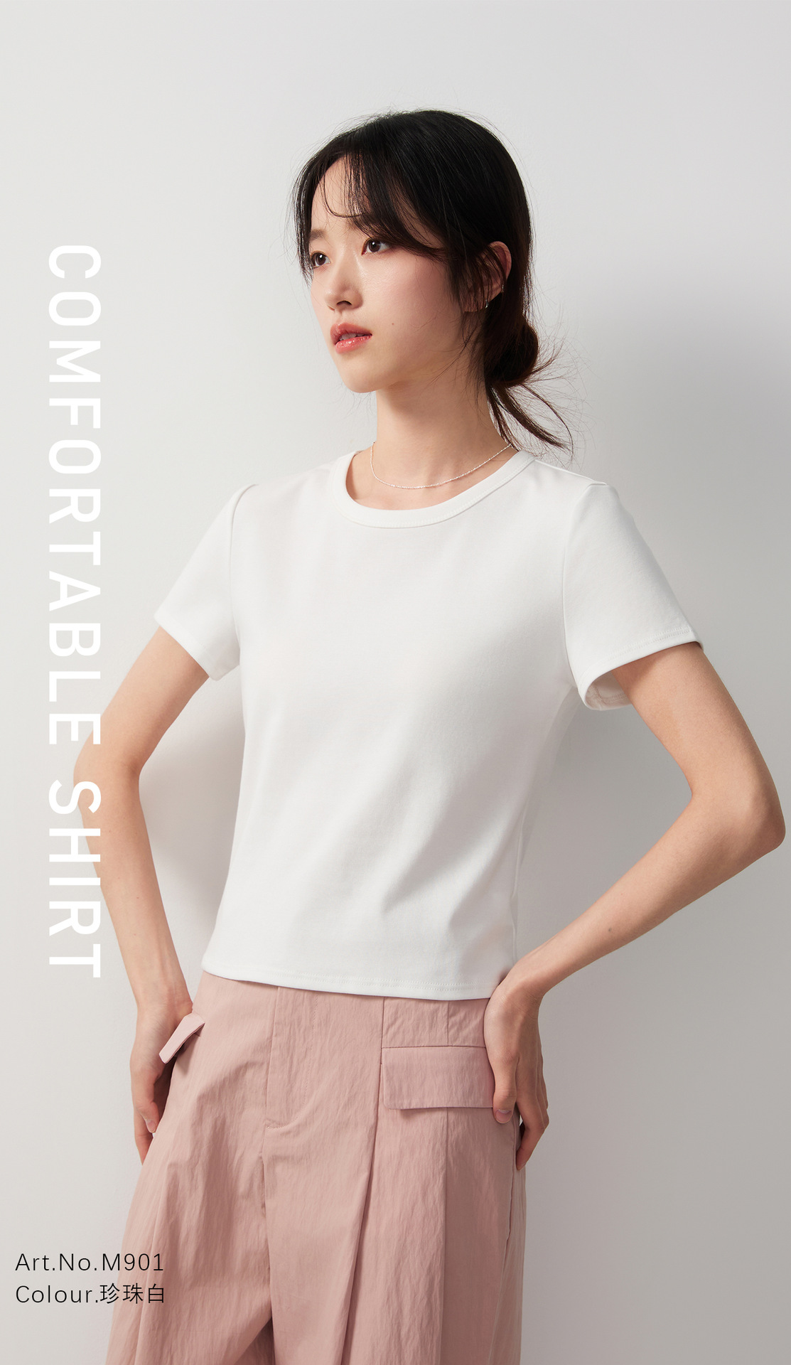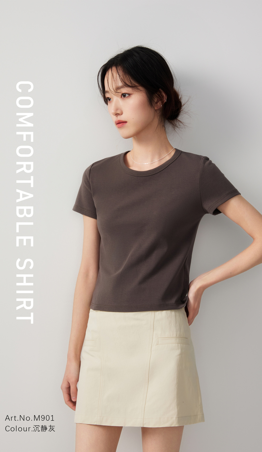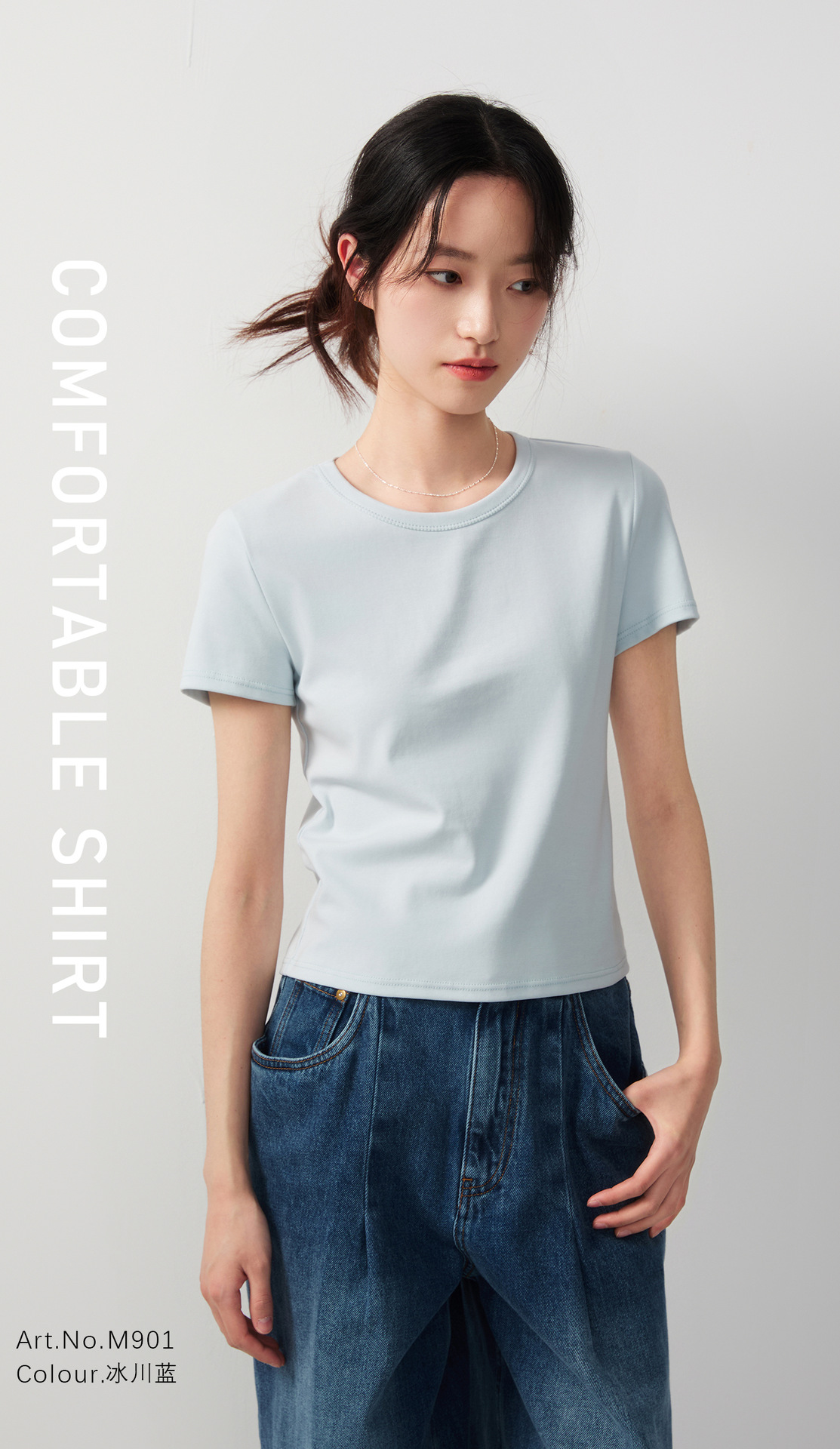 2025 봄과 여름 간단한 패션 단색 짧은 소매 어깨 둥근 목 탑 티셔츠