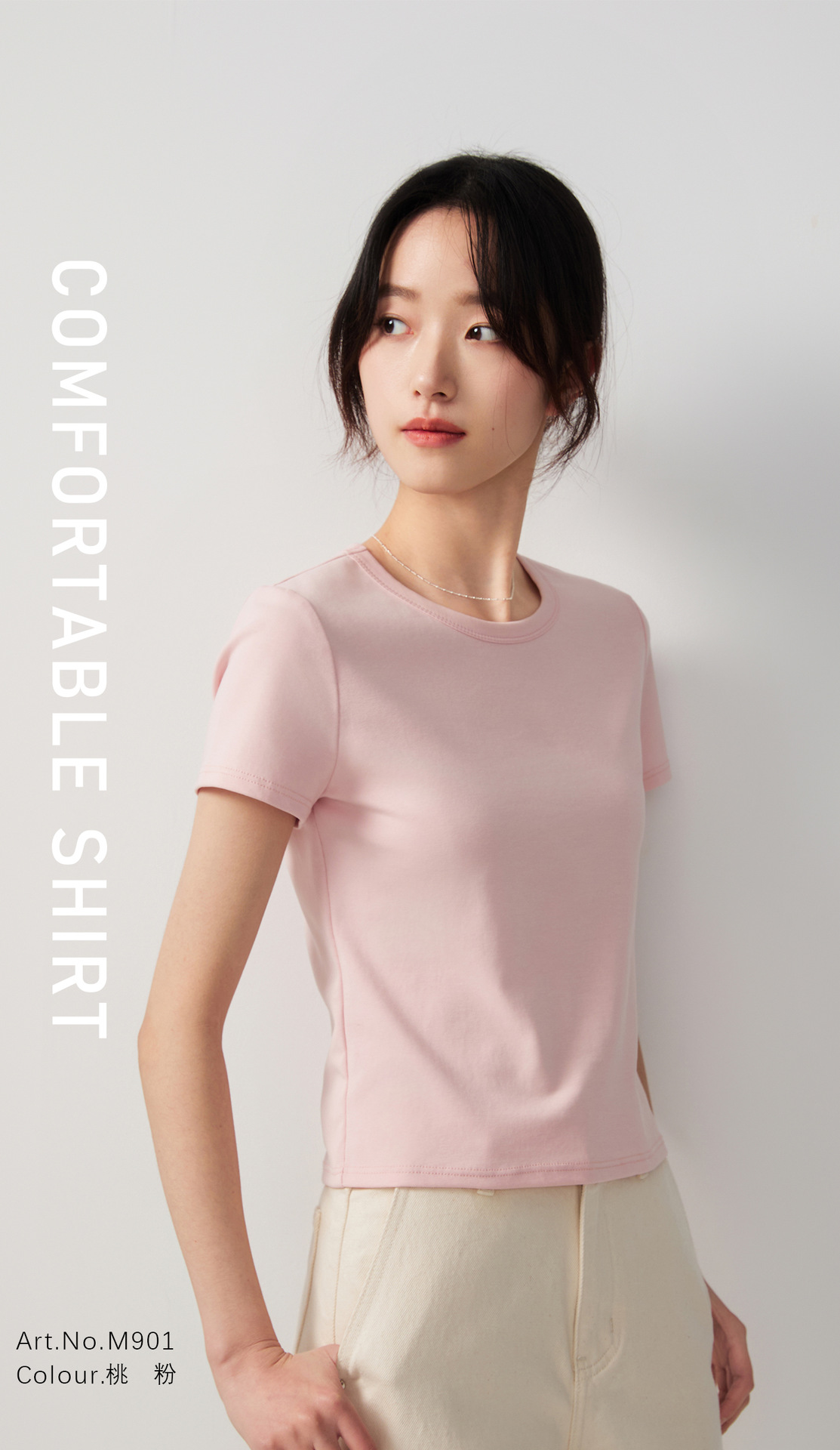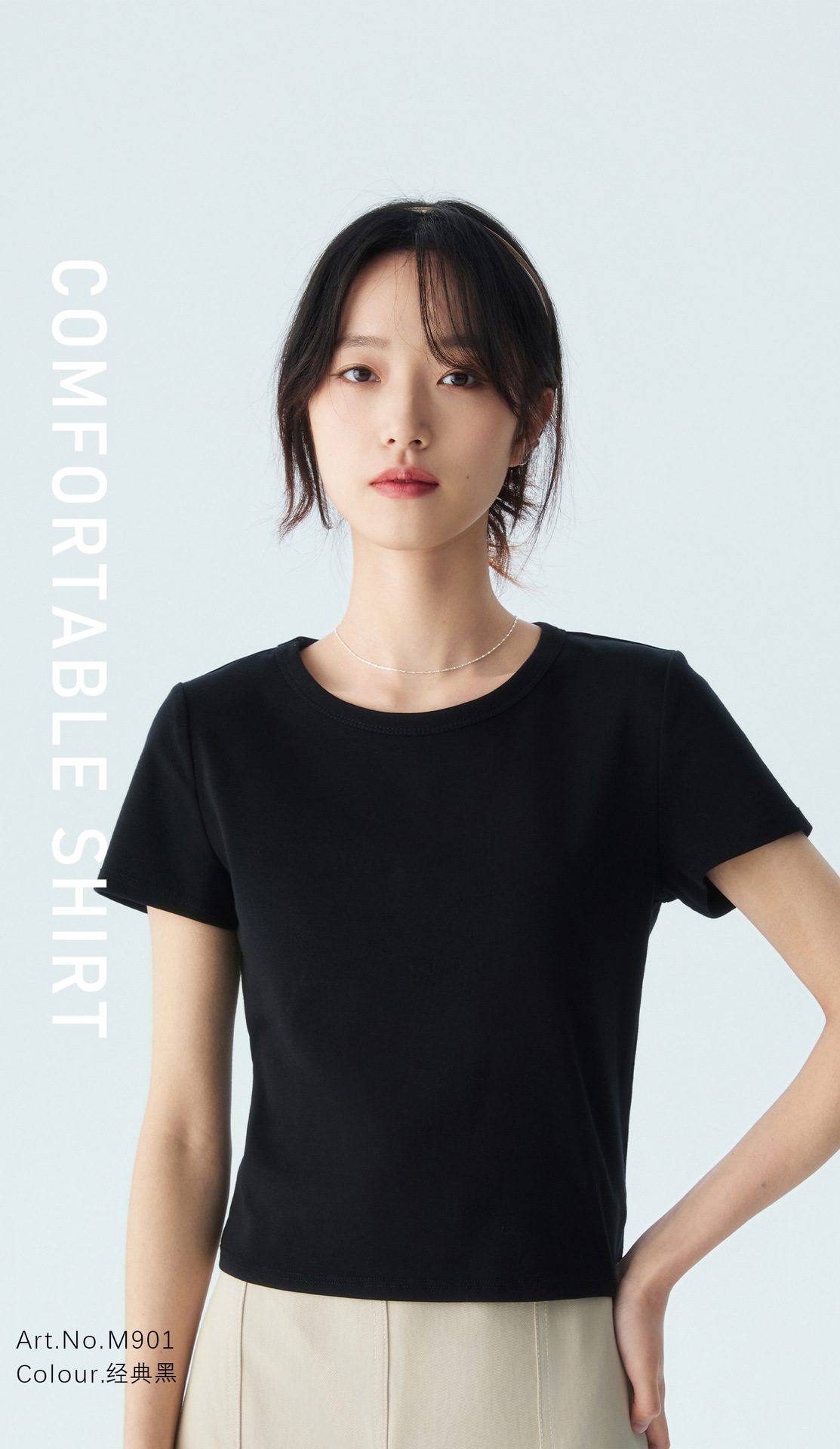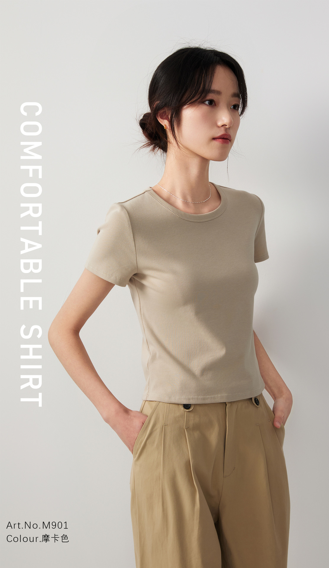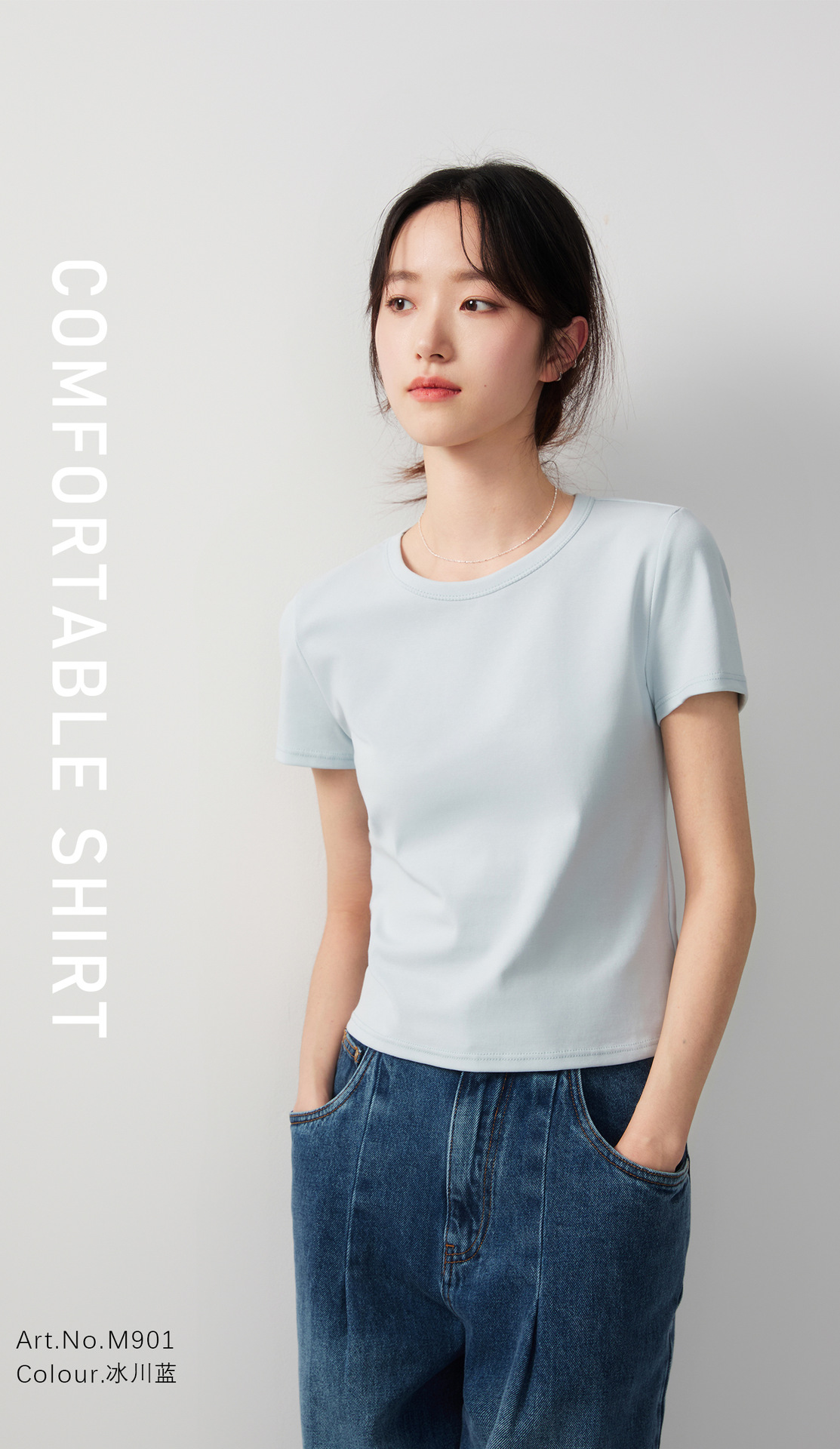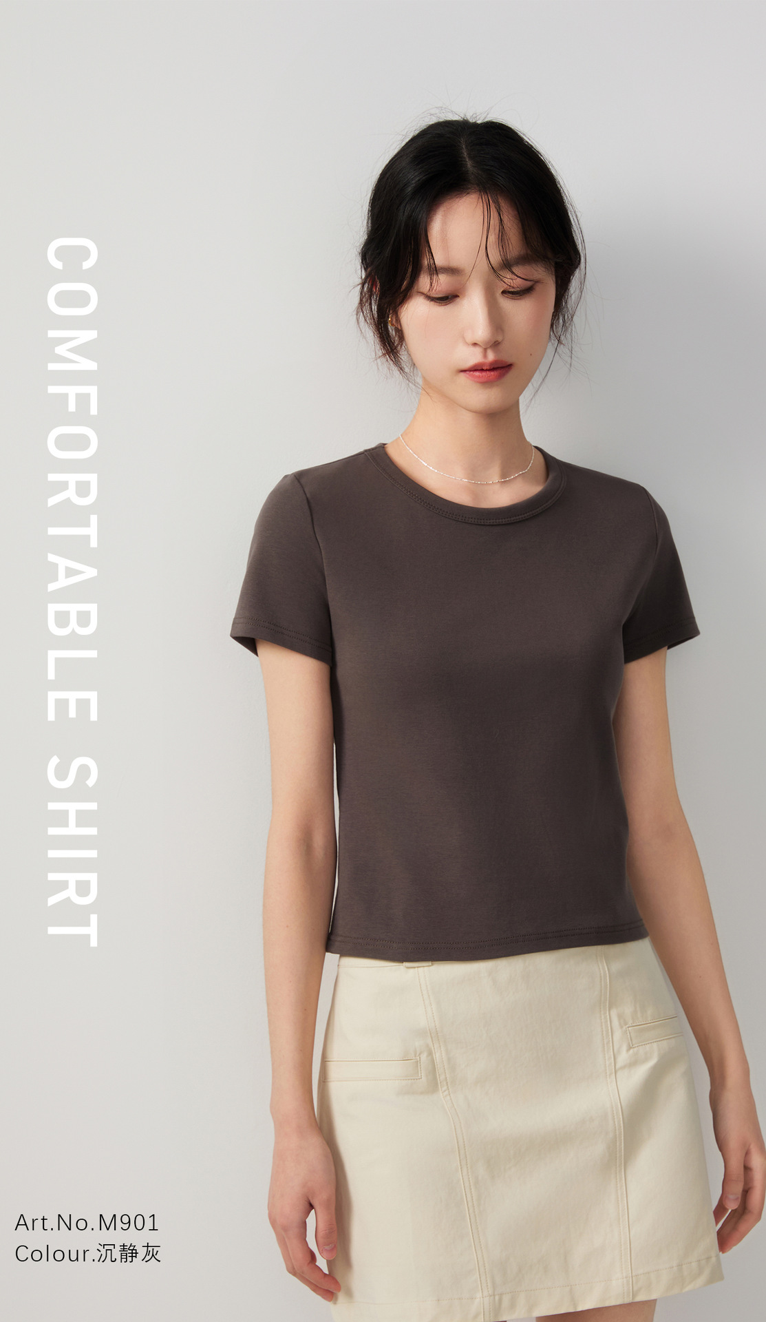 2025 봄과 여름 간단한 패션 단색 짧은 소매 어깨 둥근 목 탑 티셔츠