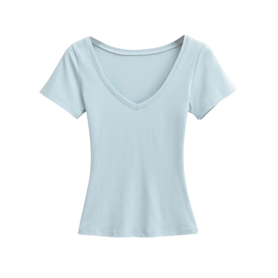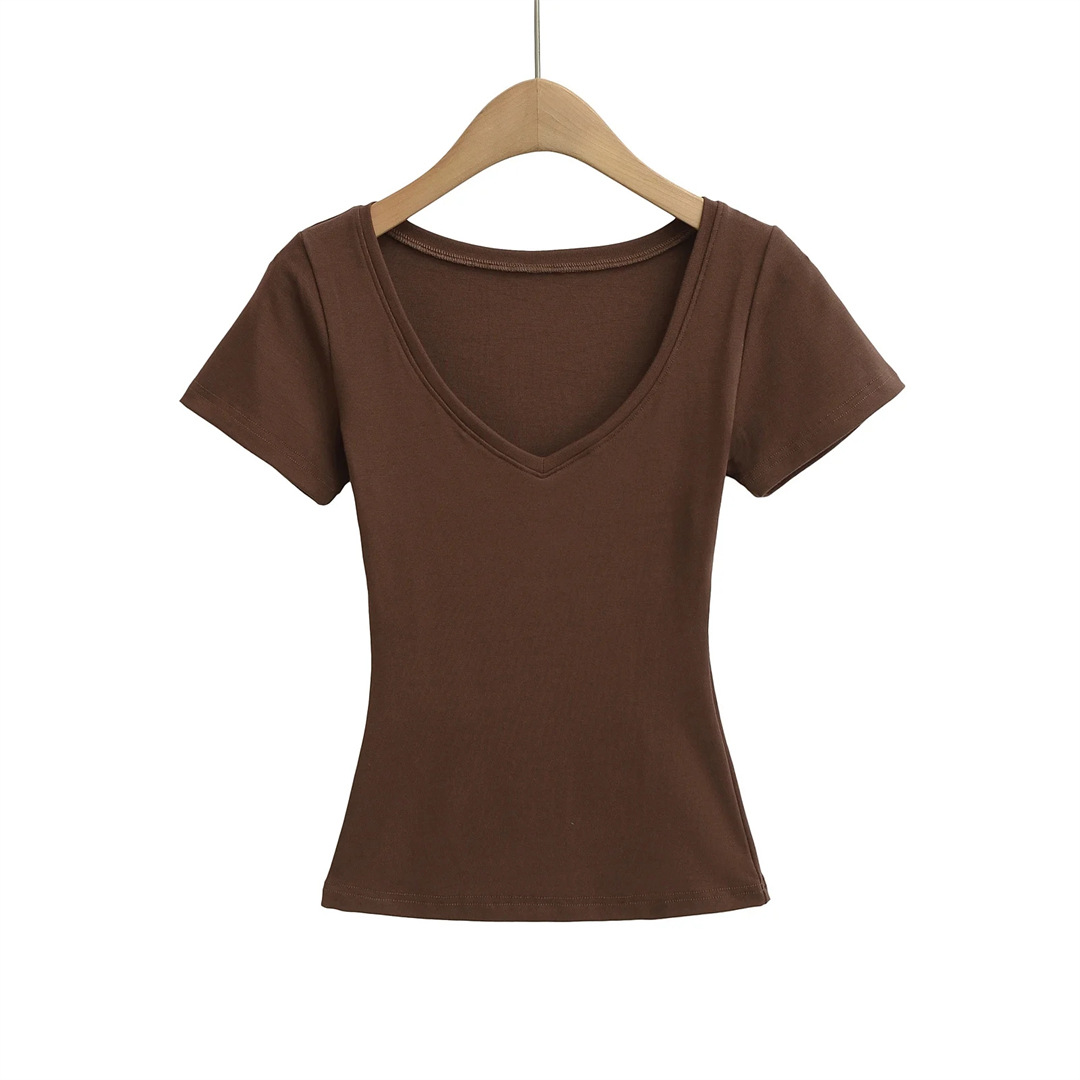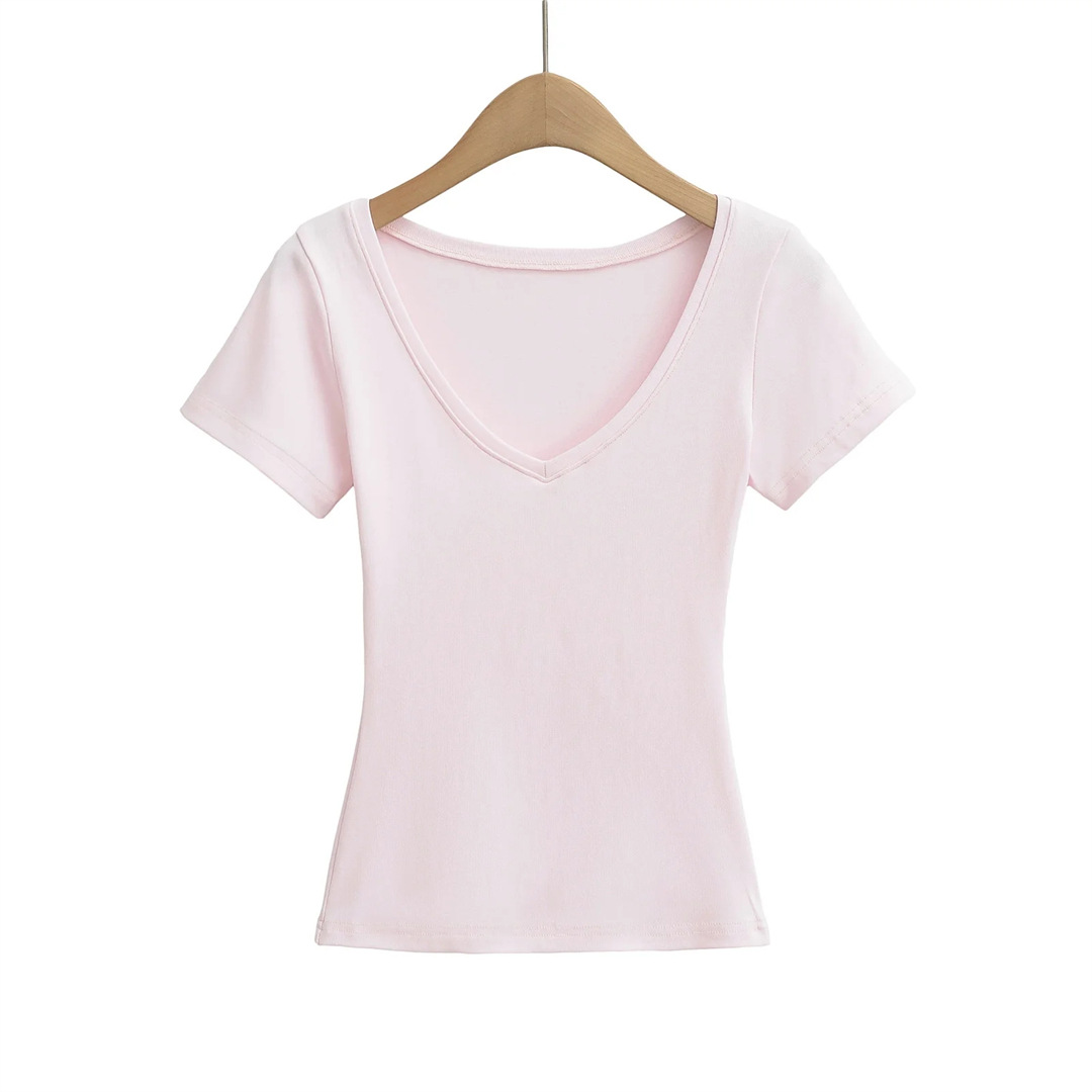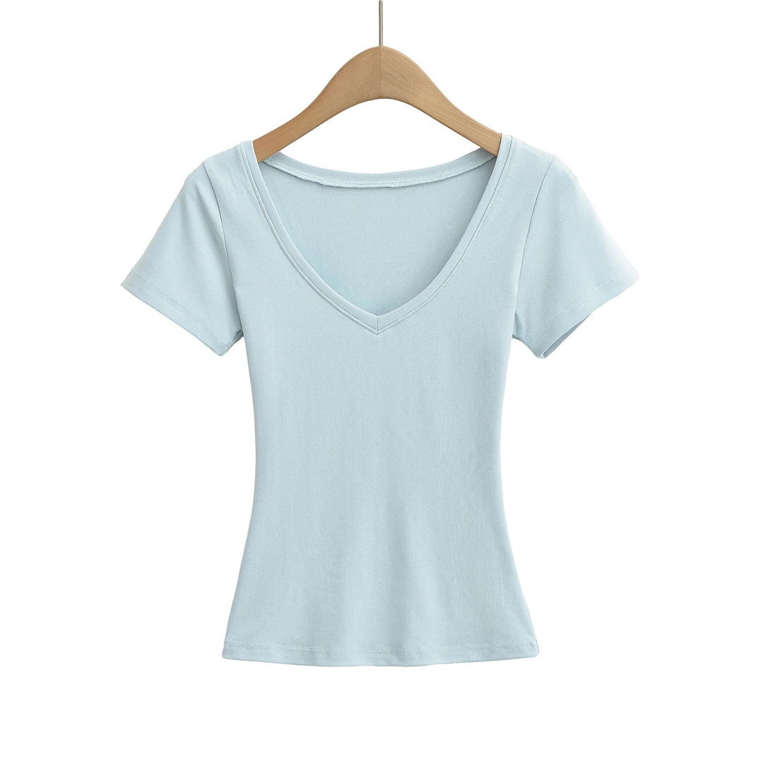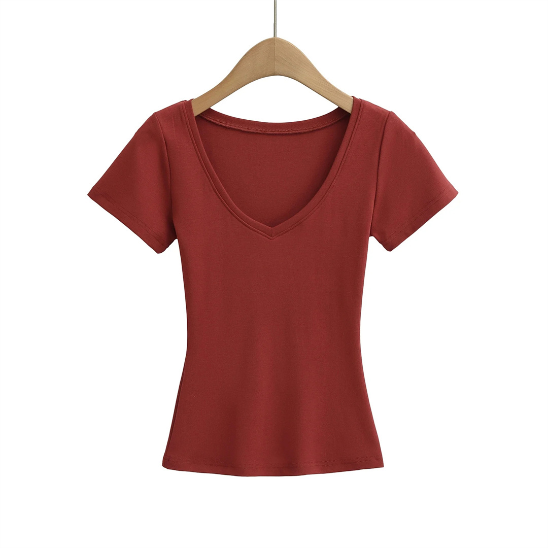 아메리칸 레트로 핫걸 베이직 브이넥 슬림 반팔 티셔츠 여성 여름 퓨어 러스티 스타일 모래시계 허리 섹시 탑