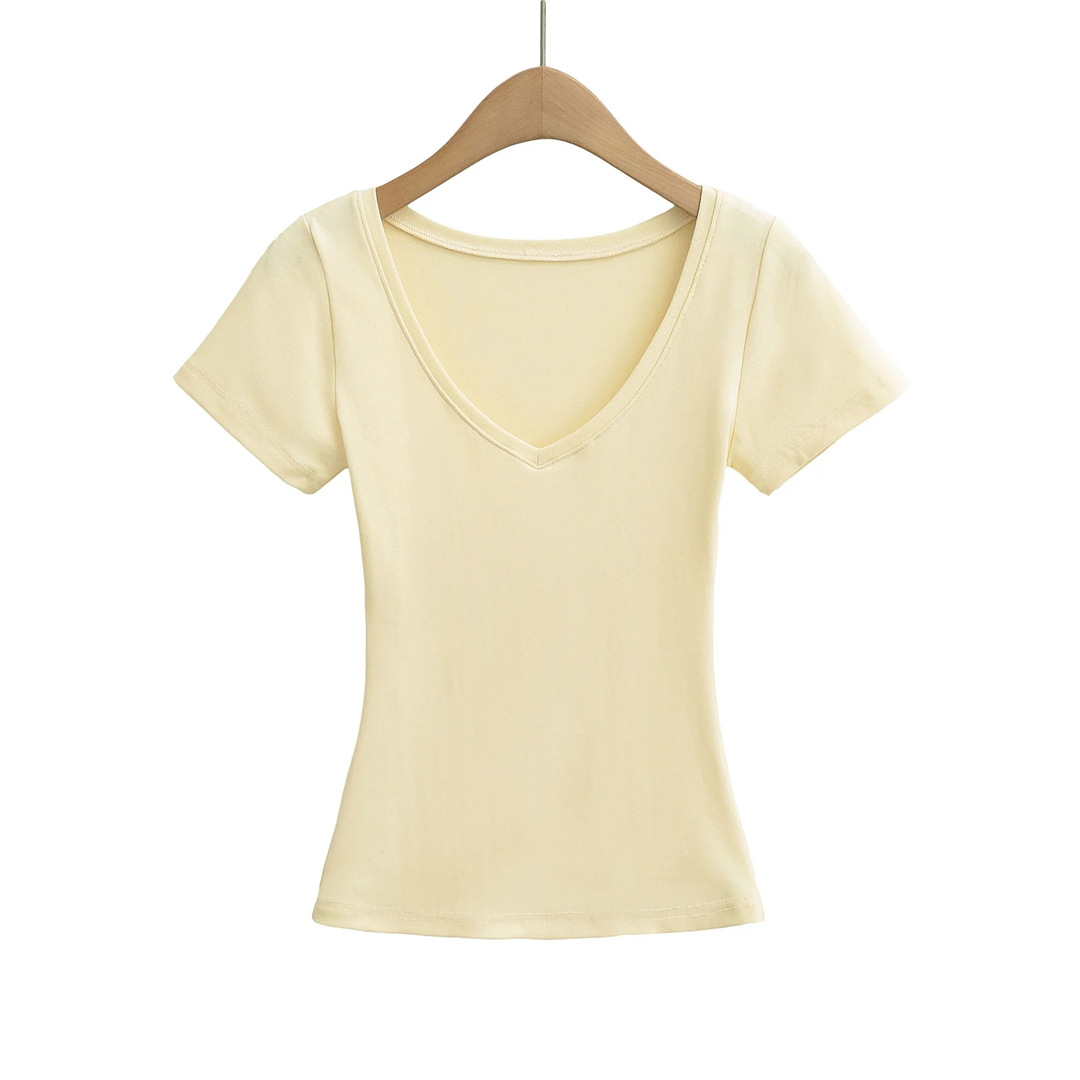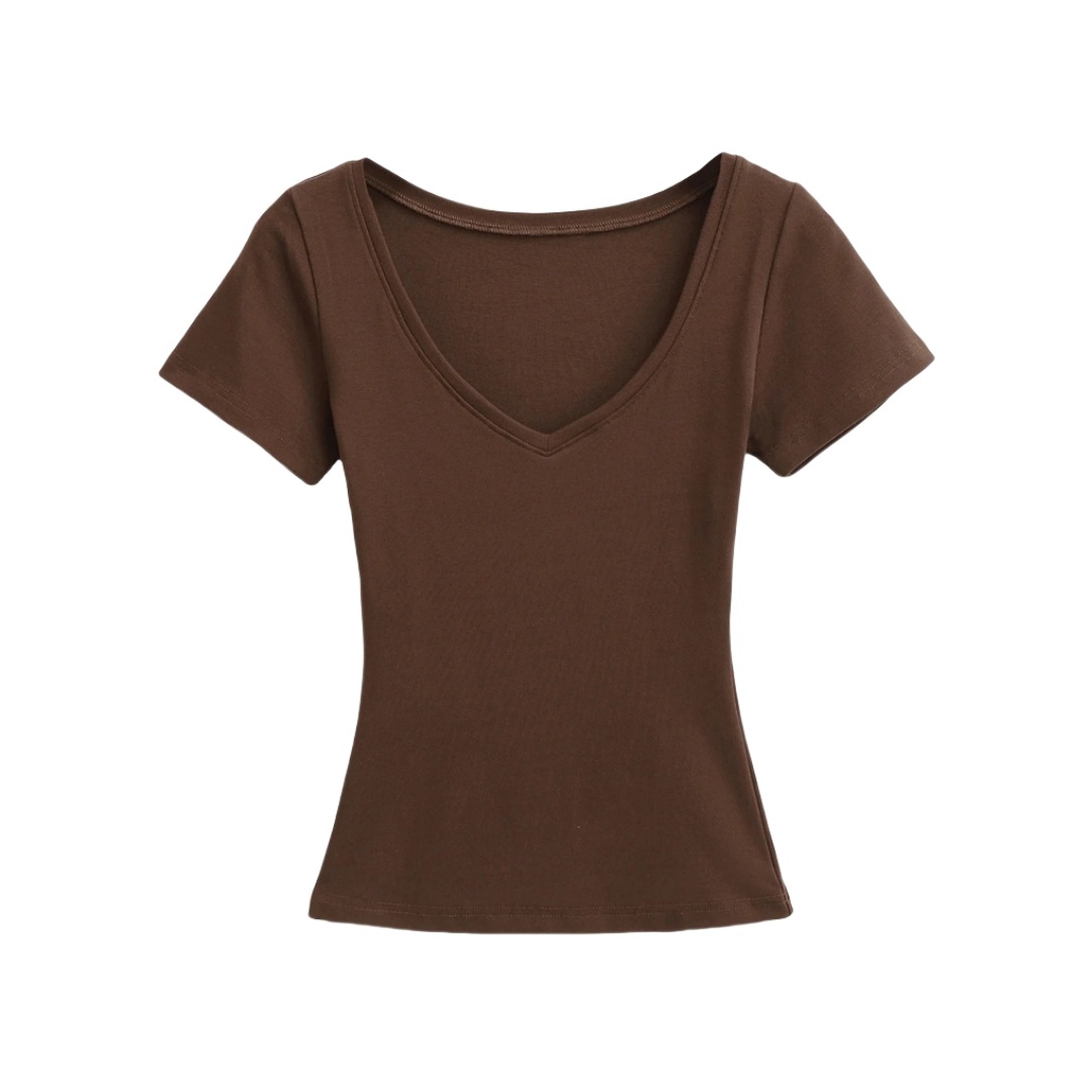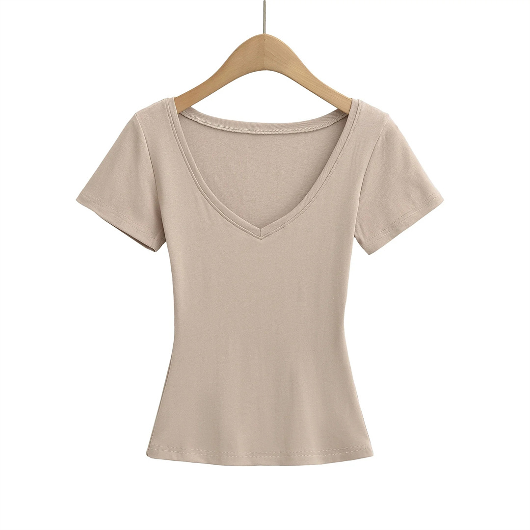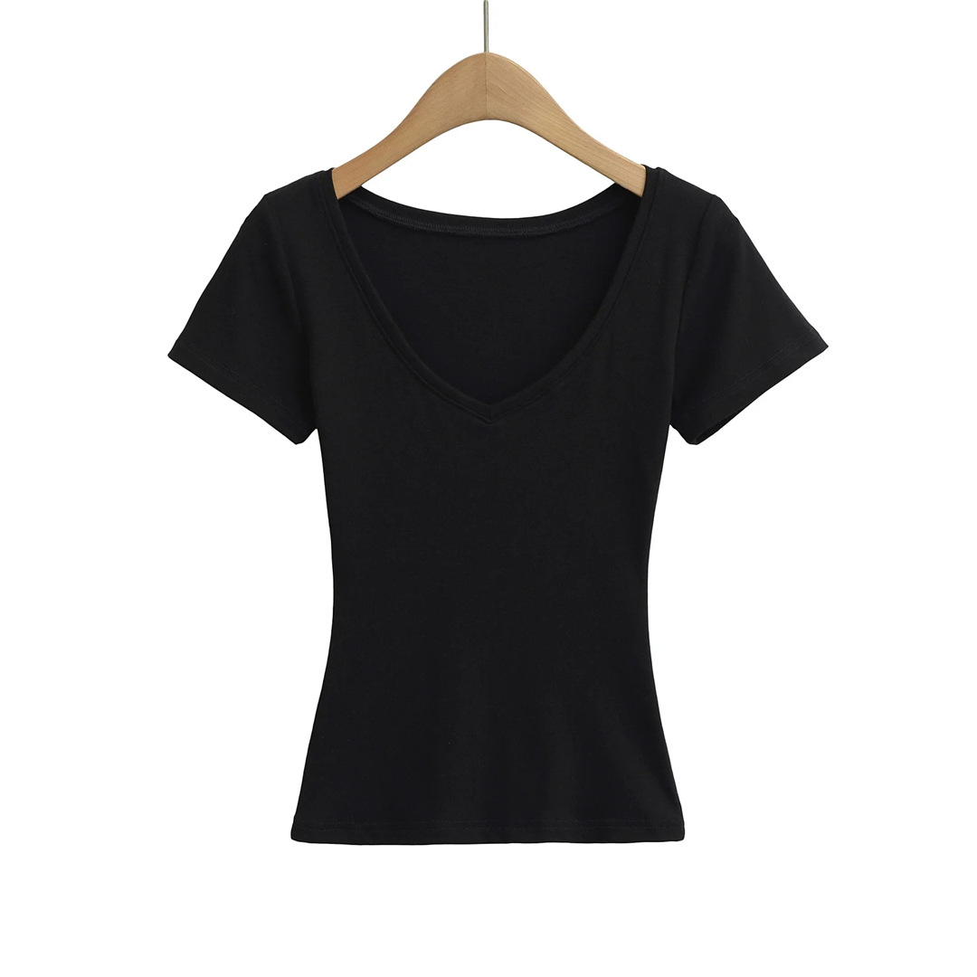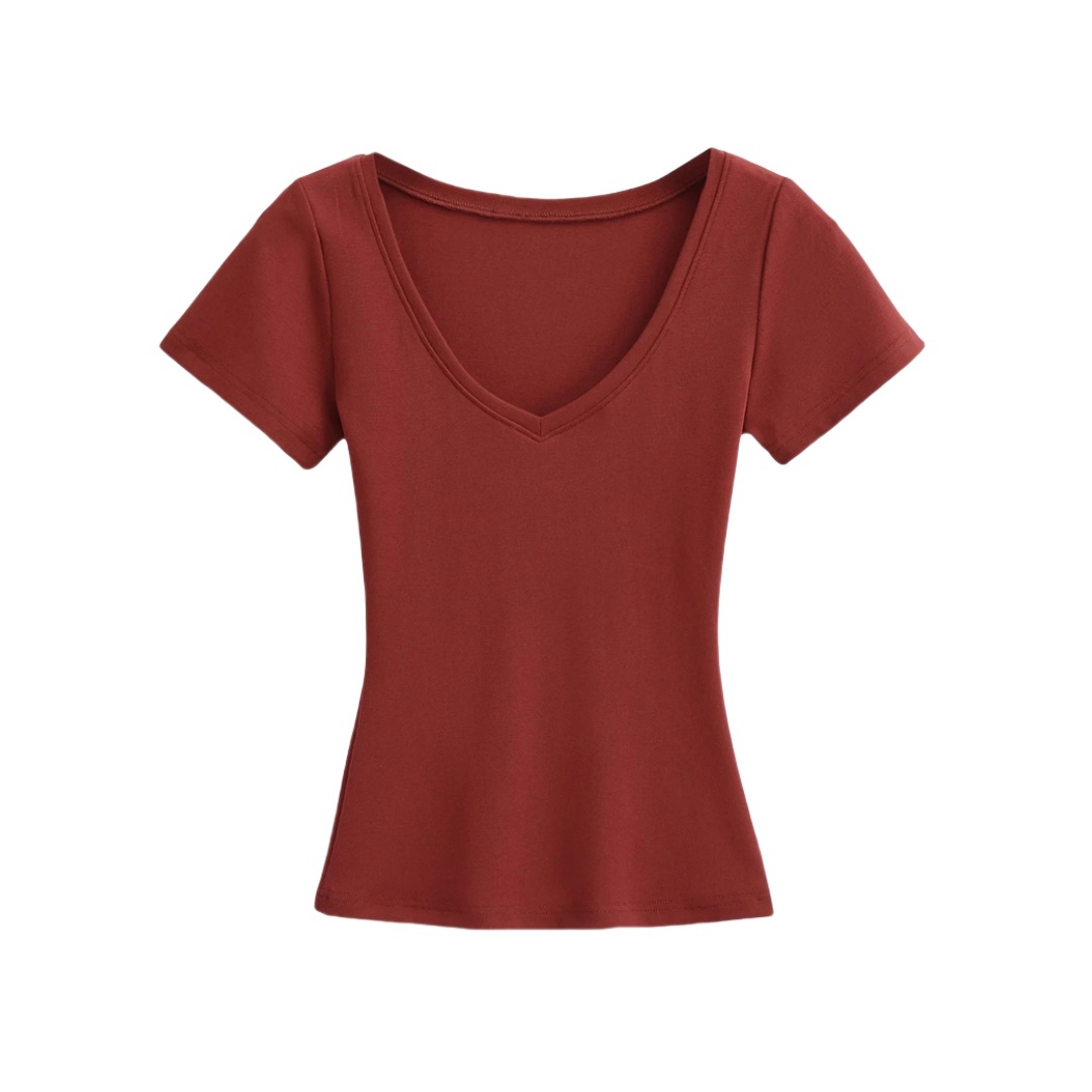 아메리칸 레트로 핫걸 베이직 브이넥 슬림 반팔 티셔츠 여성 여름 퓨어 러스티 스타일 모래시계 허리 섹시 탑